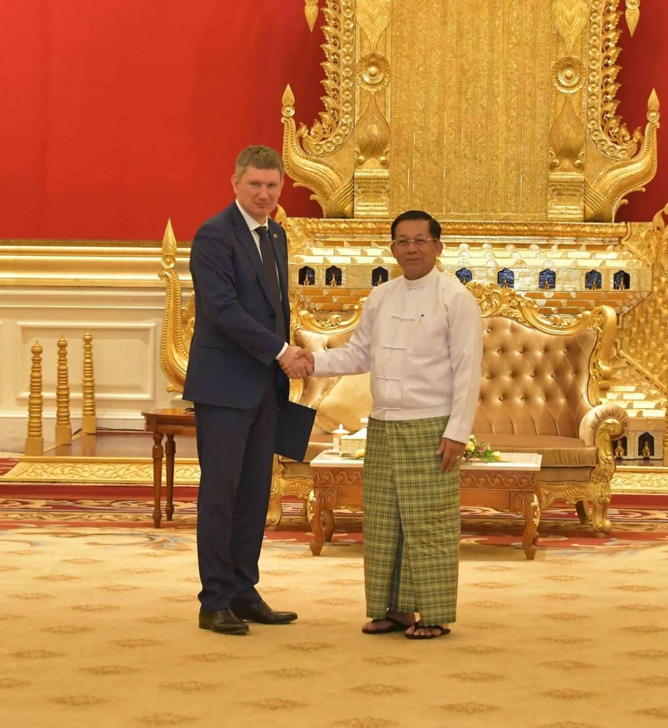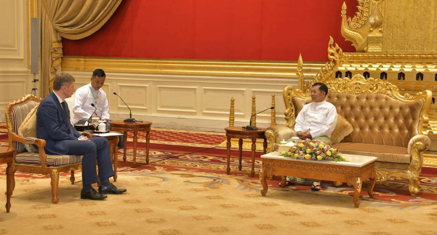 နိုင်ငံတော်စီမံအုပ်ချုပ်ရေးကောင်စီဥက္ကဋ္ဌ နိုင်ငံတော်ဝန်ကြီးချုပ် ဗိုလ်ချုပ်မှူးကြီး မင်းအောင်လှိုင်ထံ ရုရှားဖက်ဒရေးရှင်းနိုင်ငံ၊ စီးပွားရေးဖွံ့ဖြိုးတိုးတက်မှုဝန်ကြီးဌာနဝန်ကြီး H.E. Mr. Maxim RESHETNIKOV က ယနေ့နေ့လယ်ပိုင်းတွင် နေပြည်တော်ရှိ နိုင်ငံတော်စီမံအုပ်ချုပ်ရေးကောင်စီဥက္ကဋ္ဌရုံး သံတမန်ဆောင်ဧည့်ခန်းမ၌ လာရောက် ဂါရဝပြုတွေ့ဆုံသည်။