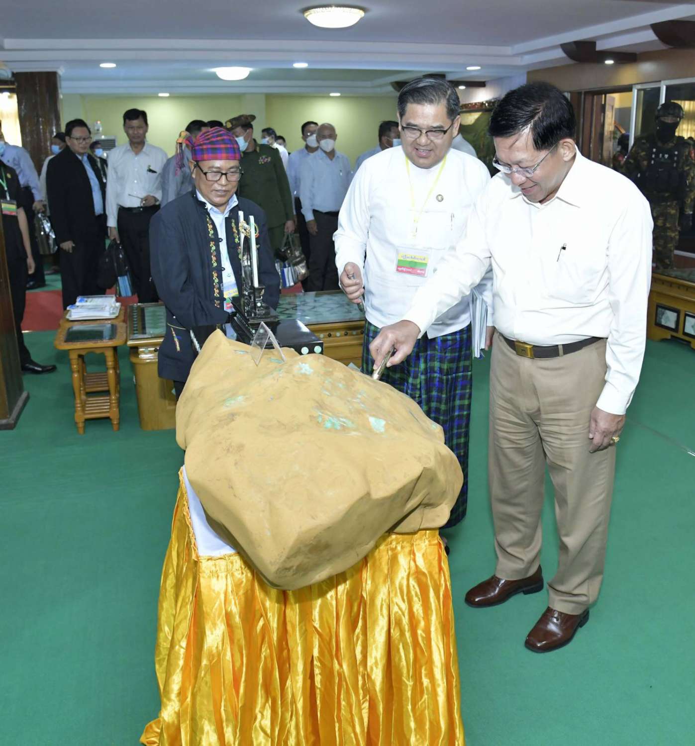 ထို့နောက် နိုင်ငံတော်စီမံအုပ်ချုပ်ရေးကောင်စီဥက္ကဋ္ဌ နိုင်ငံတော်ဝန်ကြီးချုပ်သည် ခင်းကျင်းပြသထားသည့် သယံဇာတတွင်းထွက်ထုတ်ကုန်များ၊ စားသောက်ကုန်၊ လူသုံးကုန်၊ စက်မှုလက်မှုထုတ်ကုန်၊ ရိုးရာလက်မှုထုတ်ကုန်များ၊ အဝတ်အထည်များ၊ တိုင်းရင်းဆေးများ စသည့်ထုတ်ကုန်ပစ္စည်းများ ခင်းကျင်းပြသထားရှိမှုများကို ပြကွက်တစ်ခုချင်းစီအလိုက် စိတ်ဝင်တစားဖြင့်လေ့လာခဲ့ပြီး ဈေးကွက်ရရှိမှုအခြေအနေများကို မေးမြန်းဆွေးနွေးရာလုပ်ငန်းအလိုက် စီးပွားရေးလုပ်ငန်းရှင်များက လိုက်လံရှင်းလင်းတင်ပြခဲ့ကြကြောင်း သတင်းရရှိသည်။