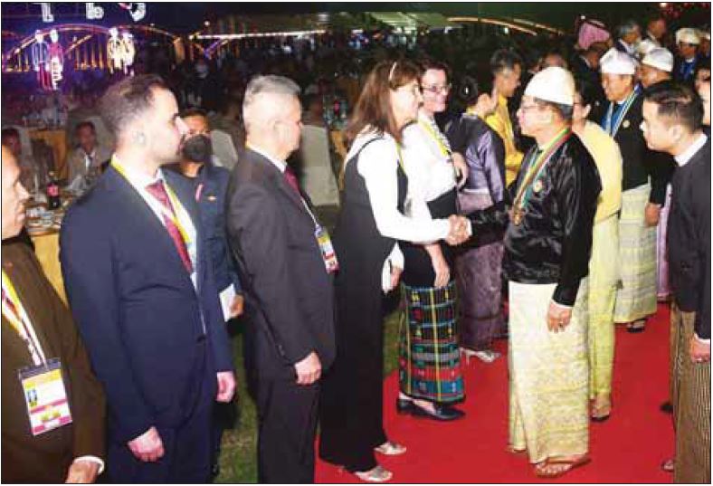 ထို့နောက် နိုင်ငံတော်စီမံအုပ်ချုပ်ရေးကောင်စီဥက္ကဋ္ဌ နိုင်ငံတော်ဝန်ကြီးချုပ် ဗိုလ်ချုပ်မှူးကြီး သတိုးမဟာသရေစည်သူ သတိုးသီရိသုဓမ္မ မင်းအောင်လှိုင်နှင့်ဇနီး ဒေါ်ကြူကြူလှတို့သည် ညစာစားပွဲအခမ်းအနား ကျင်းပရာနေရာသို့ ရောက်ရှိကြပြီး နိုင်ငံတော်စီမံအုပ်ချုပ်ရေးကောင်စီ   ဒုတိယဥက္ကဋ္ဌ ဒုတိယဝန်ကြီးချုပ်နှင့် ဇနီးတို့နှင့်အတူ နိုင်ငံရေးပါတီများမှ ဥက္ကဋ္ဌများနှင့် ကိုယ်စားလှယ်များ၊ နိုင်ငံခြားသံရုံးများမှ သံအမတ်ကြီးများနှင့် သံရုံးတာဝန်ခံများ၊ ဂုဏ်ထူးဆောင်          ကောင်စစ်ဝန်များနှင့် အထူးဖိတ်ကြားထားသည့် ဧည့်သည်တော်များကို ရင်းရင်းနှီးနှီး နှုတ်ဆက်သည်။