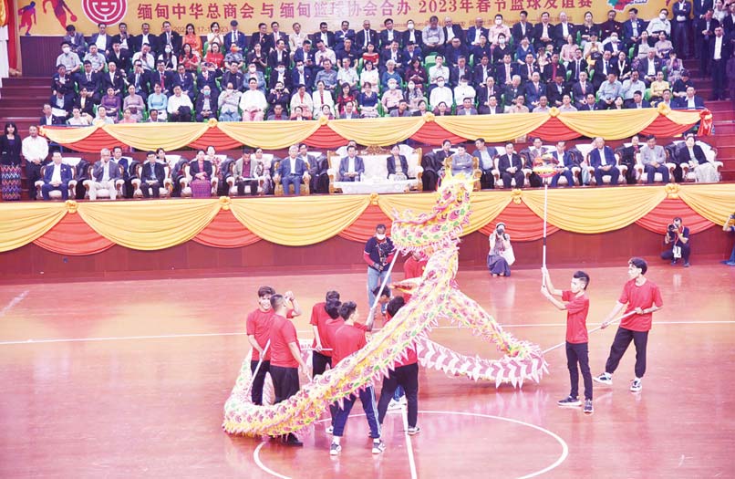 ဦးစွာ နိုင်ငံတော်စီမံအုပ်ချုပ်ရေးကောင်စီဥက္ကဋ္ဌ နိုင်ငံတော်ဝန်ကြီးချုပ်နှင့် ဇနီးတို့အား မြန်မာနိုင်ငံဆိုင်ရာ တရုတ်နိုင်ငံသံအမတ်ကြီး H.E. Mr. Chen Hai၊ မြန်မာနိုင်ငံ တရုတ်ကုန်သည်များအသင်းချုပ်ဥက္ကဋ္ဌ ဦးအိုင်ထွန်း၊ မြန်မာနိုင်ငံ ဘတ်စကက်ဘောအဖွဲ့ချုပ် ဥက္ကဋ္ဌနှင့် တာဝန်ရှိသူများက လှိုက်လှဲနွေးထွေးစွာ ကြိုဆိုနှုတ်ဆက်ကြသည်။ ထို့နောက် (၂၀၂၃) ခုနှစ် တရုတ်နှစ်သစ်ကူးပွဲတော်အထိမ်းအမှတ် ချစ်ကြည်ရေး ဘတ်စကက်ဘောပြိုင်ပွဲ ပိတ်ပွဲအခမ်းအနားကို စတင်ကျင်းပပြုလုပ်ရာ ပြိုင်ပွဲဝင်အသင်းများမှ အားကစားသမားများ၊ တရုတ်ရိုးရာ နဂါးအကအဖွဲ့များနှင့် ခြင်္သေ့အကအဖွဲ့များ၊ ဘင်ခရာအဖွဲ့များ၊ ပန်းပွားအက အဖွဲ့များက နိုင်ငံတော်စီမံအုပ်ချုပ်ရေးကောင်စီဥက္ကဋ္ဌ နိုင်ငံတော်ဝန်ကြီးချုပ်အား ဘင်ခရာ တီးမှုတ်၍ အလေးပြုကြသည်။