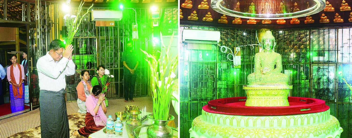 ဦးစွာ  နိုင်ငံတော်စီမံအုပ်ချုပ်ရေးကောင်စီဥက္ကဋ္ဌ နိုင်ငံတော်ဝန်ကြီးချုပ်နှင့် ဇနီး၊ အဖွဲ့ဝင်များအား ဂေါပကအဖွဲ့ဝင်များက ကြိုဆိုနှုတ်ဆက်ကြသည်။ ယင်းနောက် နိုင်ငံတော်စီမံအုပ်ချုပ်ရေးကောင်စီဥက္ကဋ္ဌ နိုင်ငံတော်ဝန်ကြီးချုပ်နှင့် ဇနီး၊ အဖွဲ့ဝင်များသည် စေတီတော်မြတ်ကြီးအတွင်းရှိ ဗုဒ္ဓရုပ်ပွားတော်မြတ်အား ဖူးမြော်ကြည်ညိုကာ ပန်း၊ ရေချမ်း၊ ဆီမီးများ ကပ်လှူပူဇော်ပြီး နိုင်ငံတော်စီမံအုပ်ချုပ်ရေးကောင်စီဥက္ကဋ္ဌ နိုင်ငံတော်ဝန်ကြီးချုပ်က ဘုရားကြီးရှိ ဧည့်သည်တော်မှတ်တမ်းစာအုပ်တွင် မှတ်တမ်းတင်လက်မှတ်ရေးထိုးသည်။