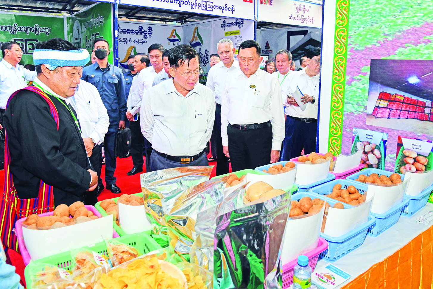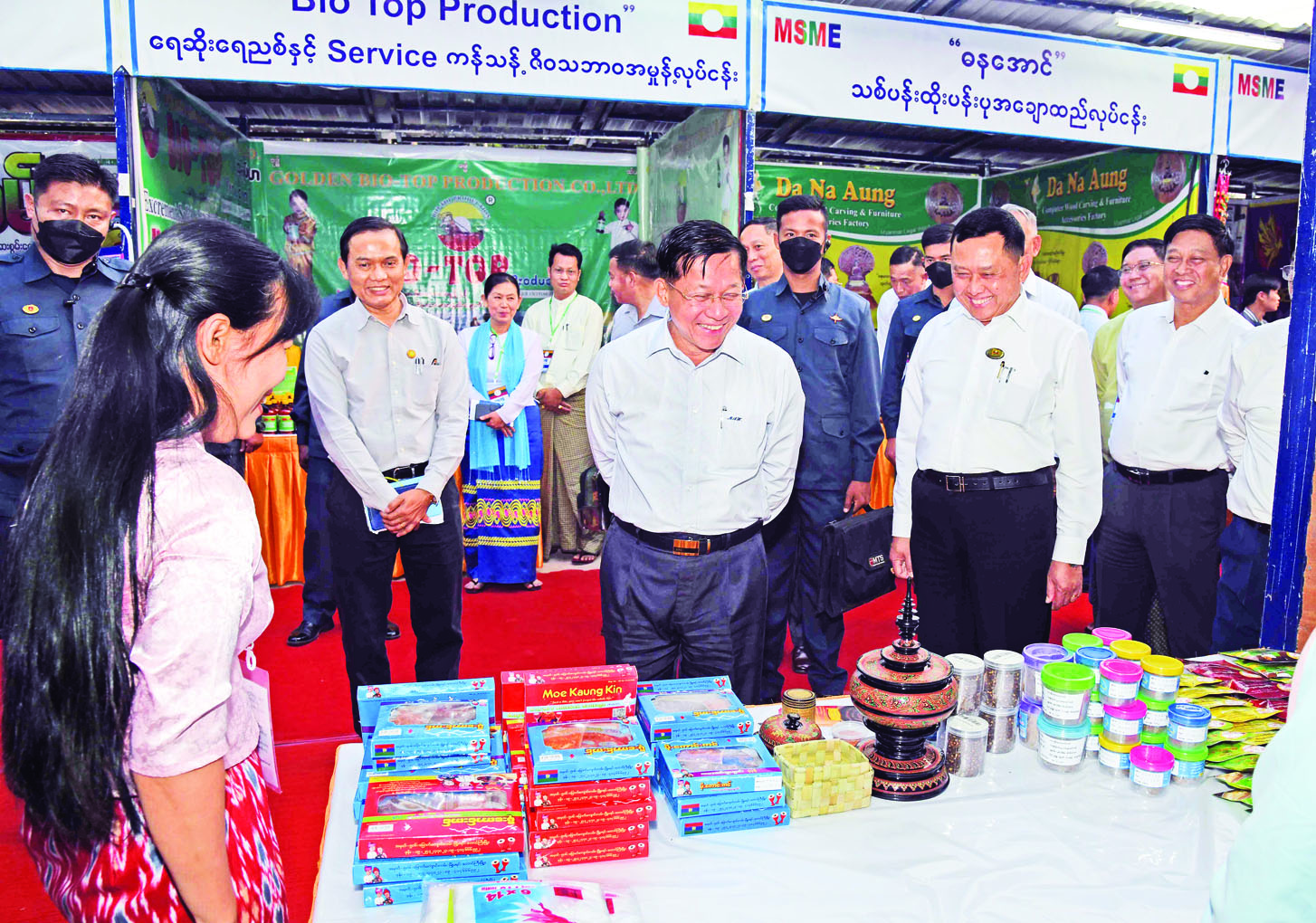 ယင်းနောက် နိုင်ငံတော်စီမံအုပ်ချုပ်ရေးကောင်စီဥက္ကဋ္ဌ နိုင်ငံတော်ဝန်ကြီးချုပ်သည် ခင်းကျင်းပြသထားသည့် ဒေသထွက်ကုန်ပစ္စည်းများ၊ စားသောက်ကုန်၊ လူသုံးကုန်၊ စက်မှုလက်မှုထုတ်ကုန်၊ ရိုးရာလက်မှုထုတ်ကုန်များ၊ အဝတ်အထည်များ စသည့် ထုတ်ကုန်ပစ္စည်းများ ခင်းကျင်းပြသထားရှိမှုများကို ပြကွက်တစ်ခုချင်းစီအလိုက် စိတ်ဝင်တစားဖြင့်လေ့လာခဲ့ပြီး ဈေးကွက်ရရှိမှုအခြေအနေများကို မေးမြန်း ဆွေးနွေးရာလုပ်ငန်းအလိုက် စီးပွားရေးလုပ်ငန်းရှင်များက လိုက်လံရှင်းလင်းတင်ပြခဲ့ကြောင်း သတင်းရရှိသည်။