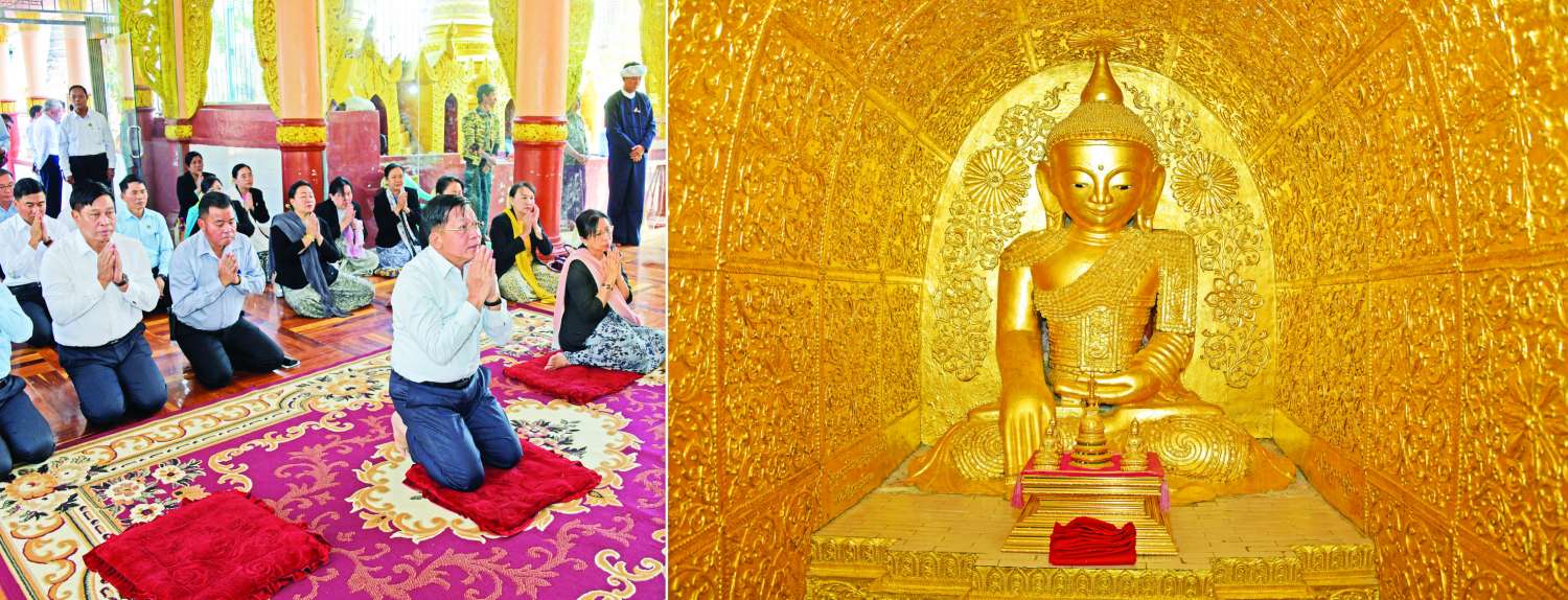 ဦးစွာ နိုင်ငံတော်စီမံအုပ်ချုပ်ရေးကောင်စီဥက္ကဋ္ဌ နိုင်ငံတော်ဝန်ကြီးချုပ်နှင့်အဖွဲ့ဝင်များအား ရွှေဘုန်းပွင့်စေတီတော်မြတ်ကြီး ဂေါပကအဖွဲ့ အလုပ်အမှုဆောင်အဖွဲ့ဥက္ကဋ္ဌ ဦးဝင်းအောင်နှင့်အဖွဲ့ဝင်များက ကြိုဆိုနှုတ်ဆက်ကြသည်။ ထို့နောက် နိုင်ငံတော်စီမံအုပ်ချုပ်ရေးကောင်စီဥက္ကဋ္ဌ နိုင်ငံတော်ဝန်ကြီးချုပ်နှင့် ဇနီး၊ အဖွဲ့ဝင်များသည် စေတီတော်မြတ်ကြီးအား ပန်းရေချမ်းဆီမီးကပ်လှူပူဇော်ပြီး စေတီတော်မြတ်ကြီးအား လက်ယာရစ်လှည့်လည်ဖူးမြော်ကြည်ညိုကြသည်။