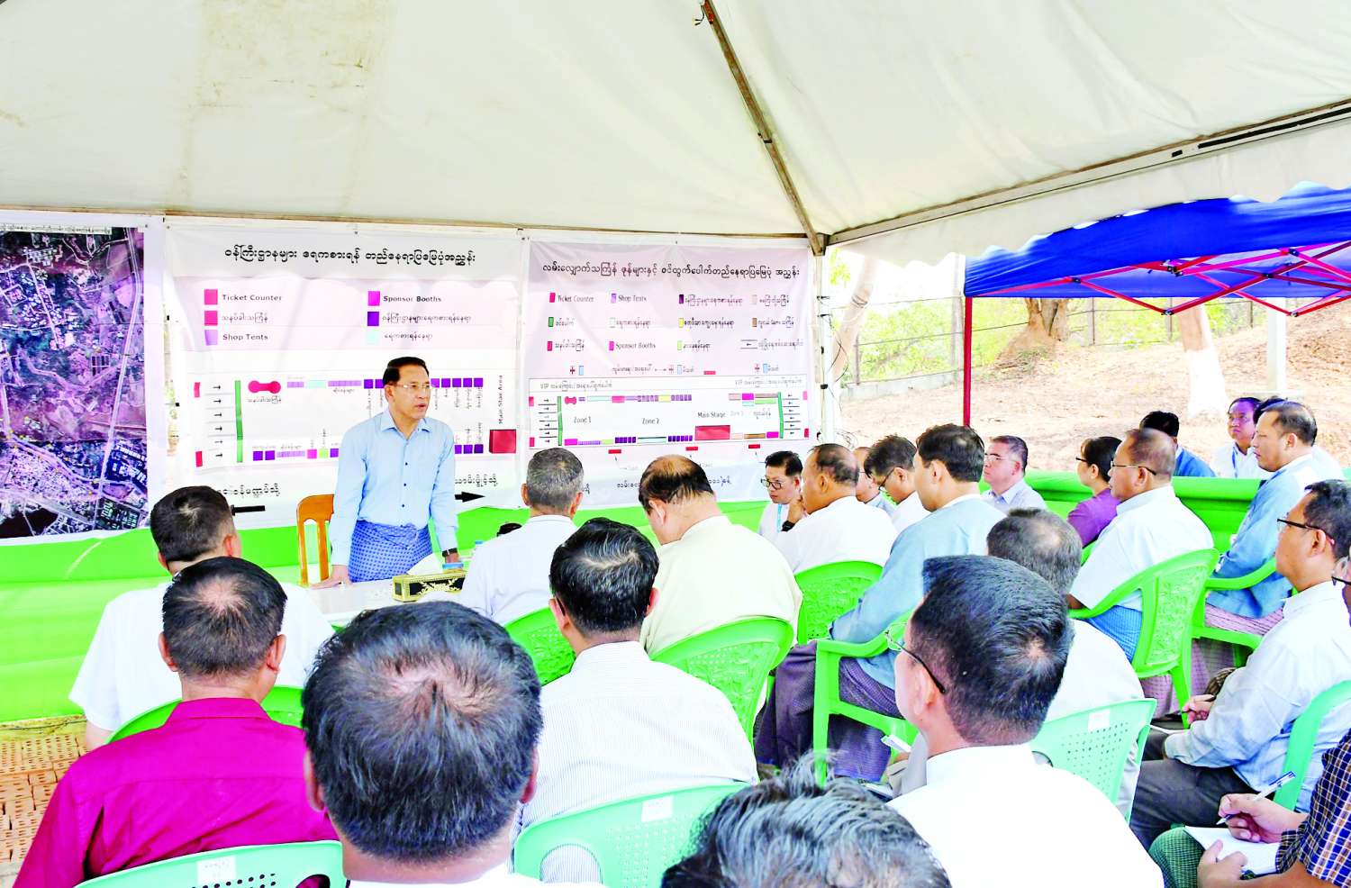 ရှေးဦးစွာ ပြည်ထောင်စုဝန်ကြီးသည် နေပြည်တော်လမ်းလျှောက်သင်္ကြန် ဘေးကင်းလုံခြုံစွာနှင့် စည်ကားသိုက်မြိုက်စွာ ကျင်းပနိုင်ရေးအတွက် သက်ဆိုင်ရာကဏ္ဍအလိုက် ပါဝင်ဆောင်ရွက် နေကြသည့် ဝန်ကြီးဌာနများနှင့် Brilliant Aura Co.,Ltd. တို့မှ တာဝန်ရှိသူများနှင့် နေပြည်တော် လမ်းလျှောက်သင်္ကြန် ကွပ်ကဲ ရေးမဏ္ဍပ်၌ တွေ့ဆုံသည်။