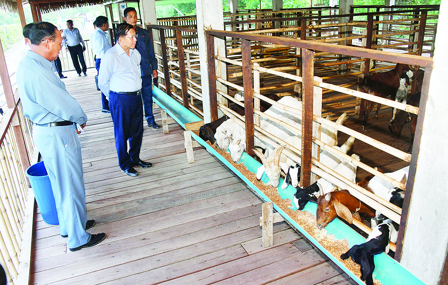ယင်းနောက် နိုင်ငံတော်စီမံအုပ်ချုပ်ရေးကောင်စီဥက္ကဋ္ဌ နိုင်ငံတော်ဝန်ကြီးချုပ်နှင့်အဖွဲ့ ဝင်များသည် စိုက်ပျိုးမွေးမြူရေး ခြံအတွင်းဥစားကြက်များမွေးမြူ ထားရှိမှု၊ ငါးမွေးမြူထားရှိမှုနှင့် ဒူးရင်းပင်အပါအဝင် နှစ်ရှည်သီးနှံပင်များစိုက်ပျိုးထားရှိမှု အခြေအနေများကို လှည့်လည်ကြည့်ရှု ပြီးတာဝန်ရှိသူများ၏ တင်ပြချက်များအပေါ် သိရှိလိုသည်များမေးမြန်းပြီး လိုအပ်သည်များကို အကြံပြုဆွေးနွေးပြောကြား သည်။
