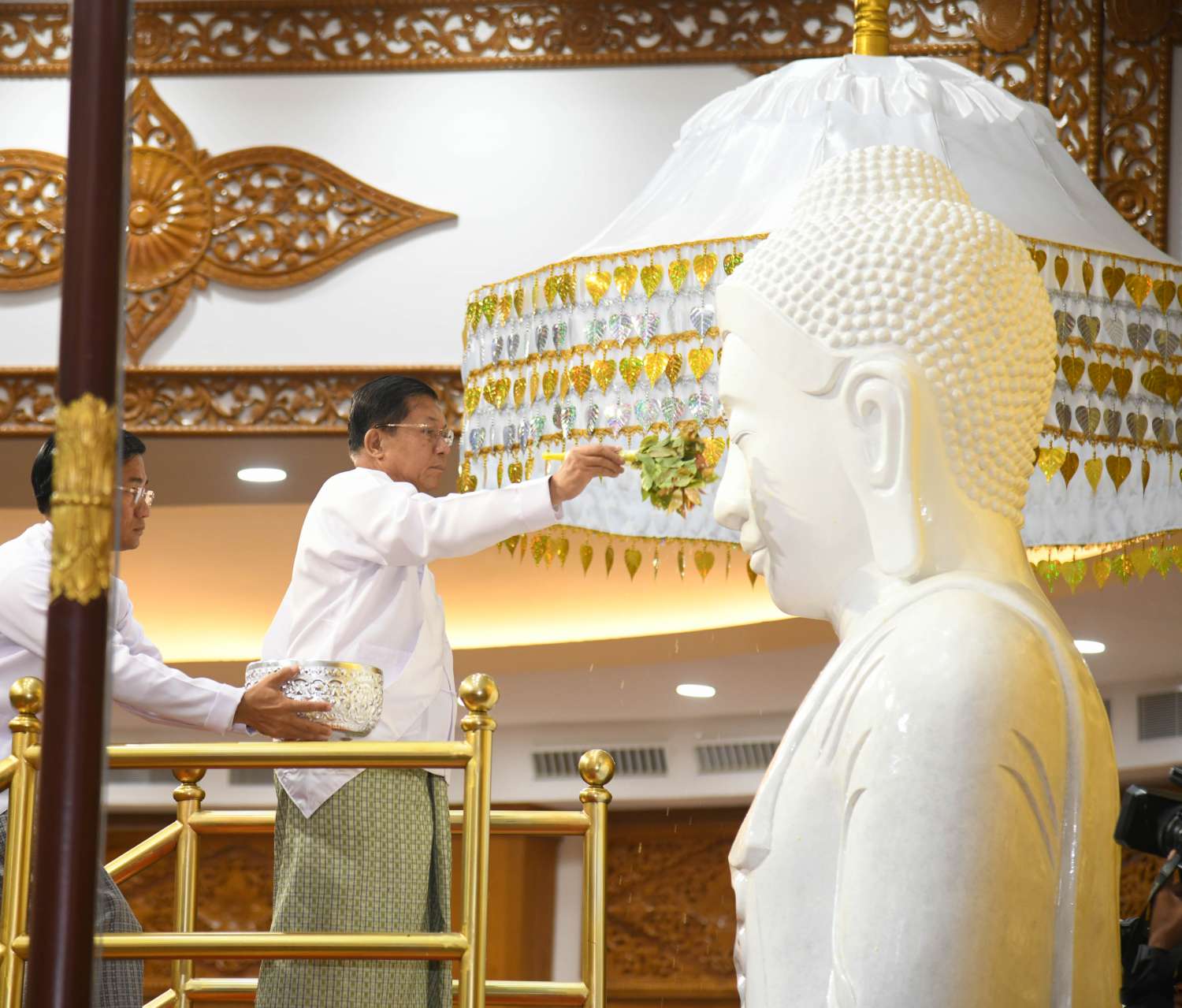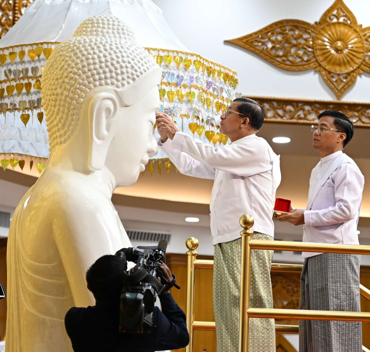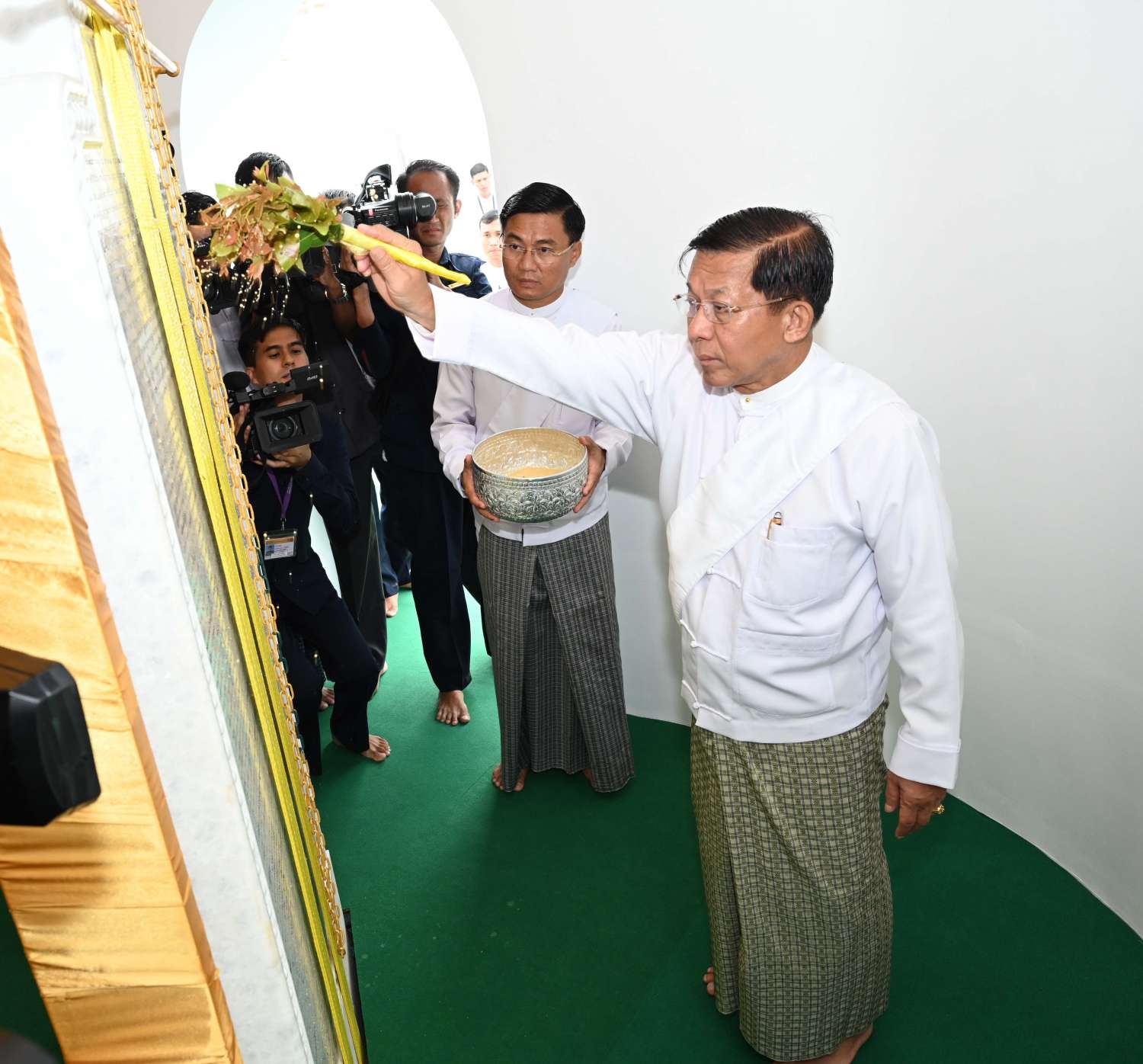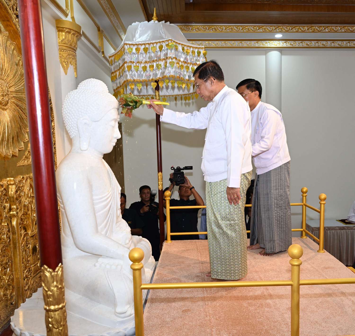ကမ္ဘာပေါ်ရှိ ထိုင်တော်မူကျောက်ဆစ်ဗုဒ္ဓရုပ်ပွားတော်များအနက် ဉာဏ်တော်အမြင့်ဆုံးဖြစ်လာမည့် မာရဝိဇယဗုဒ္ဓ ရုပ်ပွားတော်မြတ်ကြီးတည်ဆောက်လျက်ရှိသည့် ပြည်ထောင်စုနယ်မြေ နေပြည်တော်၊ ဒက္ခိဏသီရိမြို့နယ်ရှိ မာရဝိဇယ ဗုဒ္ဓဥယျာဉ် ဝတ္ထုကံတော် အဂ္ဂါဓိပတိ သာသနာ့ဗိမာန်တော် မင်္ဂလာမော်ကွန်းကမ္ဗည်းဖွင့်လှစ်ခြင်း၊ ဗုဒ္ဓရုပ်ပွားတော်မြတ်များအား ဥဏ္ဏလုံမွေးရှင်တော် စီသွင်းပူဇော်ခြင်းနှင့် ကျောက်စာရုံ စေတီတော်တွင် မော်ကွန်းကျောက်စာတော် တည်ထားပူဇော်ခြင်း မင်္ဂလာအခမ်းအနား များကို ယနေ့နံနက်ပိုင်းတွင် သီးခြားစီကျင်းပပြုလုပ်ရာ ဦးဆောင်ဘုရားဒါယကာ နိုင်ငံတော်စီမံအုပ်ချုပ်ရေးကောင်စီဥက္ကဋ္ဌ နိုင်ငံတော်ဝန်ကြီးချုပ် ဗိုလ်ချုပ်မှူးကြီးမင်းအောင်လှိုင် တက်ရောက်ပူဇော်သည်။