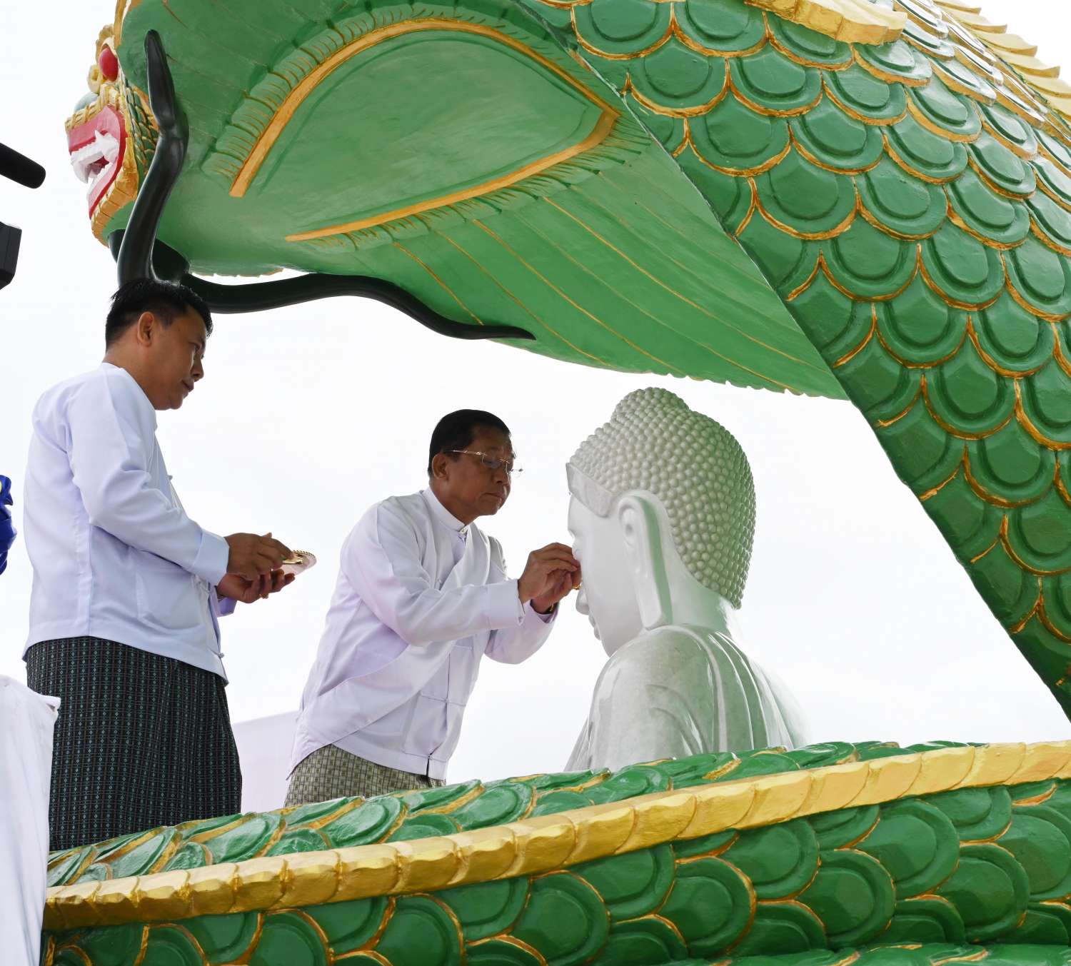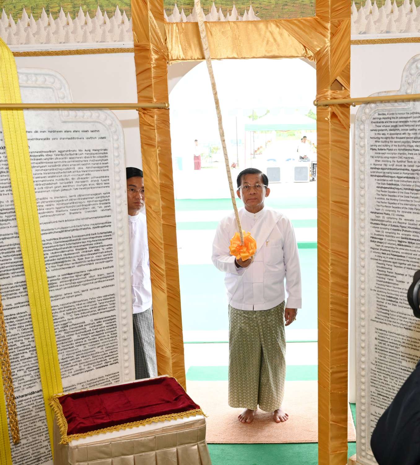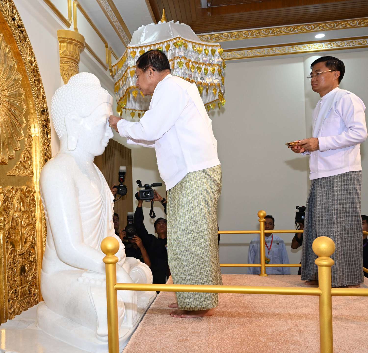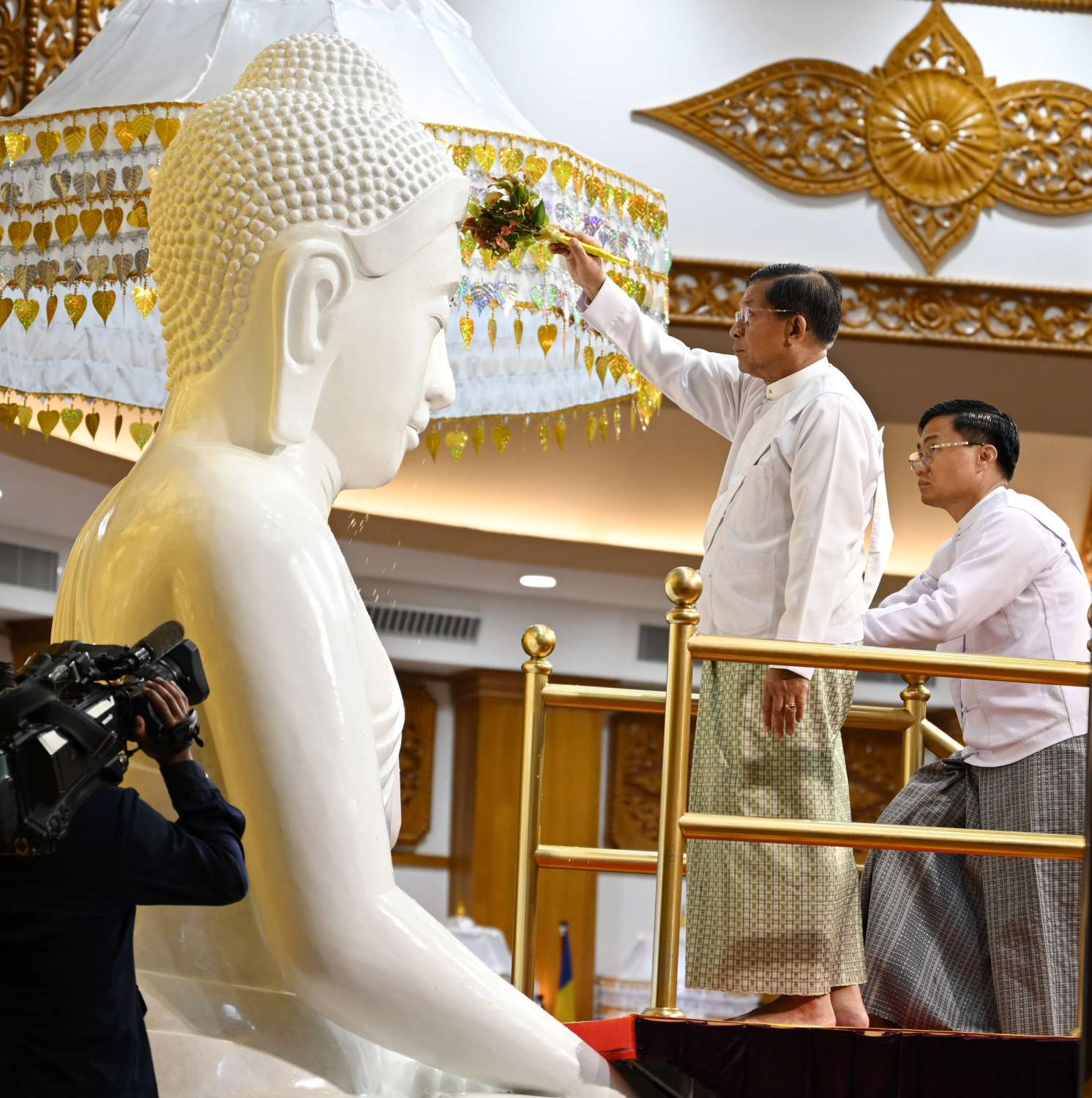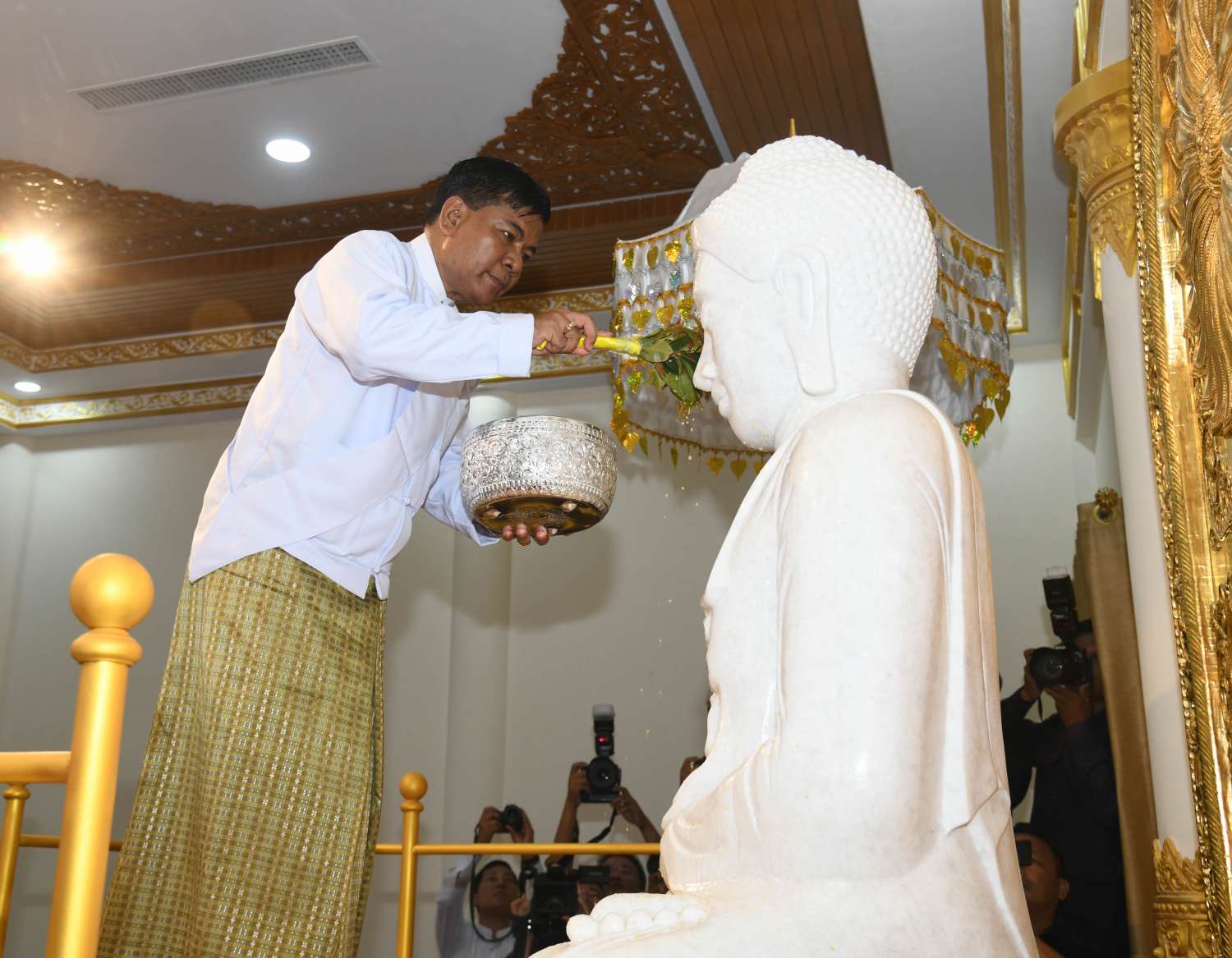 ကမ္ဘာပေါ်ရှိ ထိုင်တော်မူကျောက်ဆစ်ဗုဒ္ဓရုပ်ပွားတော်များအနက် ဉာဏ်တော်အမြင့်ဆုံးဖြစ်လာမည့် မာရဝိဇယဗုဒ္ဓ ရုပ်ပွားတော်မြတ်ကြီးတည်ဆောက်လျက်ရှိသည့် ပြည်ထောင်စုနယ်မြေ နေပြည်တော်၊ ဒက္ခိဏသီရိမြို့နယ်ရှိ မာရဝိဇယ ဗုဒ္ဓဥယျာဉ် ဝတ္ထုကံတော် အဂ္ဂါဓိပတိ သာသနာ့ဗိမာန်တော် မင်္ဂလာမော်ကွန်းကမ္ဗည်းဖွင့်လှစ်ခြင်း၊ ဗုဒ္ဓရုပ်ပွားတော်မြတ်များအား ဥဏ္ဏလုံမွေးရှင်တော် စီသွင်းပူဇော်ခြင်းနှင့် ကျောက်စာရုံ စေတီတော်တွင် မော်ကွန်းကျောက်စာတော် တည်ထားပူဇော်ခြင်း မင်္ဂလာအခမ်းအနား များကို ယနေ့နံနက်ပိုင်းတွင် သီးခြားစီကျင်းပပြုလုပ်ရာ ဦးဆောင်ဘုရားဒါယကာ နိုင်ငံတော်စီမံအုပ်ချုပ်ရေးကောင်စီဥက္ကဋ္ဌ နိုင်ငံတော်ဝန်ကြီးချုပ် ဗိုလ်ချုပ်မှူးကြီးမင်းအောင်လှိုင် တက်ရောက်ပူဇော်သည်။