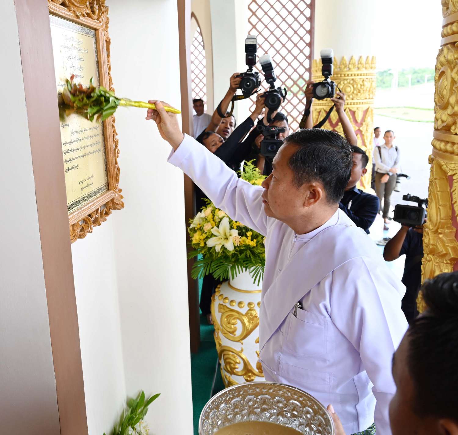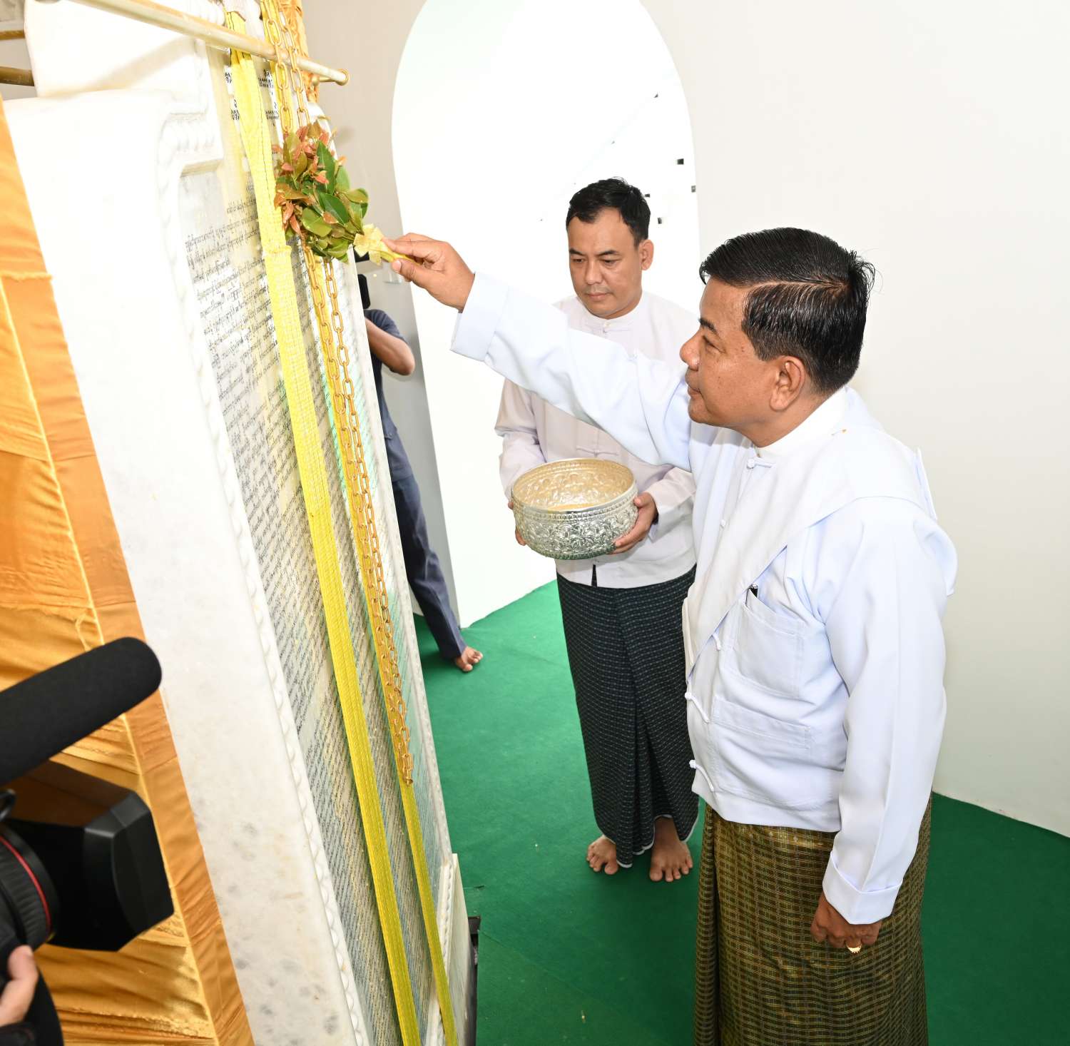 ထို့နောက် ထို့နောက်နိုင်ငံတော်စီမံအုပ်ချုပ်ရေးကောင်စီဒုတိယဥက္ကဋ္ဌ ဒုတိယဝန်ကြီးချုပ်၊ ညှိနှိုင်းကွပ်ကဲရေးမှူး (ကြည်း၊ ရေ၊ လေ) တို့ကကျောက်စာချပ်များအား ပရိတ်နံ့သာရည်များဖြင့် ပက်ဖျန်းပူဇော်သည်။