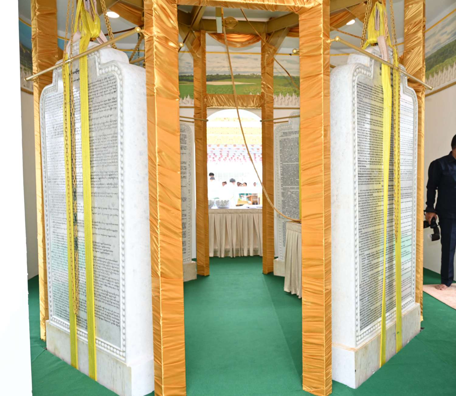 ဆက်လက်၍ ကျောက်စာရုံစေတီတော်တွင် မော်ကွန်းကျောက်စာတော် တည်ထားပူဇော်ခြင်း မင်္ဂလာအခမ်းအနားကို ကျင်းပပြုလုပ်ရာ “နမောတဿ” သုံးကြိမ်ရွတ်ဆို ဘုရားရှိခိုး၍ အခမ်းအနားကို ဖွင့်လှစ်သည်။