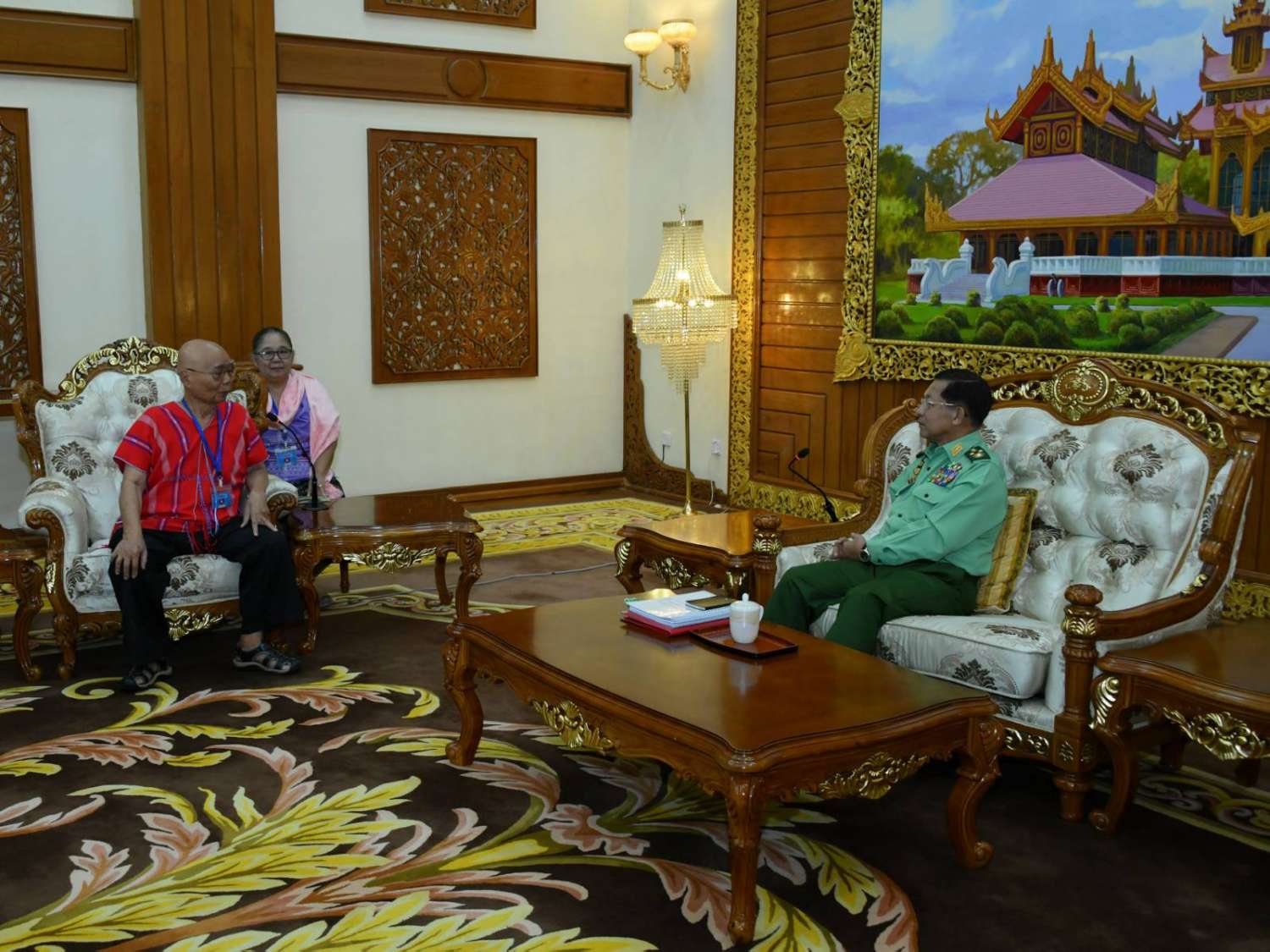 နိုင်ငံတော်စီမံအုပ်ချုပ်ရေးကောင်စီဥက္ကဋ္ဌ တပ်မတော်ကာကွယ်ရေးဦးစီးချုပ် ဗိုလ်ချုပ်မှူးကြီးမင်းအောင်လှိုင်အား တစ်နိုင်ငံလုံးပစ်ခတ်တိုက်ခိုက်မှုရပ်စဲရေးသဘောတူစာချုပ် (NCA) (၈)နှစ်မြောက် နှစ်ပတ်လည်နေ့အခမ်းအနားသို့ တက်ရောက်ခဲ့သော ကရင်တိုင်းရင်းသားခေါင်းဆောင် စောမူတူးစေးဖိုး ဦးဆောင်သည့်အဖွဲ့မှ လာရောက်တွေ့ဆုံနှုတ်ဆက်
