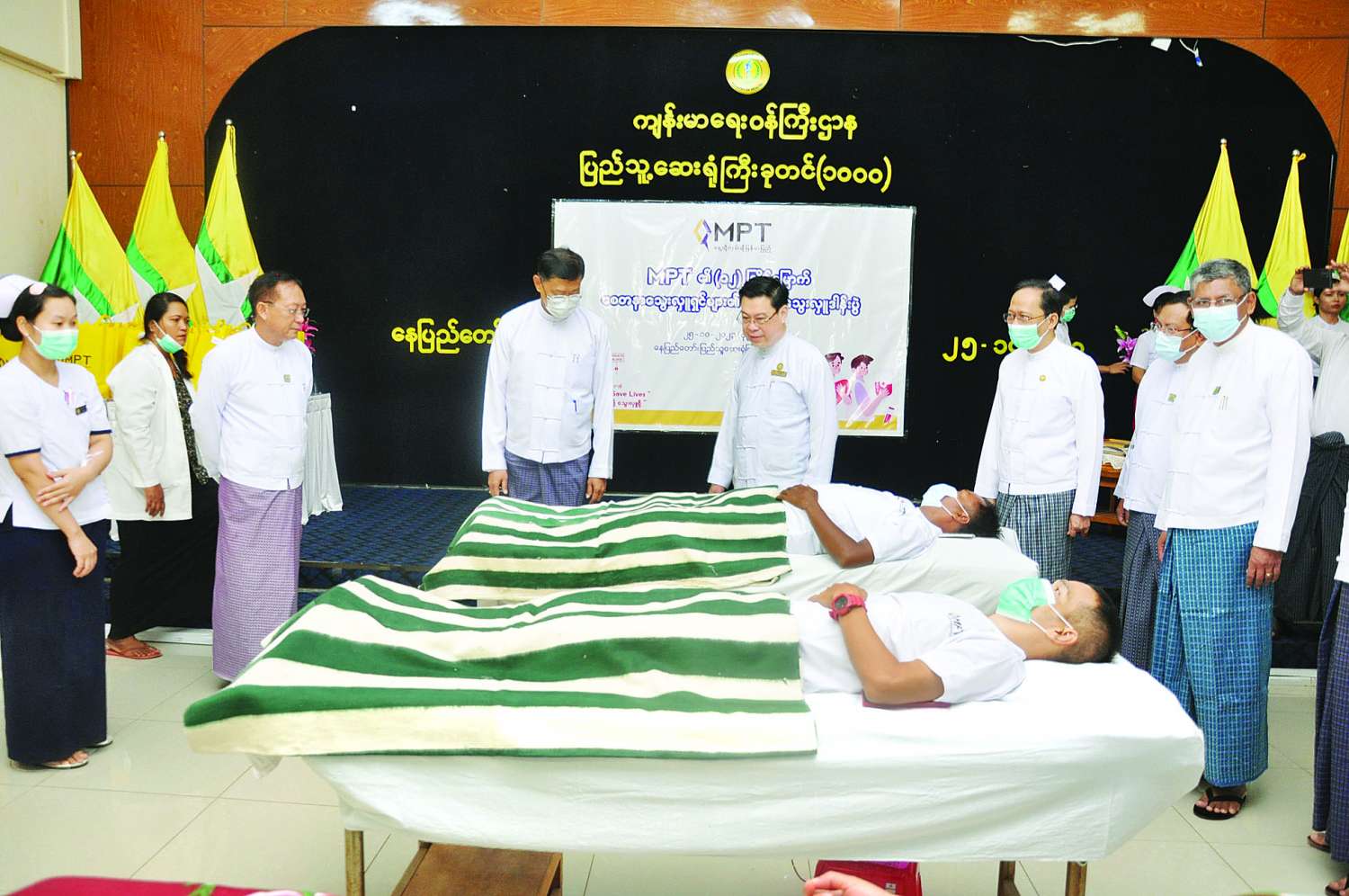 ဒုတိယဝန်ကြီးချုပ်နှင့် ပြည်ထောင်စုဝန်ကြီး ဗိုလ်ချုပ်ကြီးမြထွန်းဦး မြန်မာ့ဆက်သွယ်ရေးလုပ်ငန်းဝန်ထမ်းများ၊ ဝန်ထမ်းမိသားစုများနှင့် စေတနာသွေးလှူရှင်များ စုပေါင်းသွေးလှူဒါန်းမှု ကြည့်ရှုအားပေး