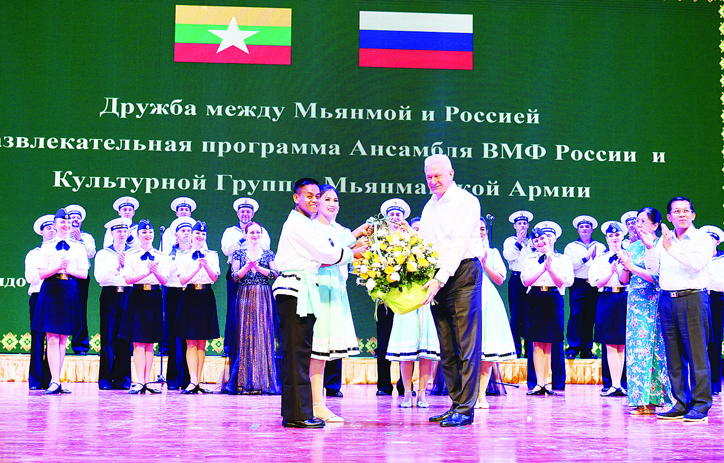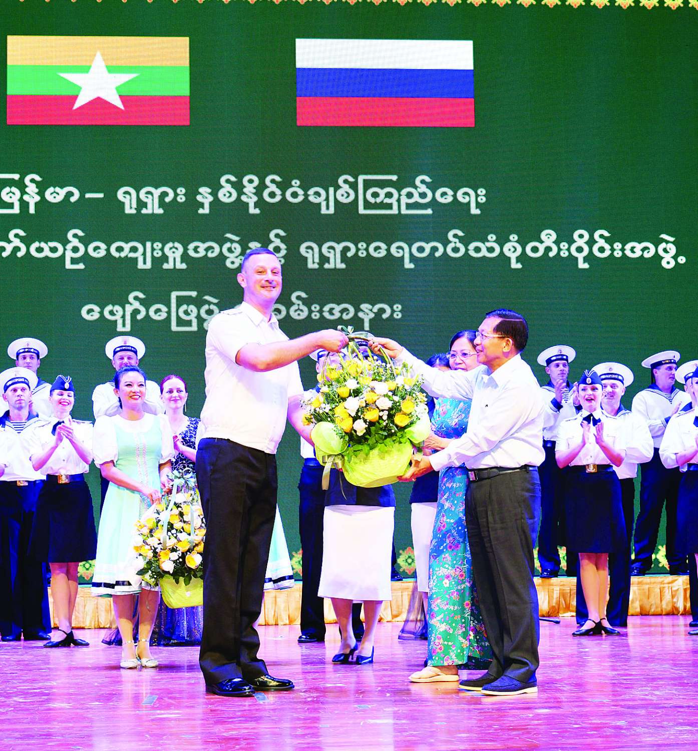 ဖျော်ဖြေမှုများအပြီးတွင် နိုင်ငံတော်စီမံအုပ်ချုပ်ရေးကောင်စီ ဥက္ကဋ္ဌ တပ်မတော် ကာကွယ်ရေးဦးစီးချုပ် နှင့် ဇနီးတို့က ရုရှားရေတပ်သံစုံတီးဝိုင်းအဖွဲ့အား ဂုဏ်ပြုပန်းခြင်း ပေးအပ်ချီးမြှင့်သည်။