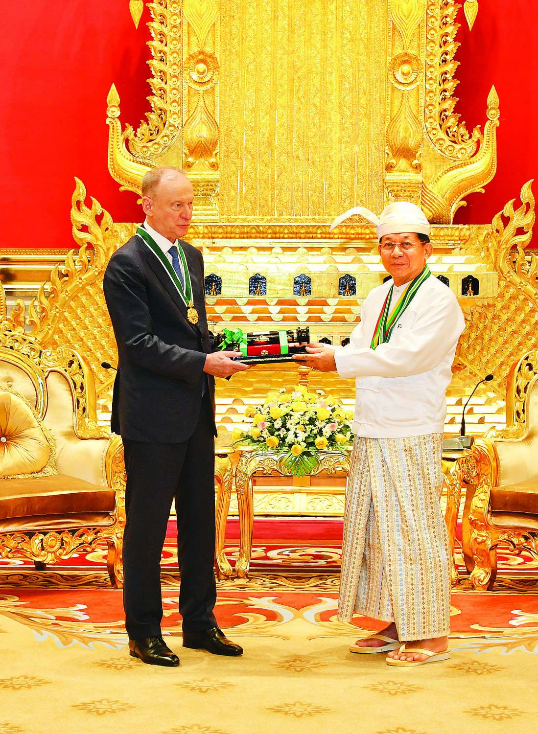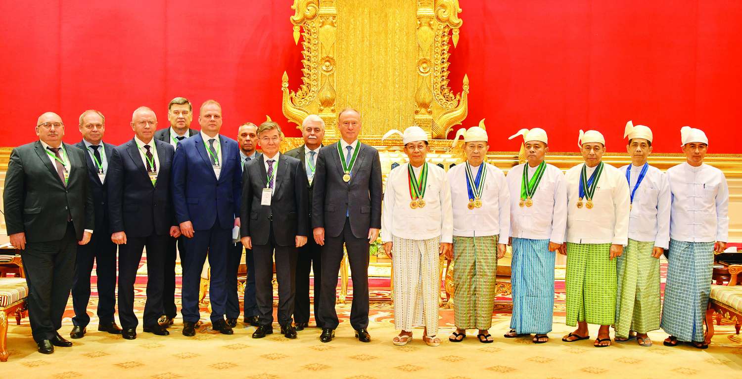 နိုင်ငံတော်စီမံအုပ်ချုပ်ရေးကောင်စီဥက္ကဋ္ဌ နိုင်ငံတော်ဝန်ကြီးချုပ် ဗိုလ်ချုပ်မှူးကြီး သတိုးမဟာသရေစည်သူ သတိုးသီရိသုဓမ္မ မင်းအောင်လှိုင်သည် မြန်မာနိုင်ငံနှင့် ရုရှားနိုင်ငံတို့အကြား ချစ်ကြည်ရင်းနှီးမှုနှင့် ပူးပေါင်းဆောင်ရွက်မှုများ ပိုမိုနီးကပ်ခိုင်မာအောင် စွမ်းစွမ်းတမံတည်ဆောက်နိုင်ခဲ့သည့် ရုရှားဖက်ဒရေးရှင်းနိုင်ငံ လုံခြုံရေးကောင်စီ အတွင်းရေးမှူး Mr. Nikolai PATRUSHEV အား စွမ်းဆောင်မှုဆိုင်ရာ ဂုဏ်ထူးဆောင်ဘွဲ့ဖြစ်သည့် သရေစည်သူဘွဲ့ ချီးမြှင့်အပ်နှင်းခြင်းအနားကို ယနေ့မွန်းလွဲပိုင်းတွင် နေပြည်တော်ရှိ နိုင်ငံတော်စီမံအုပ်ချုပ်ရေးကောင်စီဥက္ကဋ္ဌရုံး သံတမန်ဆောင်ဧည့်ခန်းမ၌ ကျင်းပပြုလုပ်သည်။