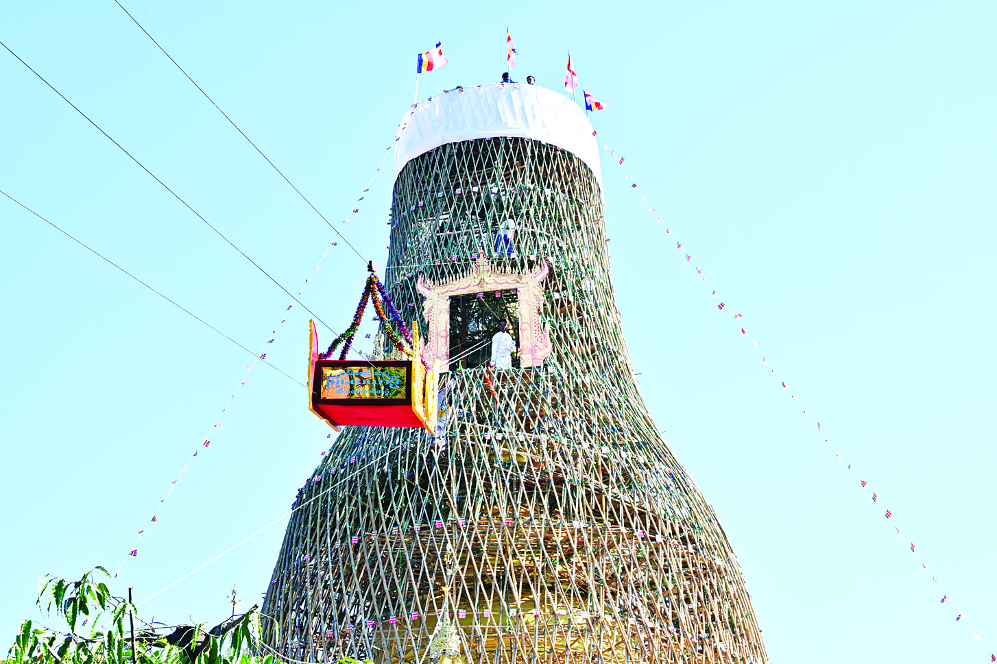 ဆက်လက်၍ ရွှေထီးတော်တင်လှူပူဇော်ခြင်းမင်္ဂလာအခမ်းအနားကို ဆက်လက်ကျင်းပရာ နိုင်ငံတော်စီမံအုပ်ချုပ်ရေးကောင်စီဥက္ကဋ္ဌ နိုင်ငံတော်ဝန်ကြီးချုပ်၏ဇနီးနှင့် အဖွဲ့ဝင်များ၊ အခမ်းအနားတက်ရောက်လာကြသူများနှင့် ဒေသခံပြည်သူများက မင်္ဂလာကြိုးဆွဲ၍ ရတနာစိန်ဖူးတော်၊ ငှက်မြတ်နားတော်တို့အား မင်္ဂလာရထားပျံဖြင့် စေတီတော်အထွတ်သို့ ပင့်ဆောင်ကြပြီး နိုင်ငံတော်စီမံအုပ်ချုပ်ရေးကောင်စီဥက္ကဋ္ဌ နိုင်ငံတော်ဝန်ကြီးချုပ်နှင့် အဖွဲ့ဝင်များက ရတနာစိန်ဖူးတော်၊ ငှက်မြတ်နားတော်တို့ကို စေတီတော်အထွတ်တွင် တင်လှူပူဇော်၍ ပရိတ်နံ့သာရည်များ ပက်ဖျန်းကြသည်။