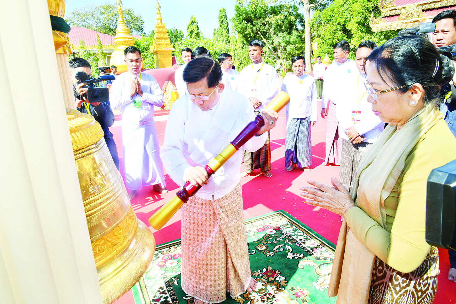 ယင်းနောက် နိုင်ငံတော်စီမံအုပ်ချုပ်ရေးကောင်စီဥက္ကဋ္ဌ နိုင်ငံတော်ဝန်ကြီးချုပ်နှင့် ဇနီးတို့က မဟာဗောဓိညောင်ပင်တော်ကြီး ပိုမို၍ တည်တံ့ခိုင်မြဲဝေစည်ရှင်သန်နိုင်စေရန်ရည်သန်၍ ပူဇော်ကြပြီး အမွှေးနံ့သာရည်များ ပက်ဖျန်းပူဇော်ကြကာ မင်္ဂလာမော်ကွန်းကမ္ပည်းကျောက်စာတော်ကို အမွှေးနံ့သာရည်များပက်ဖျန်း ဖွင့်လှစ်၍ ရတနာရွှေခေါင်းလောင်းတော်ကို ထိုးခတ်ပူဇော်သည်။