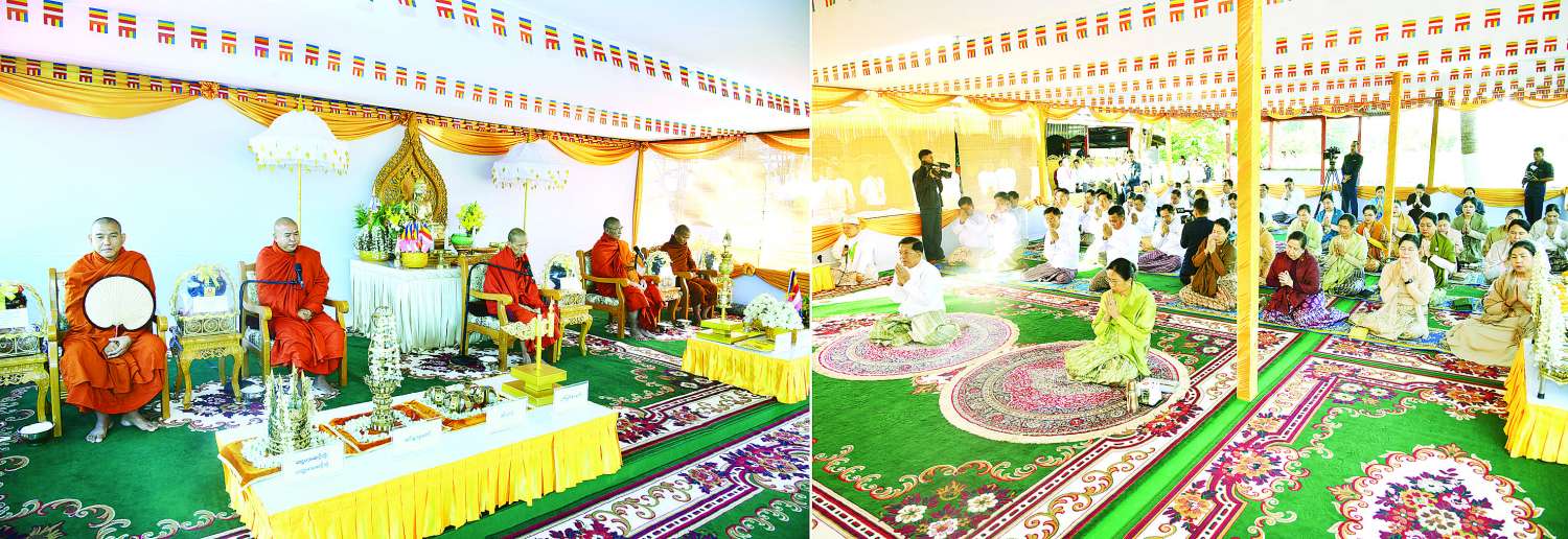 ထို့နောက် အခမ်းအနားကို “နမောတဿ” သုံးကြိမ်ရွတ်ဆို ဘုရားကန်တော့ဖွင့်လှစ်ပြီး နိုင်ငံတော်စီမံအုပ်ချုပ်ရေးကောင်စီဥက္ကဋ္ဌ နိုင်ငံတော်ဝန်ကြီးချုပ်နှင့်ဇနီး၊ အခမ်းအနားတက်ရောက်လာကြသူများက ပါဠိဆရာတော်ကြီးထံမှ ကိုးပါးသီလခံယူဆောက်တည်ကြကာ ဥပါသကာများက ပရိတ်ပန်း၊ ပရိတ်ရေ၊ ပရိတ်ချည်၊ ပရိတ်သဲများကို သံဃာတော်များထံ ဆက်ကပ်သည်။ ၎င်းနောက် သံဃာတော်အရှင်သူမြတ်တို့ ရွတ်ပွားချီးမြှင့်တော်မူကြသည့် ပရိတ်တရားတော်များကို နာယူကြည်ညိုကြသည်။