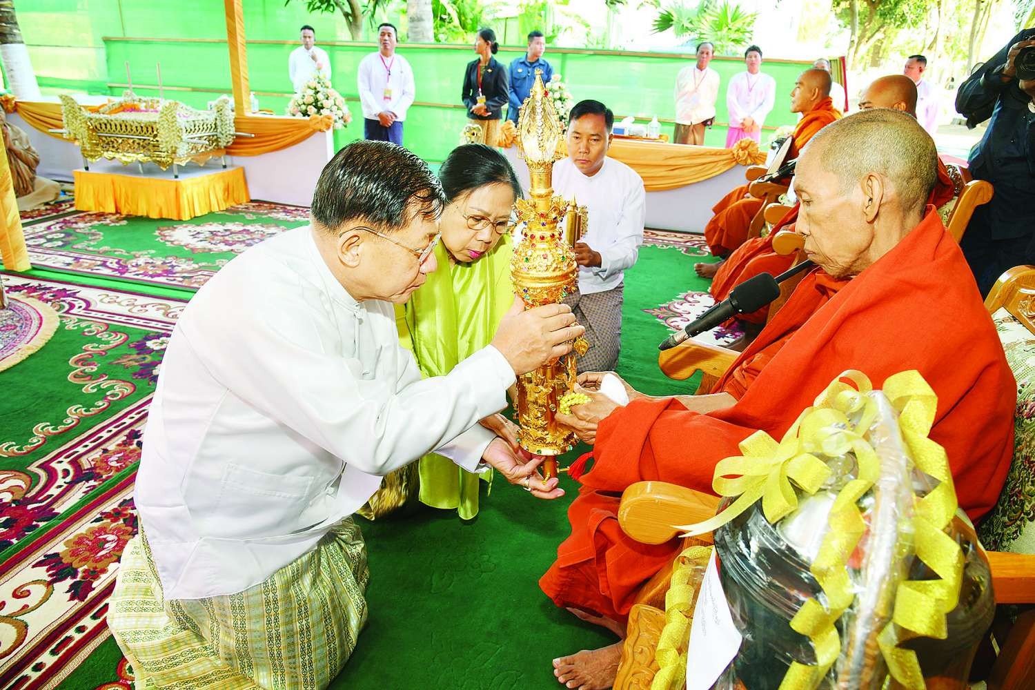 ၎င်းနောက် နိုင်ငံတော်စီမံအုပ်ချုပ်ရေးကောင်စီဥက္ကဋ္ဌ နိုင်ငံတော်ဝန်ကြီးချုပ်နှင့်ဇနီးတို့က သဗ္ဗညုဘုရားရှင်အား ရည်မှန်းထား၍ ရွှေထီးတော်၊ ငှက်မြတ်နားတော်၊ ရတနာစိန်ဖူးတော်တို့ကို ပါဠိဆရာတော်ကြီးထံ သာဟတ္ထိကဒါနမြောက် ဆက်ကပ်ပူဇော်ပြီး လှူဖွယ်ပစ္စည်းများ ဆက်ကပ်လှူဒါန်းသည်။ ဆက်လက်ပြီး ကောင်စီတွဲဖက်အတွင်းရေးမှူးနှင့် ကောင်စီဝင်များက သံဃာတော်အရှင်သူမြတ်များထံ လှူဖွယ်ပစ္စည်းများကို အသီးသီး ဆက်ကပ်လှူဒါန်းကြသည်။