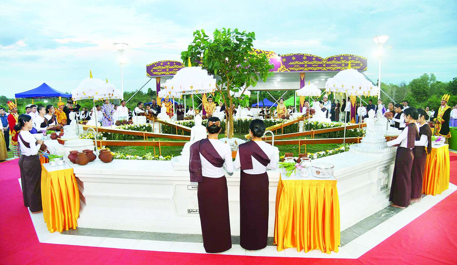 ထို့နောက် နိုင်ငံတော်စီမံအုပ်ချုပ်ရေးကောင်စီဥက္ကဋ္ဌ နိုင်ငံတော်ဝန်ကြီးချုပ်နှင့်ဇနီး၊ နိုင်ငံတော်စီမံအုပ်ချုပ်ရေးကောင်စီဒုတိယဥက္ကဋ္ဌ ဒုတိယဝန်ကြီးချုပ်နှင့်ဇနီး၊ ကောင်စီအတွင်းရေးမှူးနှင့်ဇနီး၊ ကောင်စီတွဲဖက်အတွင်းရေးမှူးနှင့်ဇနီး၊ ကောင်စီဝင်များနှင့်ဇနီးများ၊ ပြည်ထောင်စုအဆင့်ပုဂ္ဂိုလ်များနှင့် ဇနီများသည် သတ်မှတ်ထားသည့်နေရာများအလိုက် နေရာယူကြပြီး မဟာဗောဓိညောင်ပင်တော်အား အမွှေးနံ့သာရည်များ ပက်ဖျန်းပူဇော်ကာ ညောင်ရေသွန်းလောင်းပူဇော်ကြသည်။ ထို့နောက် မဟာဗောဓိညောင်ပင်တော်ရှိ ဗုဒ္ဓရုပ်ပွားတော်မြတ်များအား ရေသပ္ပါယ်တော်မူကြပြီး မဟာဗောဓိညောင်ပင်တော်အား လက်ယာရစ်လှည့်လည်ပူဇော်ကြသည်။