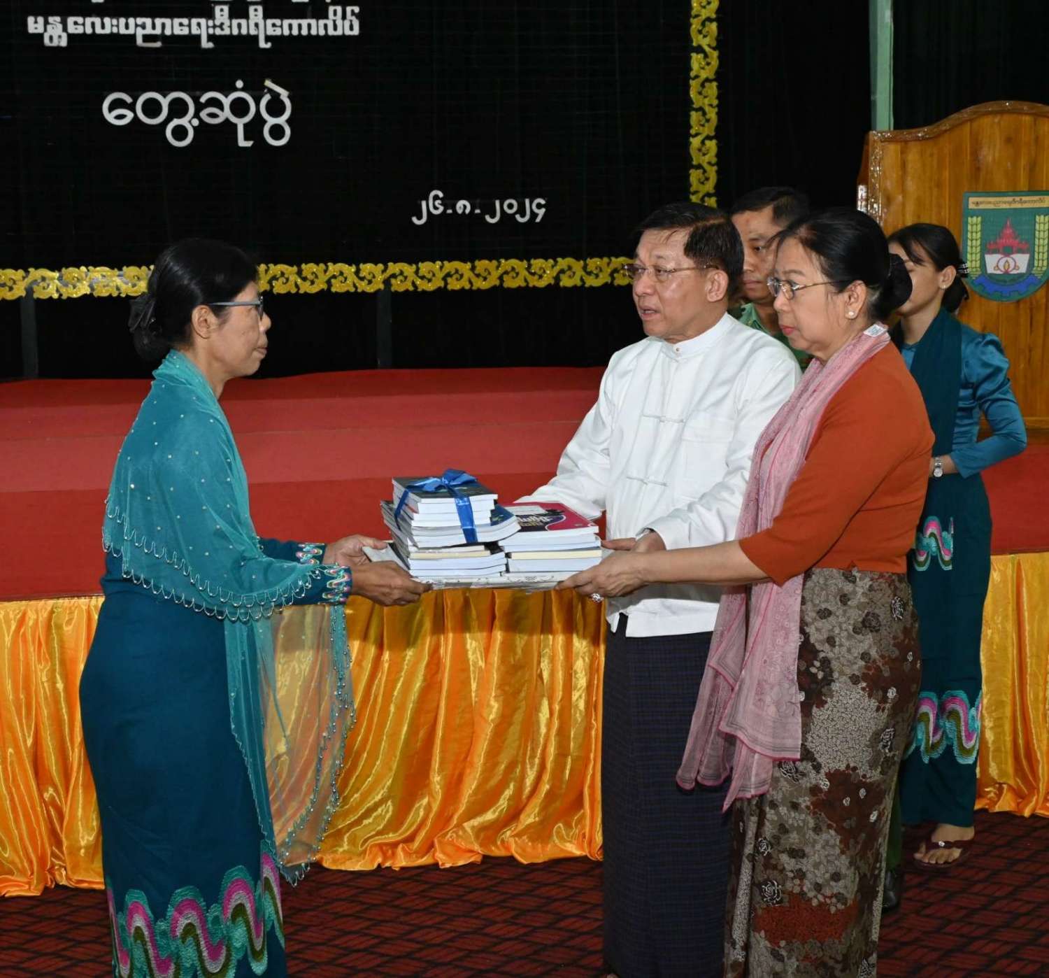 ထို့နောက် နိုင်ငံတော်စီမံအုပ်ချုပ်ရေးကောင်စီဥက္ကဋ္ဌ နိုင်ငံတော်ဝန်ကြီးချုပ်နှင့် ဇနီးတို့က မန္တလေးပညာရေးဒီဂရီကောလိပ် စာကြည့်အတိုက်အတွက် လူထုသိပ္ပံကျမ်းများ၊ သုတရသ စာအုပ်စာစောင်များနှင့် လေ့ကျင့်ရေးအခြေခံပညာ အလယ်တန်းကျောင်းအတွက် သင်ထောက်ကူပစ္စည်းများကို ပေးအပ်လှူဒါန်းရာ ကျောင်းအုပ်ဆရာမကြီးက လက်ခံရယူသည်။