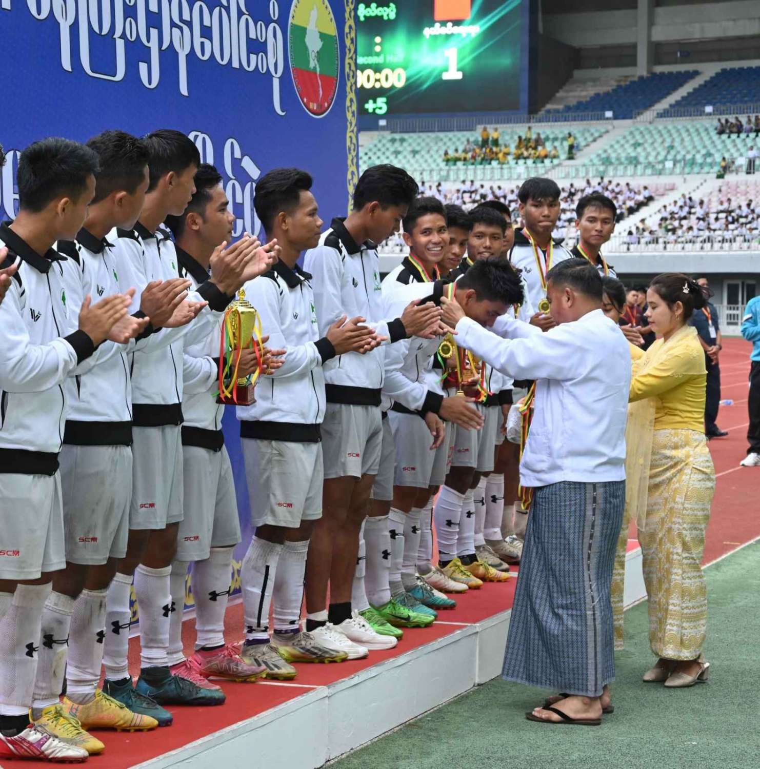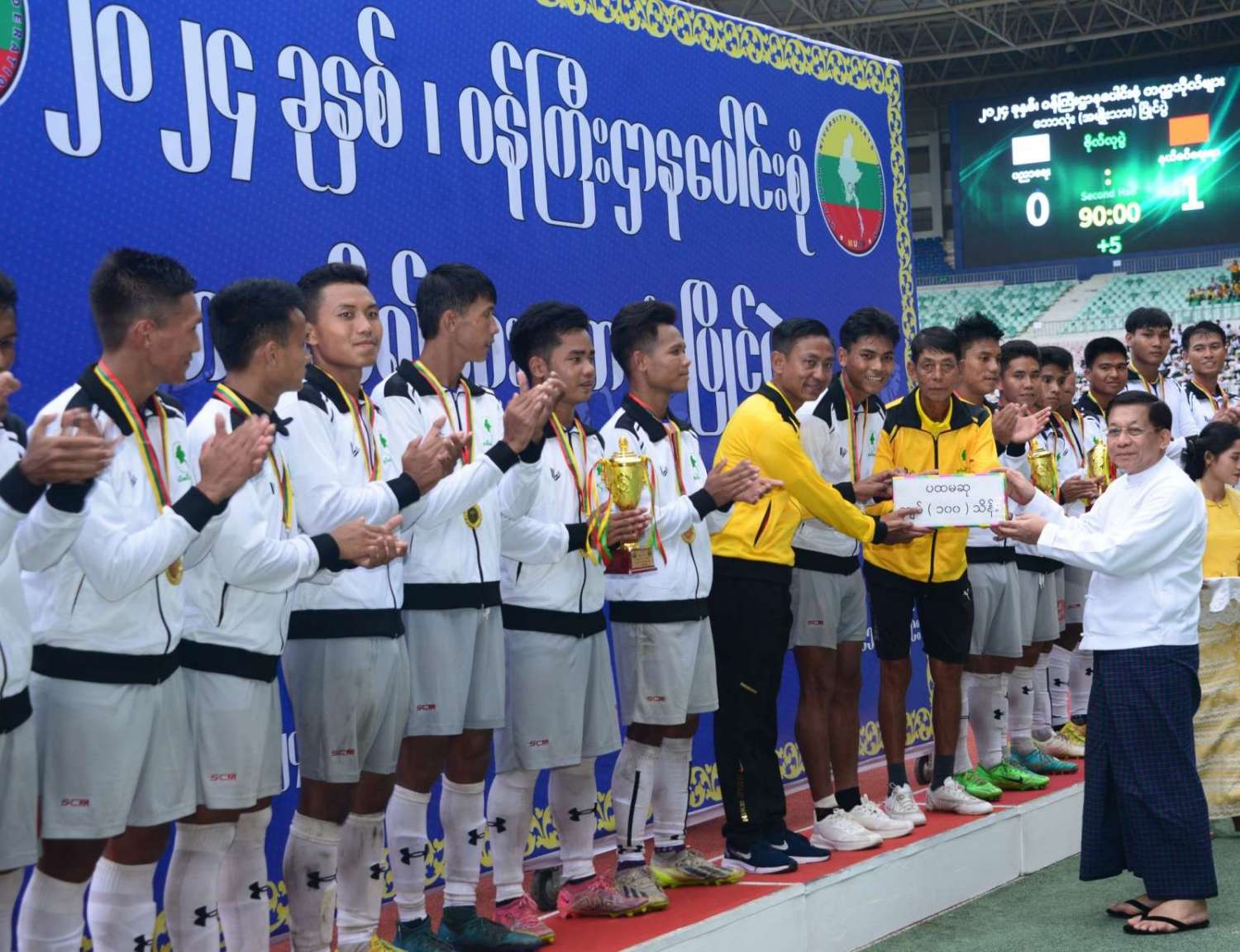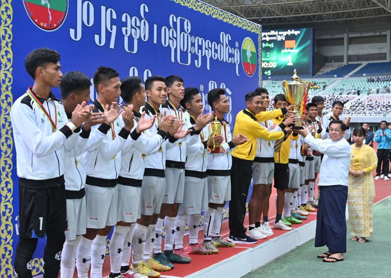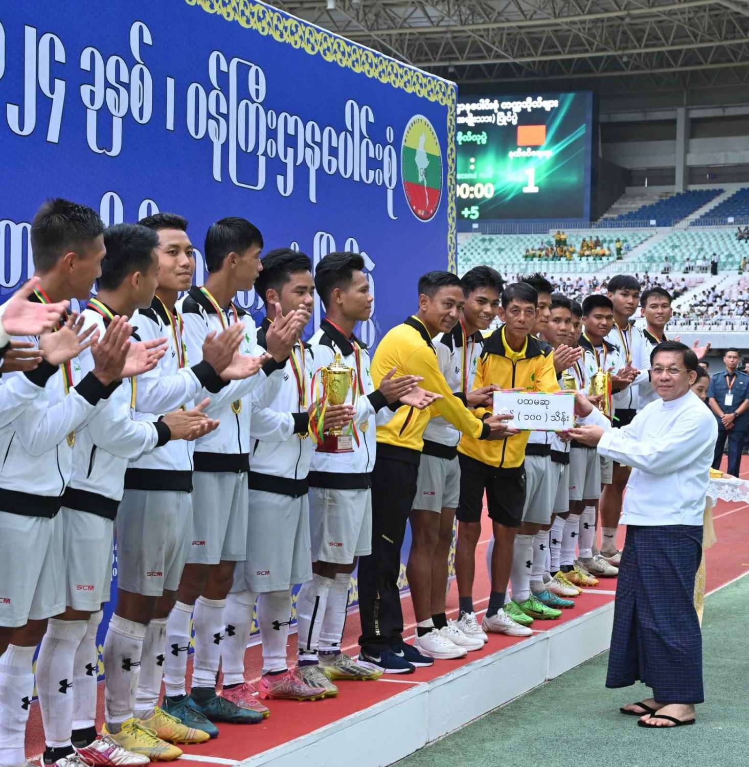 နိုင်ငံတော်စီမံအုပ်ချုပ်ရေးကောင်စီဥက္ကဋ္ဌ နိုင်ငံတော်ဝန်ကြီးချုပ် ဗိုလ်ချုပ်မှူးကြီး မင်းအောင်လှိုင် ၂ဝ၂၄ ခုနှစ်၊ ဝန်ကြီးဌာနပေါင်းစုံ တက္ကသိုလ်များဘောလုံးပြိုင်ပွဲ ဗိုလ်လုပွဲသို့ တက်ရောက်ကြည့်ရှုအားပေးပြီး ဆုများပေးအပ်ချီးမြှင့်
