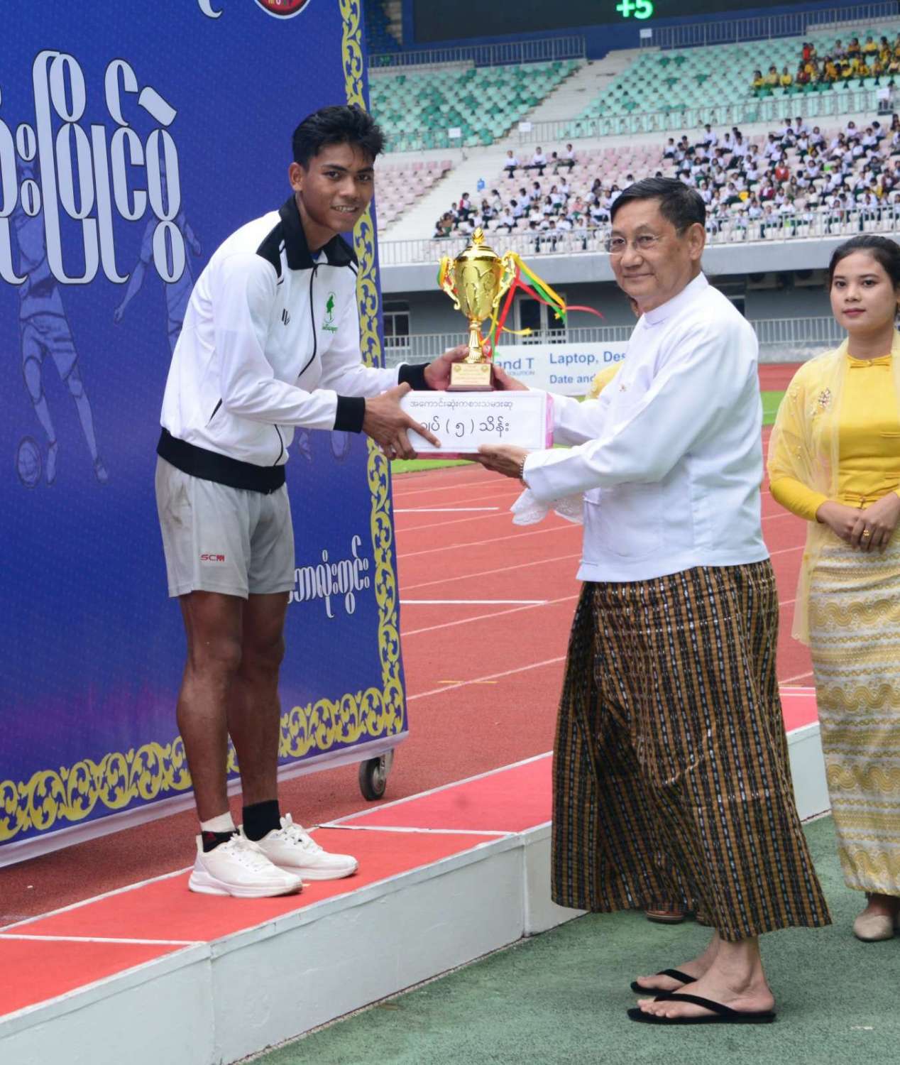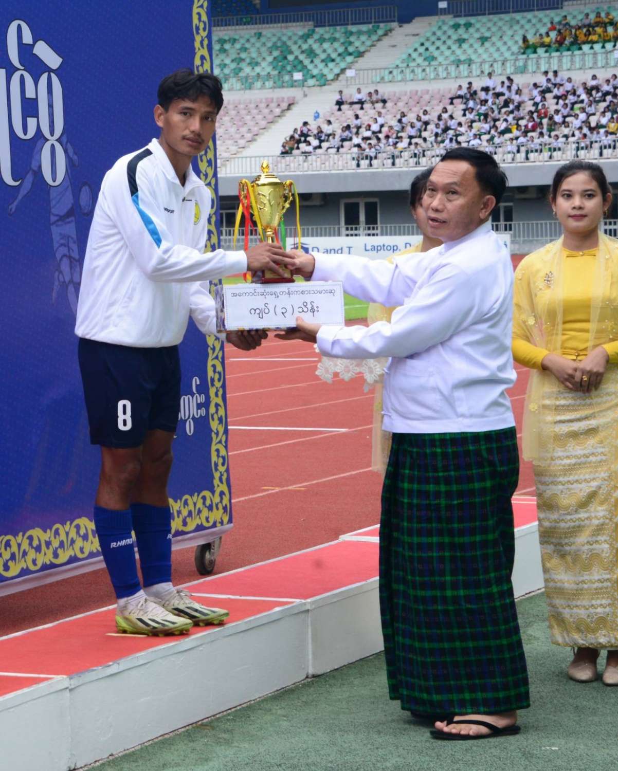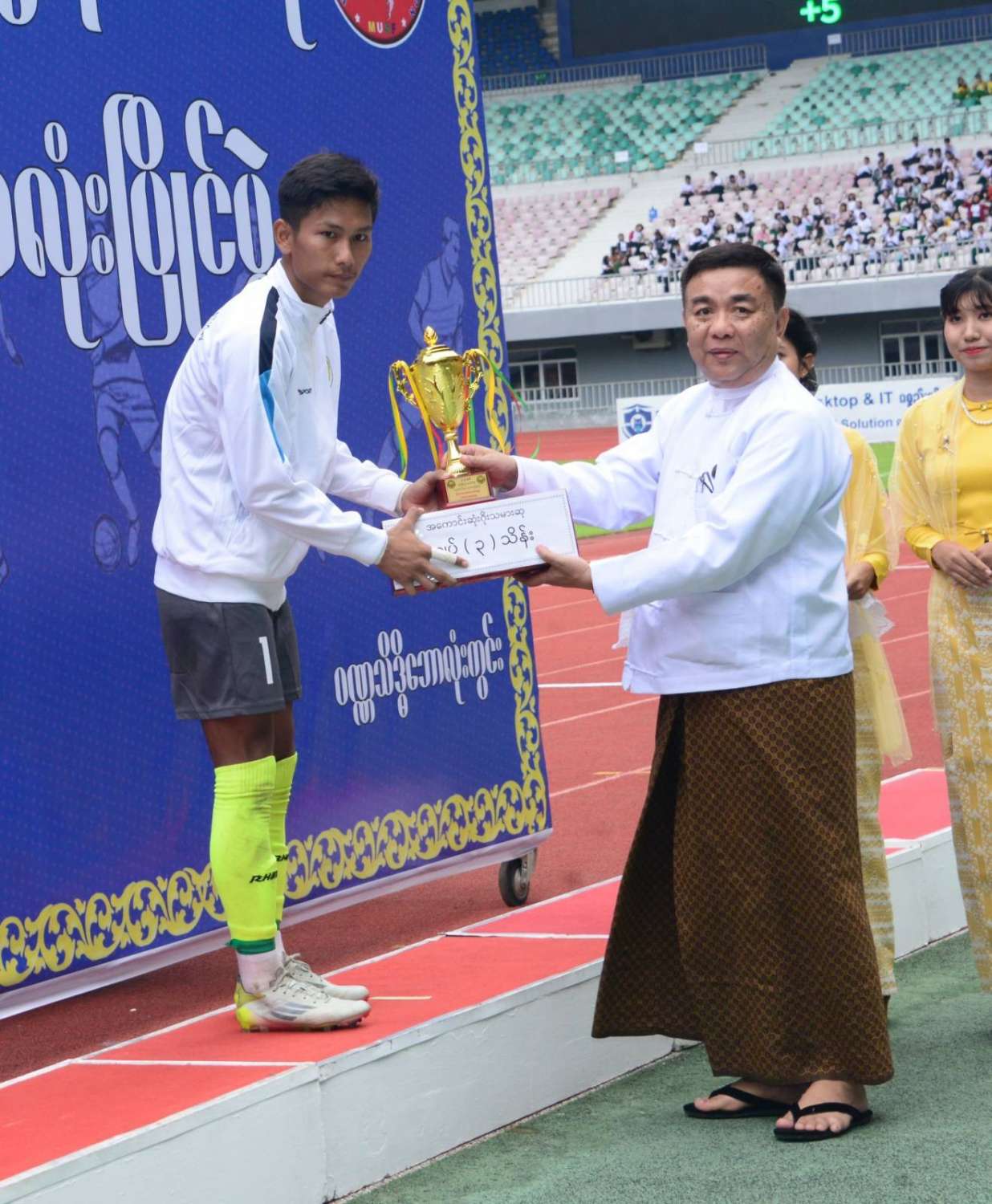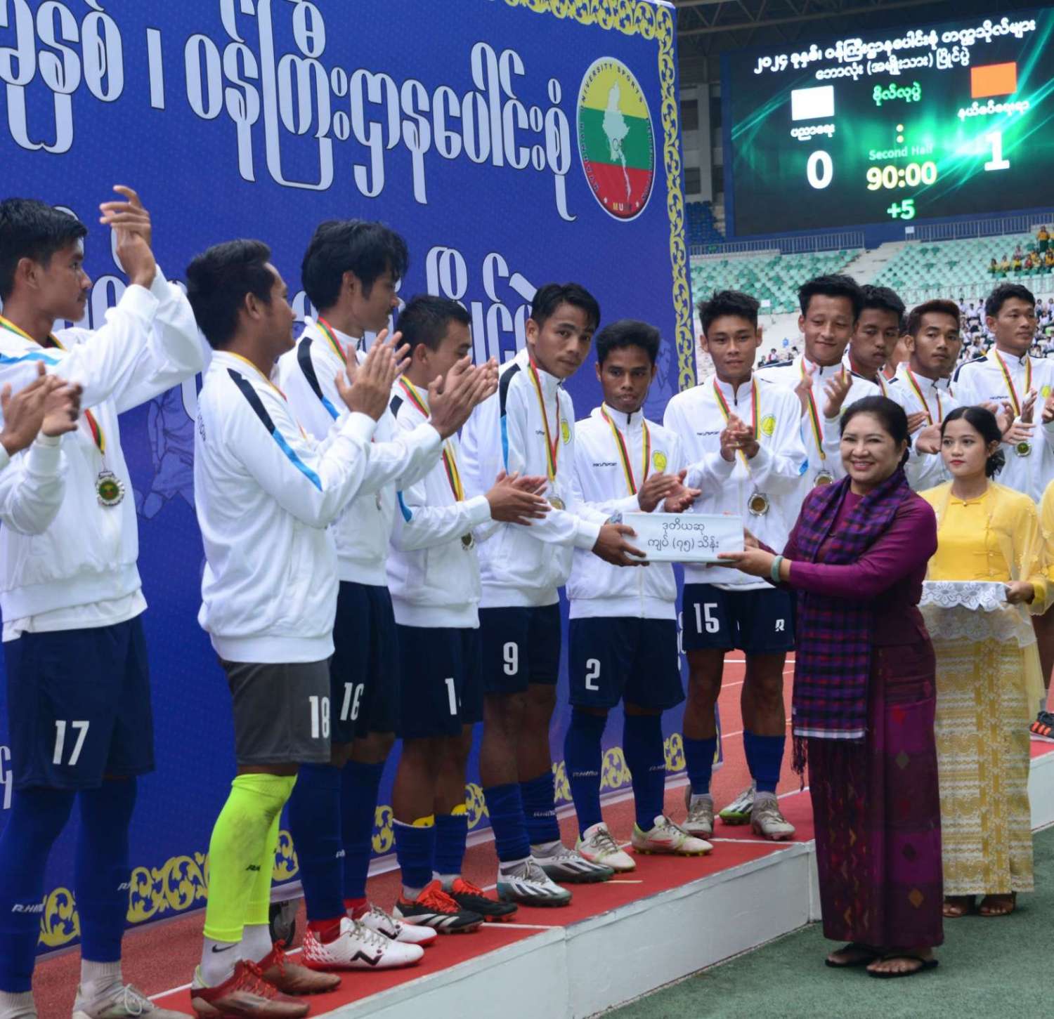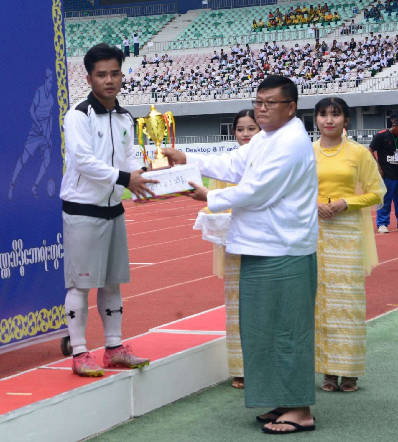 နိုင်ငံတော်စီမံအုပ်ချုပ်ရေးကောင်စီဥက္ကဋ္ဌ နိုင်ငံတော်ဝန်ကြီးချုပ် ဗိုလ်ချုပ်မှူးကြီး မင်းအောင်လှိုင် ၂ဝ၂၄ ခုနှစ်၊ ဝန်ကြီးဌာနပေါင်းစုံ တက္ကသိုလ်များဘောလုံးပြိုင်ပွဲ ဗိုလ်လုပွဲသို့ တက်ရောက်ကြည့်ရှုအားပေးပြီး ဆုများပေးအပ်ချီးမြှင့်