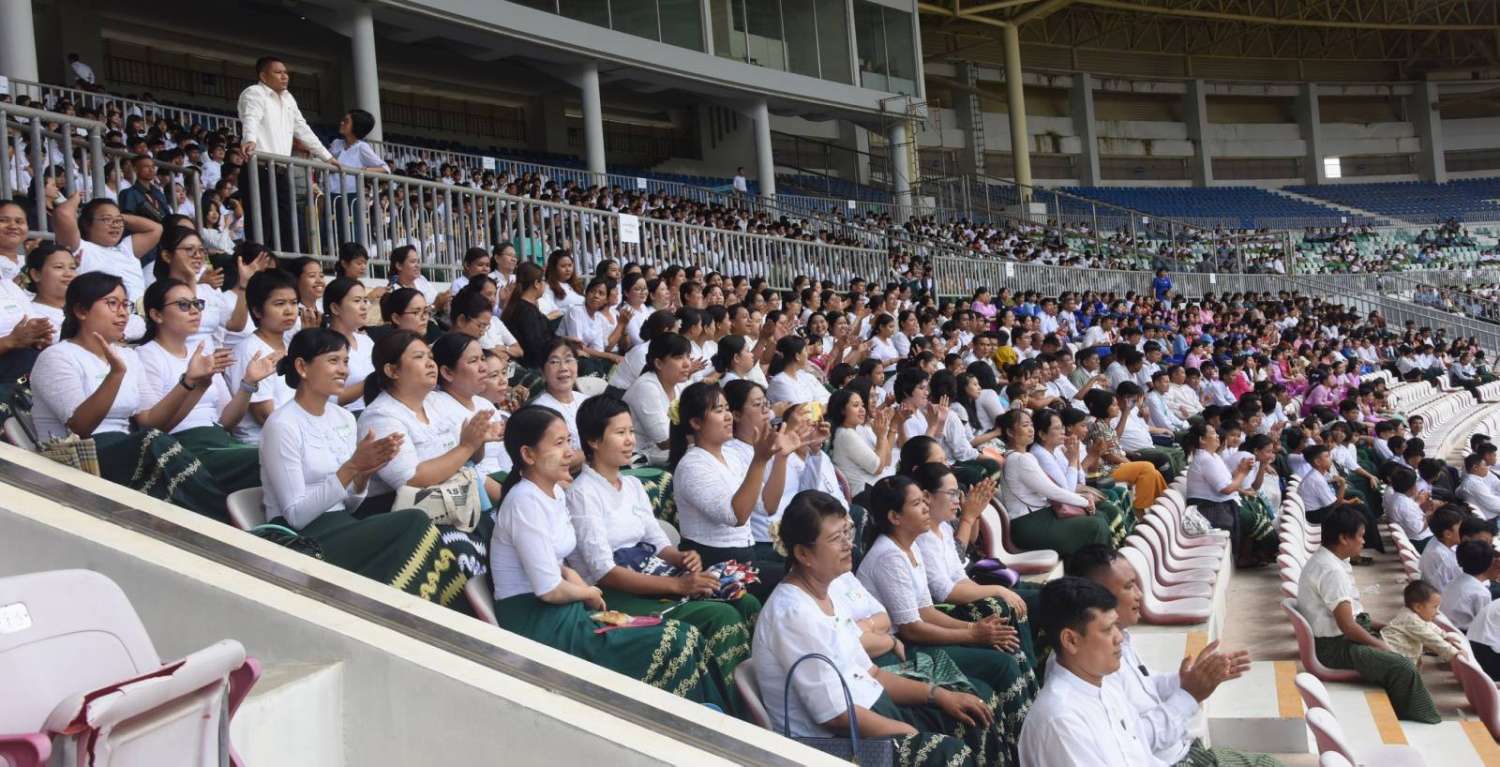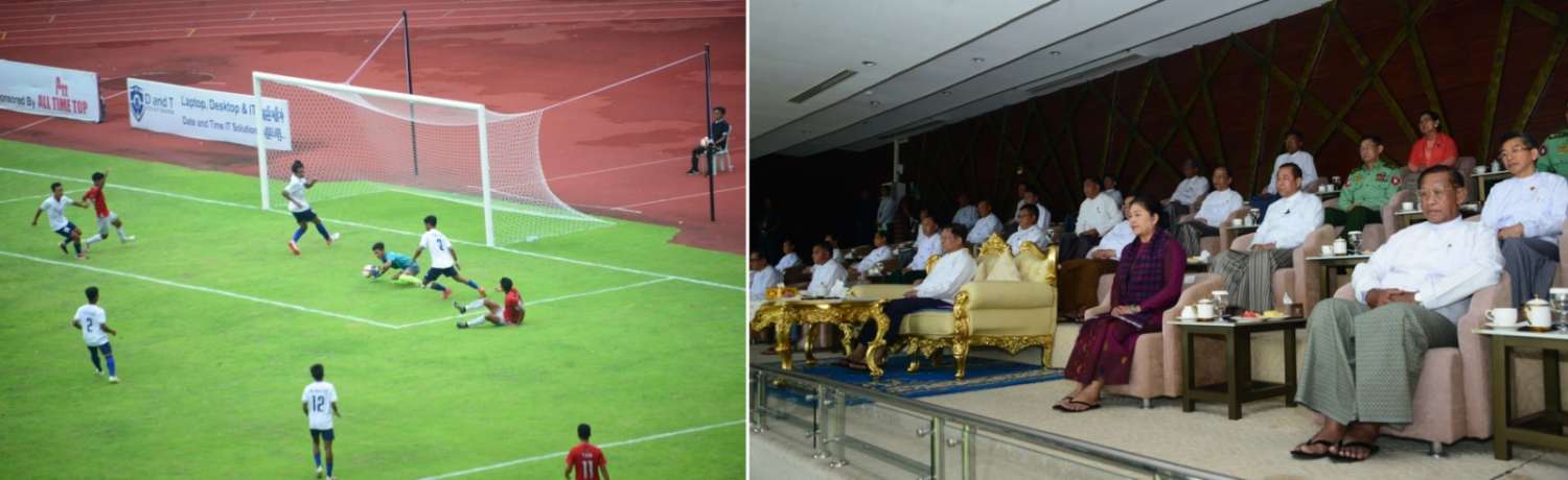 ဦးစွာ နိုင်ငံတော်စီမံအုပ်ချုပ်ရေးကောင်စီဥက္ကဋ္ဌ နိုင်ငံတော်ဝန်ကြီးချုပ်နှင့် တက်ရောက်လာကြသူများသည် ၂၀၂၄ ခုနှစ်၊ ဝန်ကြီးဌာနပေါင်းစုံ တက္ကသိုလ်များဘောလုံးပြိုင်ပွဲ ဗိုလ်လုပွဲအဖြစ် ပညာရေးဝန်ကြီးဌာန ကိုယ်စားပြုအသင်းနှင့် နယ်စပ်ရေးရာဝန်ကြီးဌာန ကိုယ်စားပြုအသင်းတို့ ယှဉ်ပြိုင်ကစားမှုကို ကြည့်ရှုအားပေးသည်။