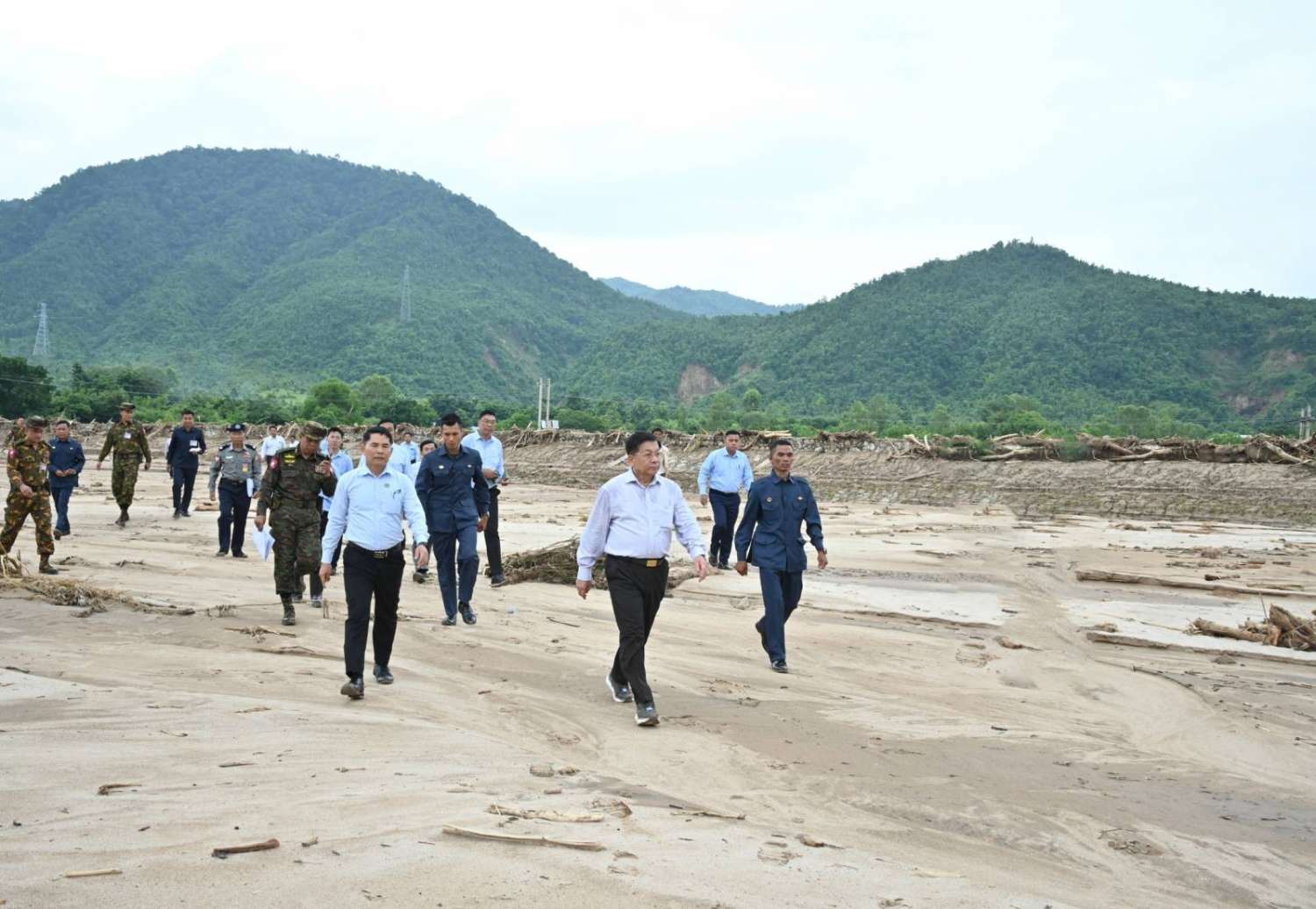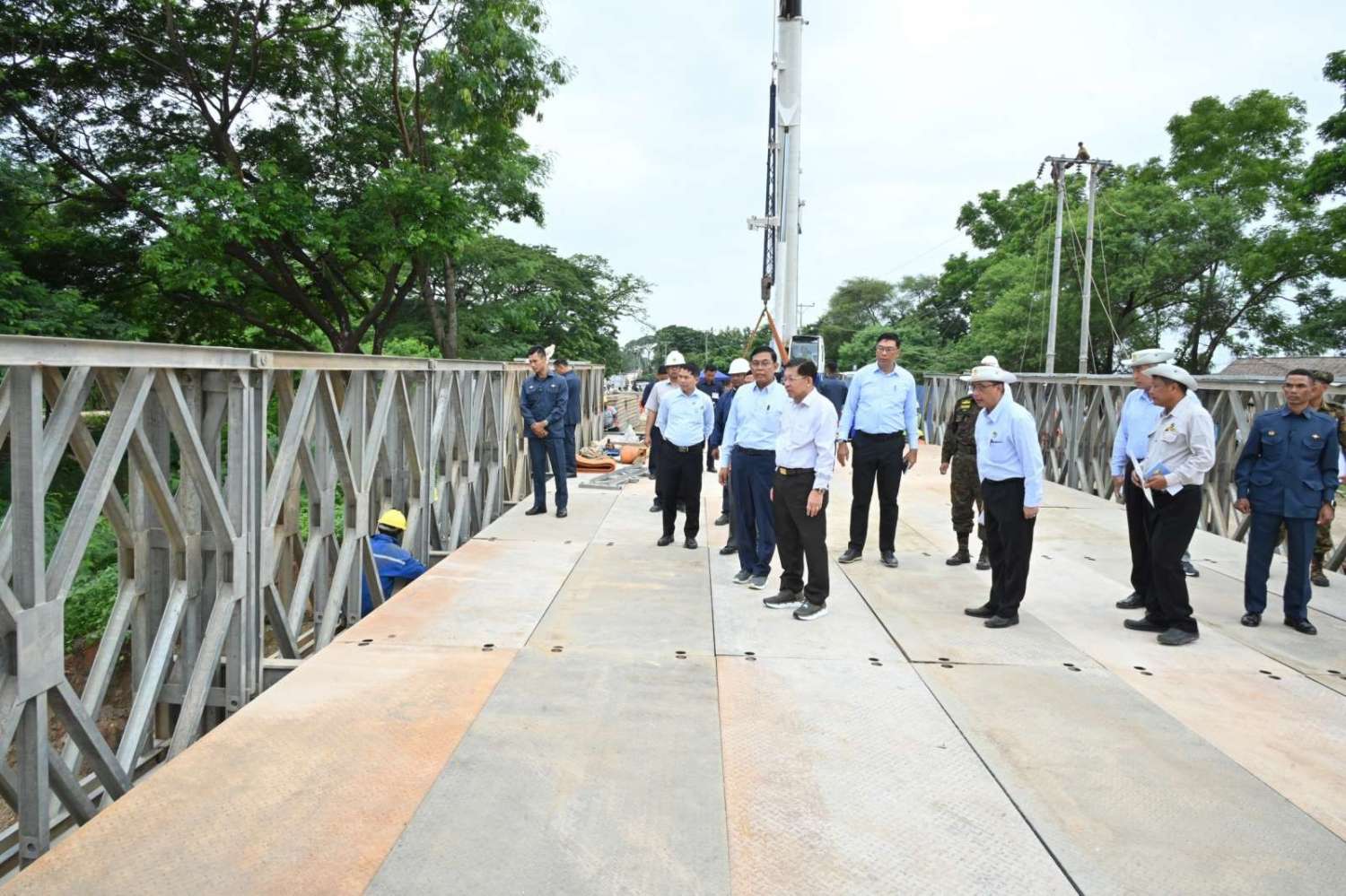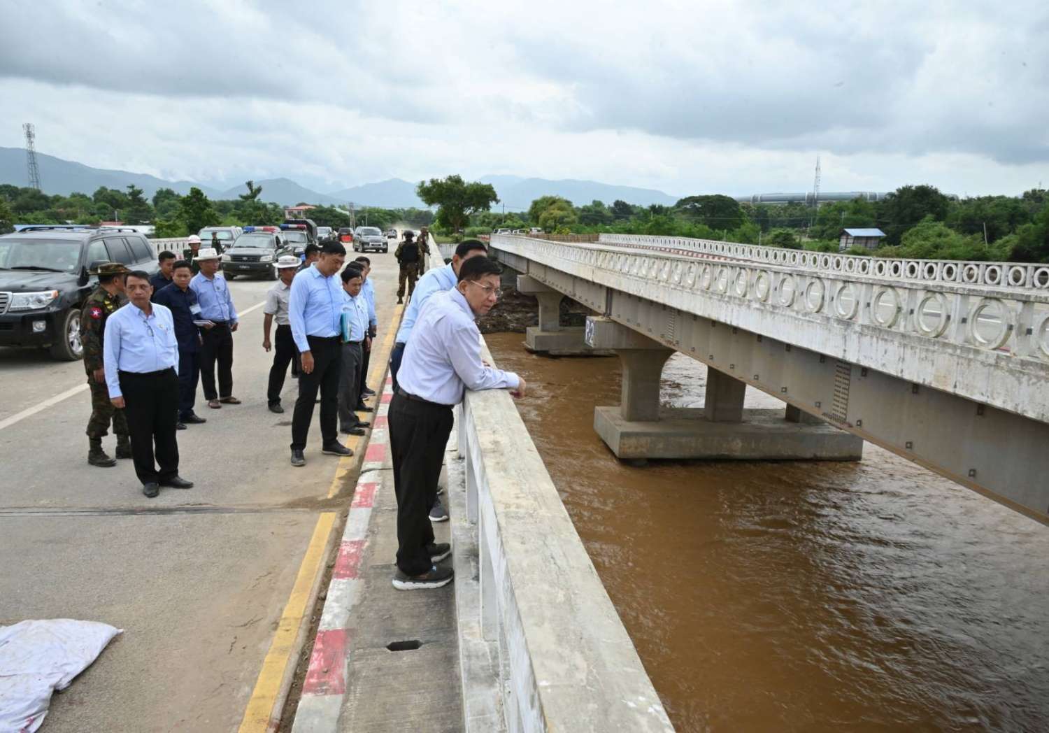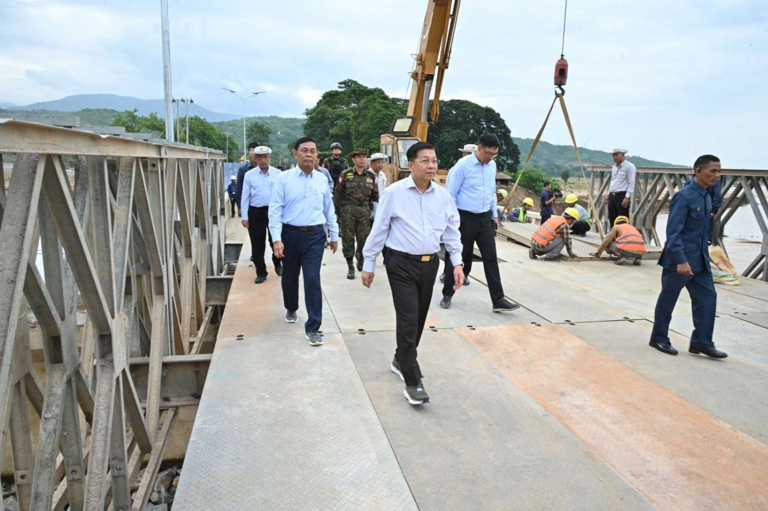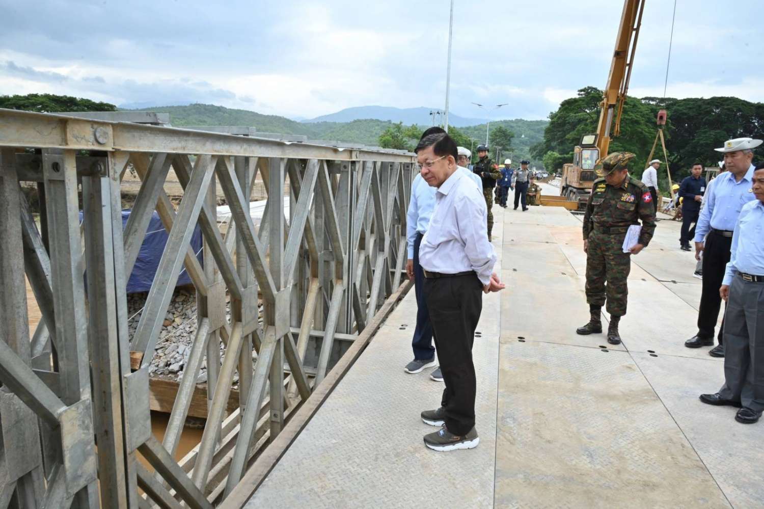 ထို့နောက် ဆက်လက်ပြီး နိုင်ငံတော်စီမံအုပ်ချုပ်ရေးကောင်စီဥက္ကဋ္ဌ နိုင်ငံတော်ဝန်ကြီးချုပ်နှင့် အဖွဲ့ဝင်များသည် ပြင်ဆင်တည်ဆောက်ပြီးစီးပြီဖြစ်သည့် ယာယီဘေလီတံတားပေါ်မှ မော်တော်ယာဉ်များဖြင့် မောင်းနှင်ဖြတ်သန်းခဲ့ပြီး ရေကြီးရေလျှံမှုကြောင့် ဖြစ်ပေါ်ခဲ့သည့် အပျက်အစီးများ ရှင်းလင်းခြင်းလုပ်ငန်း ဆောင်ရွက်နေမှုများကို လှည့်လည်ကြည့်ရှုစစ်ဆေးခဲ့ကြောင်း သတင်းရရှိသည်။