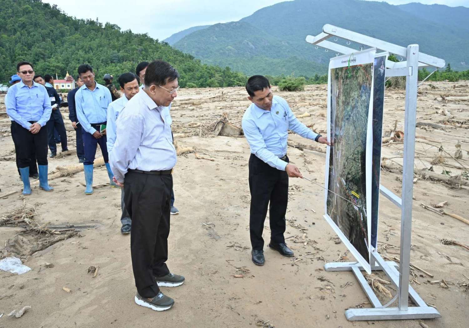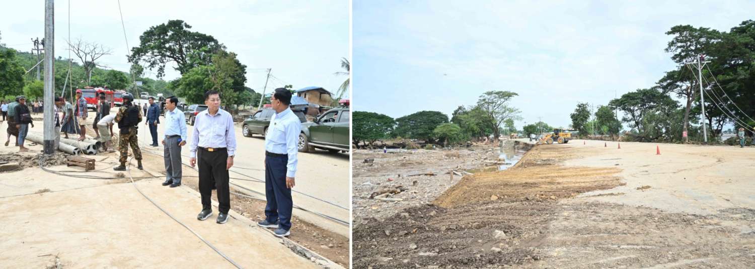 ဦးစွာ နိုင်ငံတော်စီမံအုပ်ချုပ်ရေးကောင်စီဥက္ကဋ္ဌ နိုင်ငံတော်ဝန်ကြီးချုပ်နှင့် အဖွဲ့ဝင်များသည် ဇေယျာသီရိမြို့နယ်မှ ရန်ကုန် - မန္တလေးလမ်းဟောင်းအတိုင်း မော်တော်ယာဉ်များဖြင့် ထွက်ခွာခဲ့ပြီး ဆင်သေချောင်းအတိုင်း ရေတိုက်စားမှုကြောင့် ကားလမ်းဘေး ရေတိုက်စားပျက်စီးနေမှုများ၊ ကုန်တင်ကားကြီးများနှင့် ခရီးသည်တင်ယာဉ်များ စောင့်ဆိုင်းနေရမှုအခြေအနေများကို ကြည့်ရှုစစ်ဆေးသည်။ ထို့နောက် နိုင်ငံတော်စီမံအုပ်ချုပ်ရေးကောင်စီဥက္ကဋ္ဌ နိုင်ငံတော်ဝန်ကြီးချုပ်နှင့် အဖွဲ့ဝင်များသည် နဝင်းချောင်းတံတား (အဆုံ) နေရာသို့ ရောက်ရှိကြပြီး ရေတိုက်စားမှုကြောင့် ပြိုကျပျက်စီးခဲ့မှုအား ယာယီဘေလီတံတား တည်ဆောက်ပြုပြင်နေမှုအခြေအနေများအား ကြည့်ရှုစစ်ဆေးရာ ဆောက်လုပ်ရေးဝန်ကြီးဌာန ပြည်ထောင်စုဝန်ကြီးနှင့် တာဝန်ရှိသူများက အများပြည်သူများ သွားလာမှုအဆင်ပြေစေရေးအတွက် အမြန်ဆုံးပြီးစီးနိုင်ရေး နေ့ညမပြတ် လုပ်ငန်းဆောင်ရွက်လျက်ရှိမှုအခြေအနေများကို ရှင်းလင်းတင်ပြသည်။ ရှင်းလင်းတင်ပြမှုများအပေါ် နိုင်ငံတော်စီမံအုပ်ချုပ်ရေးကောင်စီဥက္ကဋ္ဌ နိုင်ငံတော်ဝန်ကြီးချုပ်က ရေကြီးရေလျှံမှုကြောင့် ပျက်စီးမှုများ ဖြစ်ပေါ်ခဲ့ရသည့် လမ်းတံတား နေရာများအား အများပြည်သူသွားလာရေးအဆင်ပြေစေရန်နှင့် လမ်းပန်းဆက်သွယ်မှု မပြတ်တောက်စေရေး ပြန်လည်ပြုပြင်ခြင်းများကို အမြန်ဆုံးဆောင်ရွက်ပေးသွားရန်လိုကြောင်း၊ ယခုကဲ့သို့ မိုးအဆက်မပြတ်ရွာသွန်းပြီး ရေကြီးရေလျှံမှုဖြစ်ပေါ်ခဲ့ချိန်တွင် တံတားများ ထိခိုက်ပျက်စီးခဲ့မှုအပေါ် သင်ခန်းစာယူ၍ တံတားများ တည်ဆောက်ရာတွင် အရှိန်အဟုန်ဖြင့် ရေစီးဆင်းမှုဒဏ်ကို ခံနိုင်ရေးအတွက် စနစ်တကျထည့်သွင်းတွက်ချက်၍ ပြန်လည်ပြင်ဆင်ဆောင်ရွက်သွားရန်လိုကြောင်း၊ ထို့ပြင် တံတားကြီးနေရာများ၌ ရေဝင်ရောက်ရာလမ်းကြောင်းနှင့် ရေထွက်ရာလမ်းကြောင်းနေရာများကို ရေလမ်းကြောင်းဖြောင့်ခြင်းလုပ်ငန်းများ ဆောင်ရွက်သွားရန်လိုကြောင်းနှင့် အခြားလိုအပ်သည်များမှာကြားခဲ့ပြီး ရေဝင်ရောက်ခဲ့မှုအခြေအနေများနှင့် ယာယီဘေလီတံတားထိုးခြင်းလုပ်ငန်းဆောင်ရွက်နေမှုအခြေအနေများကို လိုက်လံကြည့်ရှုစစ်ဆေးသည်။