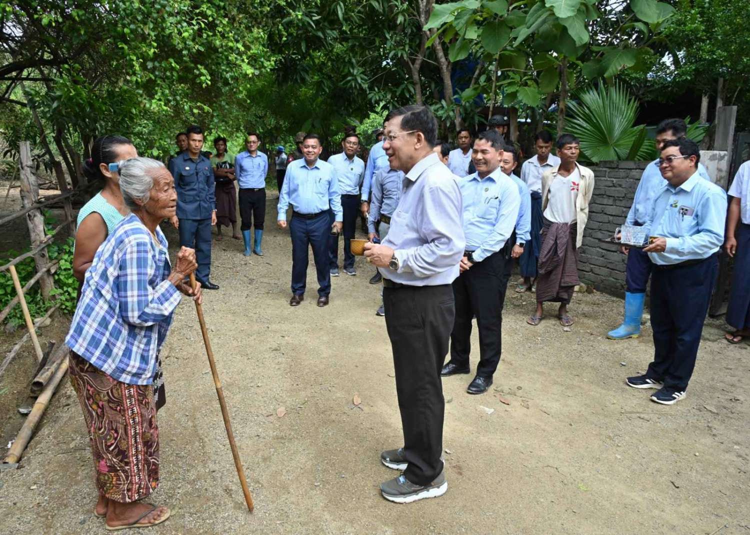 ထို့နောက် နိုင်ငံတော်စီမံအုပ်ချုပ်ရေးကောင်စီဥက္ကဋ္ဌ နိုင်ငံတော်ဝန်ကြီးချုပ်သည် ၃ မိုင်ကျေးရွာရှိ ဒေသခံပြည်သူများအား ရင်းရင်းနှီးနှီးနှုတ်ဆက်ကာ ရေကြီးရေလျှံမှုဖြစ်ပေါ်ခဲ့မှုအခြေအနေများကို မေးမြန်းအားပေးစကားပြောကြားသည်။