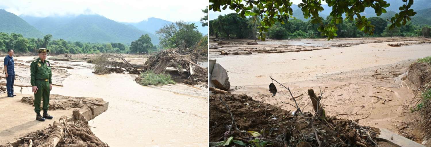 ထို့နောက် တောင်ကျချောင်းရေများ အလုံးအရင်းဖြင့် စီးဆင်းခဲ့မှုကြောင့် ကျိုးကျပျက်စီးခဲ့သည့် မုန်ချောင်းကူးကွန်ကရစ်တံတားပျက်စီးမှုများအား သွားရောက်ကြည့်ရှုစစ်ဆေးရာ တာဝန်ရှိသူများက ရေစီးကြောင်းနှင့်အတူ သစ်ပင်သစ်လုံးကြီးများ၊ ကျောက်တုံးများမျောပါခဲ့ပြီး အရှိန်အဟုန်ဖြင့်ရိုက်ခတ်ခဲ့မှုကြောင့် တံတားပျက်စီးခဲ့မှုများကို တင်ပြကြသည်။ တင်ပြချက်များအပေါ် နိုင်ငံတော်စီမံအုပ်ချုပ်ရေးကောင်စီဥက္ကဋ္ဌ တပ်မတော်ကာကွယ်ရေးဦးစီးချုပ်က လိုအပ်သည်များမှာကြားကာ ကူညီကယ်ဆယ်ရေးလုပ်ငန်းဆောင်ရွက်နေမှုများကို ကြည့်ရှုသည်။
