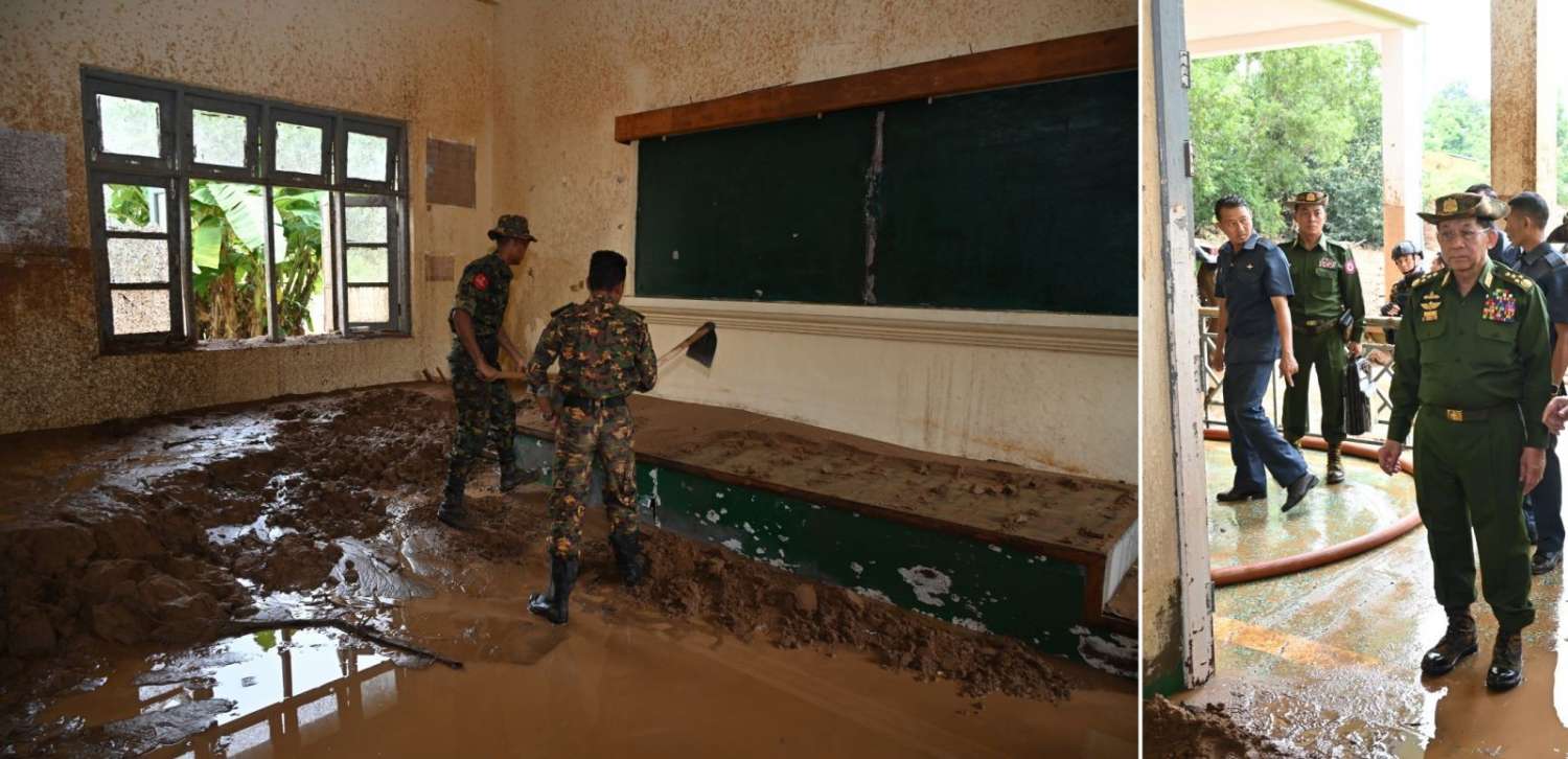 ယင်းနောက် နိုင်ငံတော်စီမံအုပ်ချုပ်ရေးကောင်စီဥက္ကဋ္ဌ တပ်မတော်ကာကွယ်ရေးဦးစီးချုပ်နှင့် အဖွဲ့ဝင်များသည် ရေကြီးရေလျှံမှုများကြောင့် ထိခိုက်ပျက်စီးခဲ့ပြီး ရေများပြန်လည်ကျဆင်းသွားသည့်အချိန်တွင် နုန်းတင်ကျန်ခဲ့သည့် အထက်တန်းကျောင်း၌ နုန်းများဖယ်ရှားရှင်းလင်းခြင်းနှင့် သန့်ရှင်းရေးလုပ်ငန်းဆောင်ရွက်နေမှုများကို သွားရောက်ကြည့်ရှုစစ်ဆေးရာ ကျောင်းတာဝန်ခံ ဆရာ၊ ဆရာမများက ရေကြီးရေလျှံမှု ဖြစ်ပေါ်ခဲ့အခြေအနေများနှင့် သန့်ရှင်းရေးလုပ်ငန်းဆောင်ရွက်နေမှုတို့ကို ရှင်းလင်းတင်ပြကြသည်။ ရှင်းလင်းတင်ပြမှုများအပေါ် နိုင်ငံတော်စီမံအုပ်ချုပ်ရေးကောင်စီဥက္ကဋ္ဌ တပ်မတော်ကာကွယ်ရေးဦးစီးချုပ် ကျောင်းပြန်လည်ဖွင့်လှစ် သင်ကြားပေးနိုင်ရေးအတွက် လိုအပ်သည်များကို အမြန်ဆုံးဆောင်ရွက်ပေးသွားရန် တာဝန်ရှိသူများကိုမှာကြားသည်။
