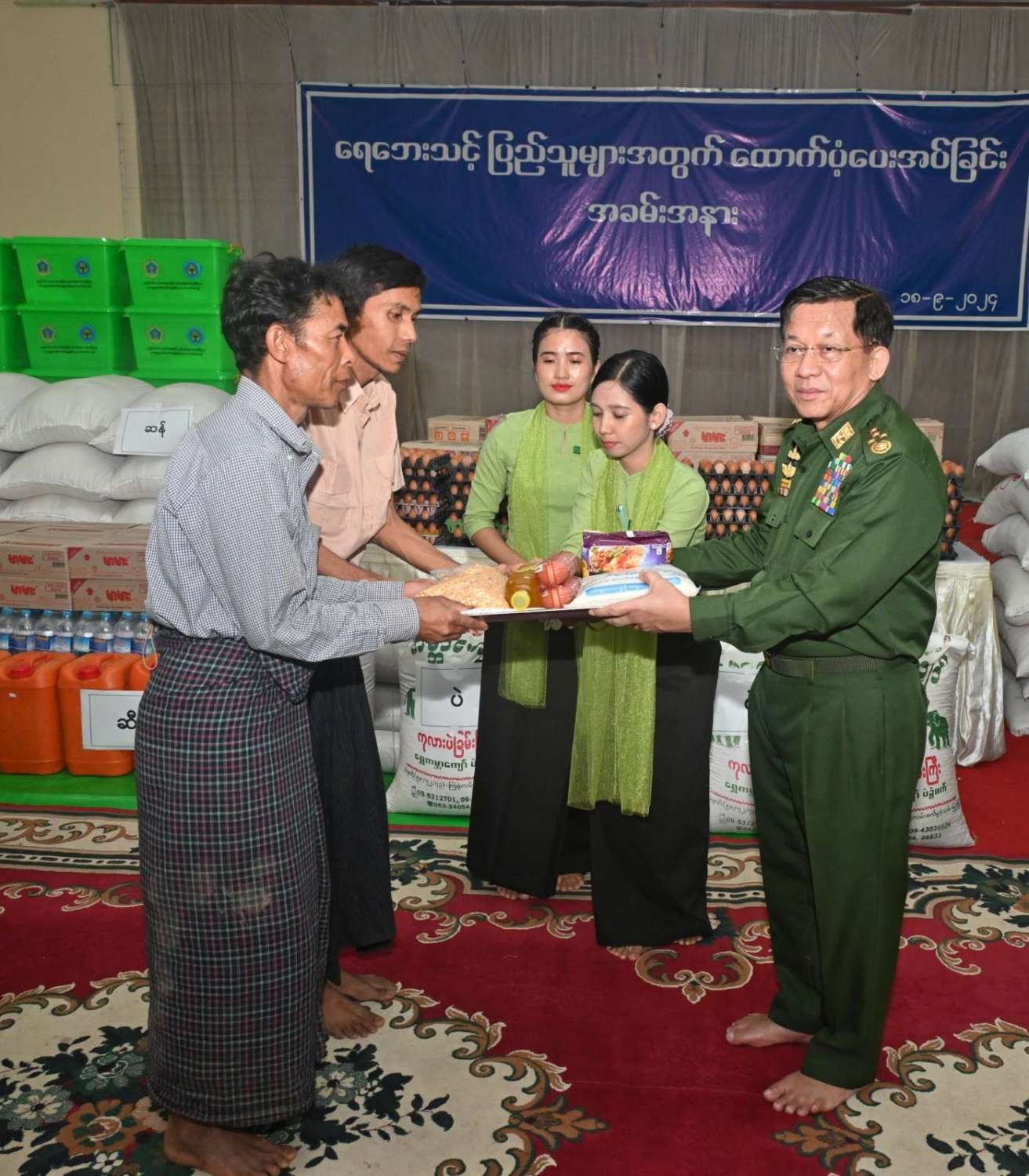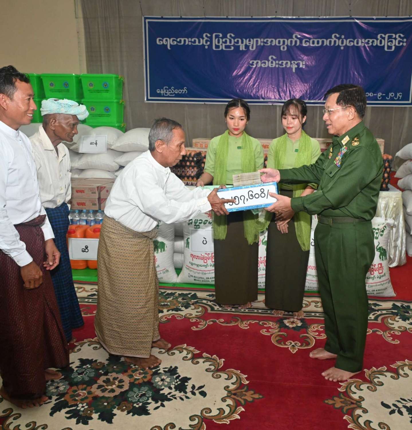 ထို့နောက် နိုင်ငံတော်စီမံအုပ်ချုပ်ရေးကောင်စီဥက္ကဋ္ဌ တပ်မတော်ကာကွယ်ရေးဦးစီးချုပ် ရေဘေးသင့်ပြည်သူများအတွက် ထောက်ပံ့ငွေနှင့်စားသောက်ဖွယ်ရာ ပစ္စည်းများကိုပေးအပ်ရာ ရေဘေးသင့်ပြည်သူများကိုယ်စား ကိုယ်စားလှယ်များက လက်ခံရယူသည်။
