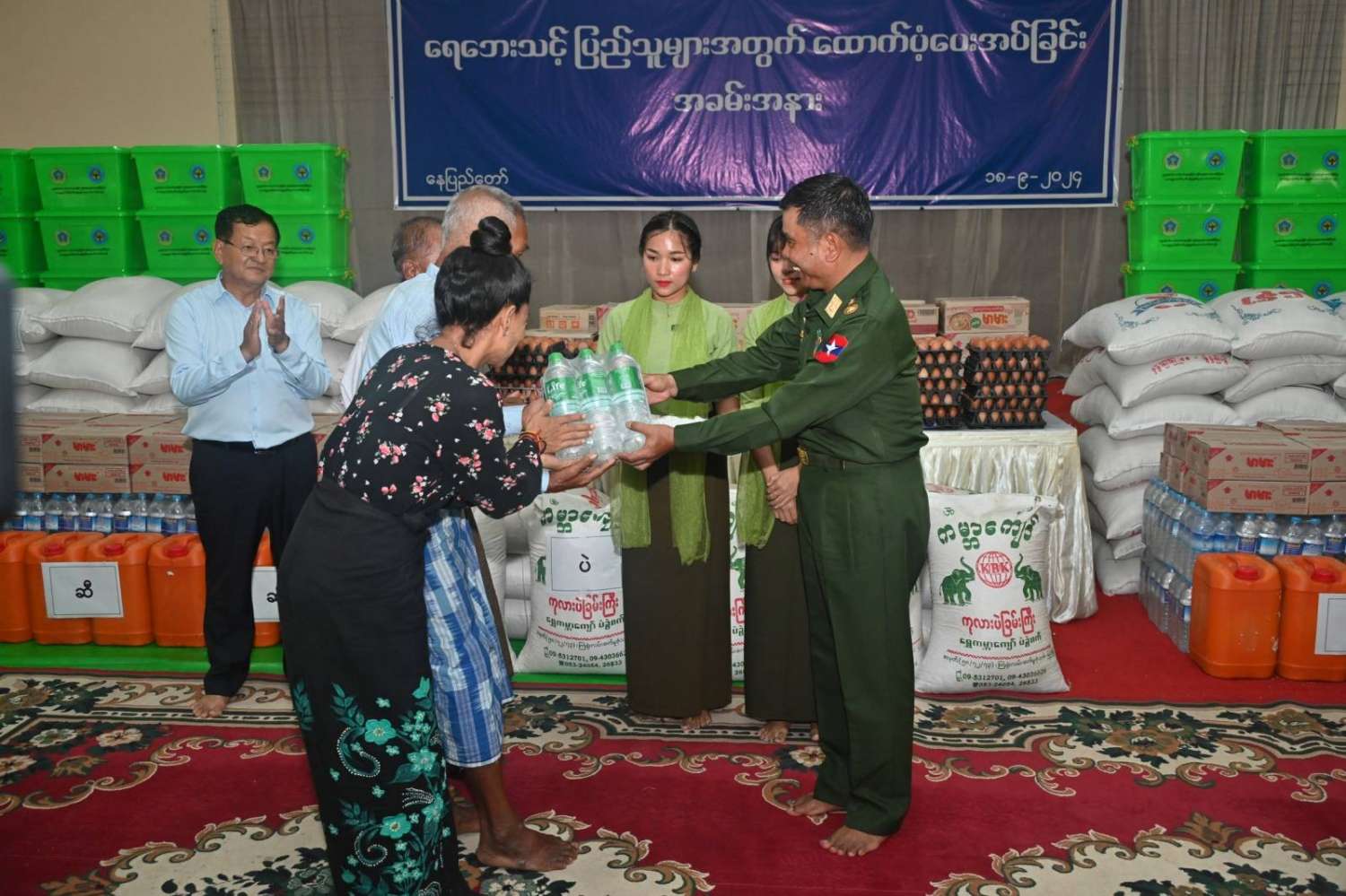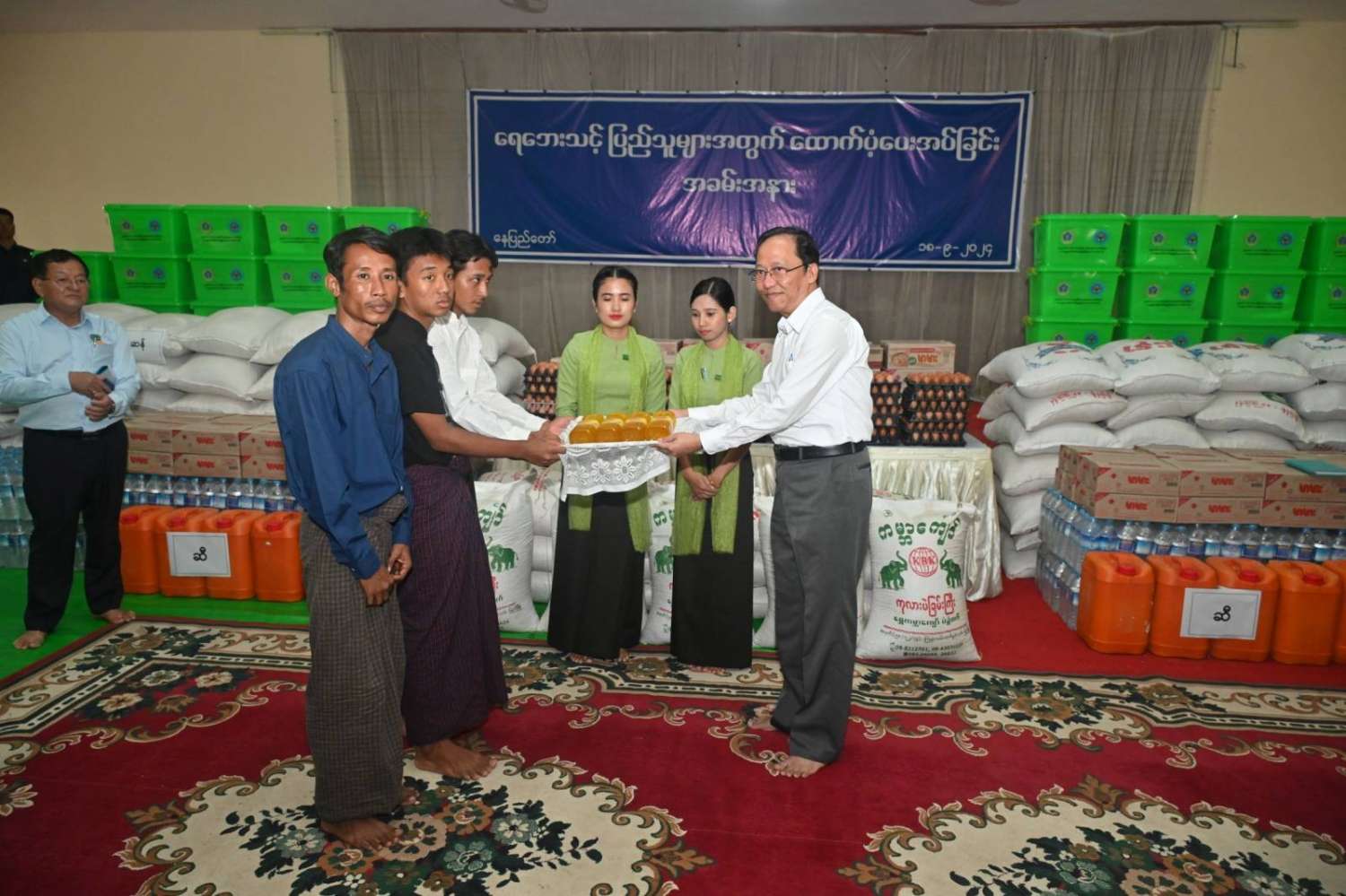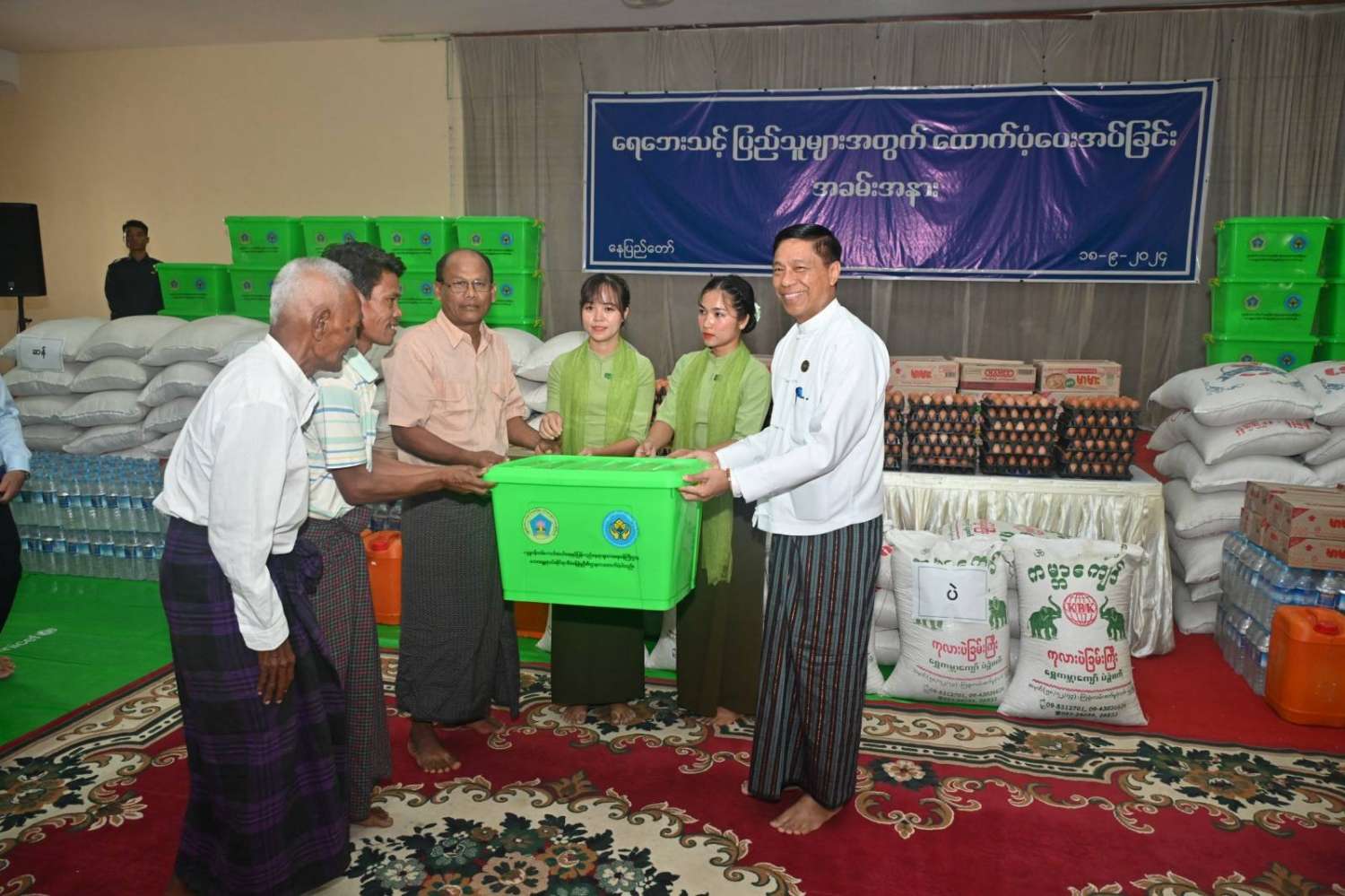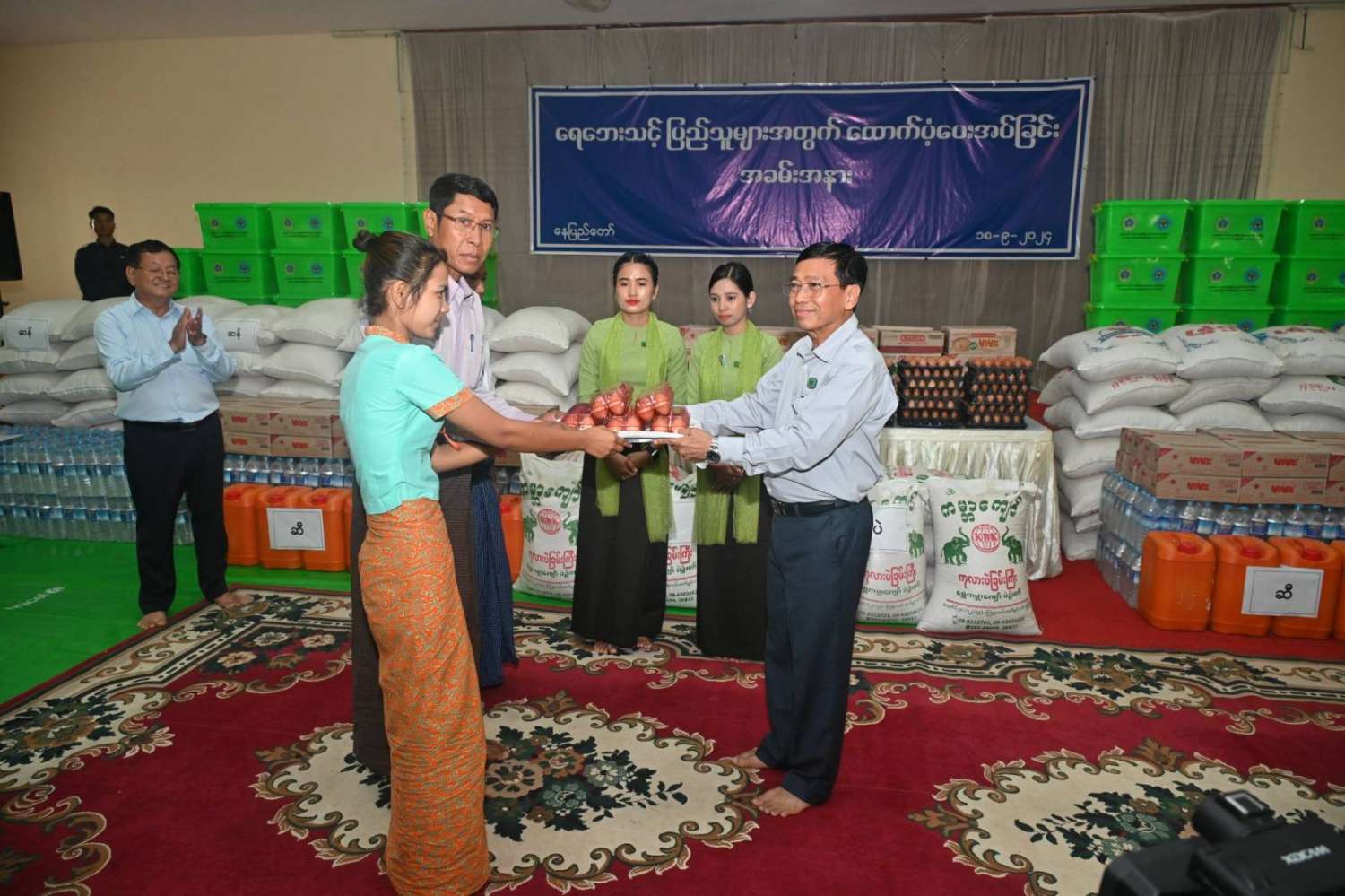ဆက်လက်ပြီး ကောင်စီတွဲဖက်အတွင်းရေးမှူး၊ ကျန်းမာရေးဝန်ကြီးဌာန ပြည်ထောင်စုဝန်ကြီး၊ လူမှုဝန်ထမ်း၊ ကယ်ဆယ်ရေးနှင့်ပြန်လည်နေရာချထားရေးဝန်ကြီးဌာန ပြည်ထောင်စုဝန်ကြီး၊ နေပြည်တော်ကောင်စီဥက္ကဋ္ဌ၊ ကာကွယ်ရေးဦးစီးချုပ်ရုံးမှ တပ်မတော်အရာရှိကြီးတို့က ရေဘေးသင့်ပြည်သူများအတွက် ထောက်ပံ့ရေးပစ္စည်းများနှင့် စားသောက်ဖွယ်ရာပစ္စည်းများကို အသီးသီးထောက်ပံ့ပေးအပ်ကြသည်။
