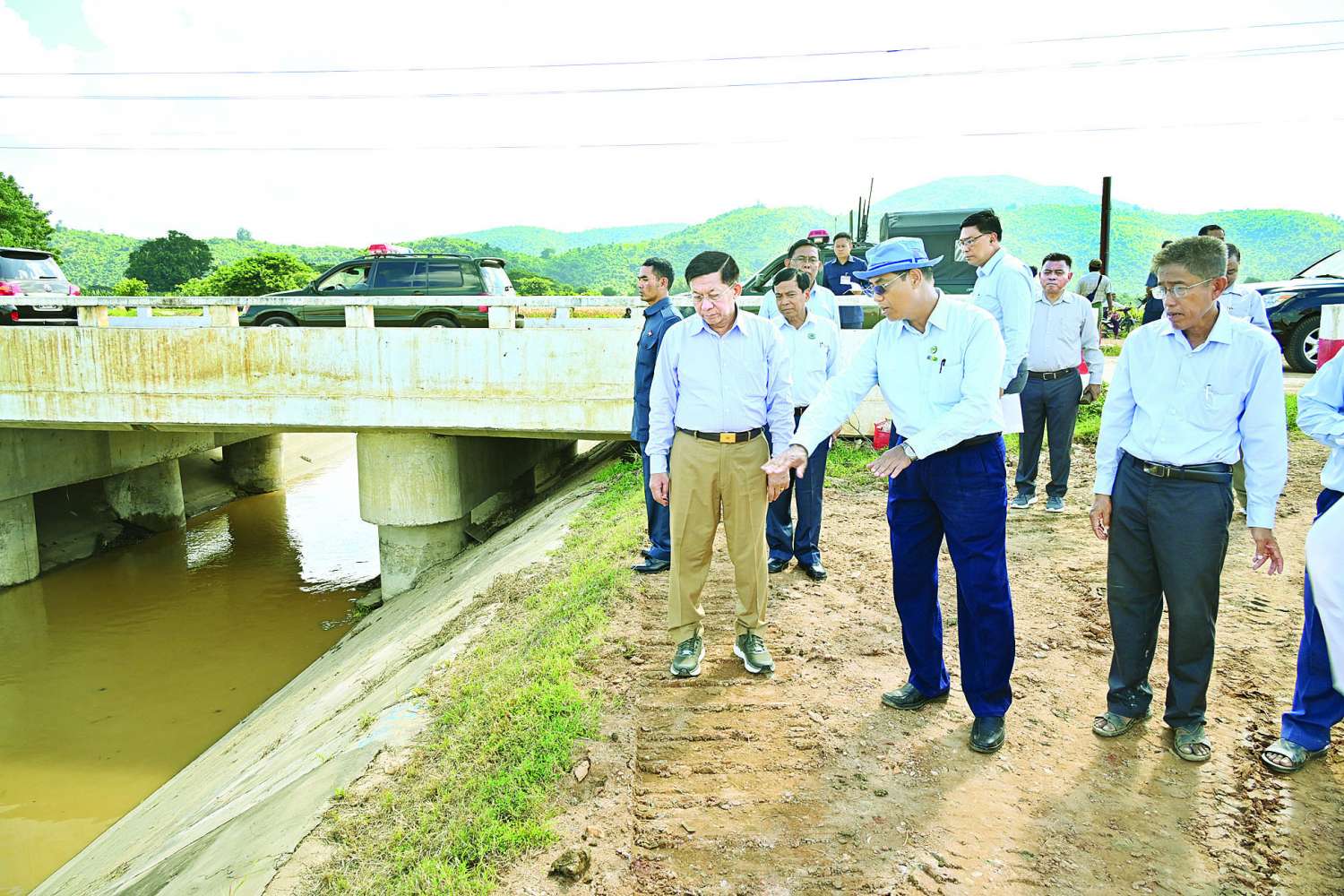 ဦးစွာ နိုင်ငံတော်စီမံအုပ်ချုပ်ရေးကောင်စီဥက္ကဋ္ဌ နိုင်ငံတော်ဝန်ကြီးချုပ်နှင့် အဖွဲ့ဝင်များသည် မွန်းတည့်ခွင် - ကျည်တောင် - ခေါမ - ညောင်ပင်သာလမ်းကြောင်းတစ်လျှောက် မော်တော်ယာဉ်များဖြင့် လှည့်လည်ကြည့်ရှုသည်။ ထို့နောက် ပျဉ်းမနားမြို့နယ် ပေါင်းလောင်းမြစ်ကူးတံတား (အဝေရာ) သို့ ရောက်ရှိရာ ဆောက်လုပ်ရေးဝန်ကြီးဌာန ပြည်ထောင်စုဝန်ကြီးက အဆိုပါလမ်းပိုင်းတစ်လျှောက်၌ ရေကြီးရေလျှံမှုဖြစ်ပေါ်စဉ် ထိခိုက်ပျက်စီးခဲ့မှုများနှင့် ပြန်လည်ပြုပြင် ဆောင်ရွက်လျက်ရှိမှုအခြေအနေများကို ရှင်းလင်းတင်ပြသည်။ ရှင်းလင်းတင်ပြမှုများအပေါ် နိုင်ငံတော်စီမံအုပ်ချုပ်ရေးကောင်စီဥက္ကဋ္ဌ နိုင်ငံတော်ဝန်ကြီးချုပ်က ယခုလမ်းပိုင်းသည် ပျဉ်းမနားခရိုင်နှင့် ဇေယျာသီရိခရိုင်အကြား ဆက်သွယ်ထားပြီး လူနေများသည့်ကျေးရွာများရှိသဖြင့် သဘာဝဘေးဒဏ်ကြောင့် ပျက်စီးမှုများအား ပြုပြင်၍ လမ်းပန်းဆက်သွယ်မှုကောင်းမွန်အောင် ဆောင်ရွက်ရန်လိုကြောင်းနှင့် လမ်းပိုင်းနှင့် တံတားအား အဆင့်မြှင့်တင်နိုင်မည့်အခြေအနေများ နှင့်ပတ်သက်၍ လိုအပ်သည်များ မှာကြားသည်။