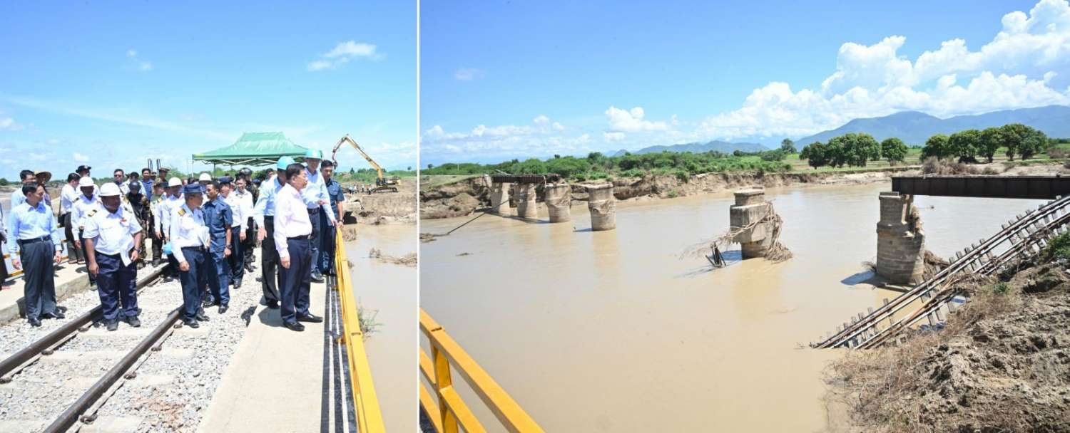 ယင်းနောက် နိုင်ငံတော်စီမံအုပ်ချုပ်ရေးကောင်စီဥက္ကဋ္ဌ နိုင်ငံတော်ဝန်ကြီးချုပ်နှင့် အဖွဲ့ဝင်များသည် ရေကြီးရေလျှံမှုဖြစ်ပေါ်စဉ် ရေအလုံးအရင်းဖြင့် မြင့်တက်တိုက်စားခဲ့မှုကြောင့် တံတားအမှတ် ၆၉၁(အဆန်)၏ ရန်ကုန်ဘက်ခြမ်းတံတား ချဉ်းကပ်တာဘောင် ရေတိုက်စားပျက်စီးခဲ့မှုအား ရထားလမ်းဖြုတ်သိမ်း၍ စက်ယာဉ်ယန်တရားများဖြင့် တာဘောင်မြေဖို့ပြုပြင်ဆောင်ရွက်ခြင်းနှင့် သံလမ်းပြန်လည်ခင်းခြင်းလုပ်ငန်းဆောင်ရွက်နေမှု၊ တံတားအမှတ် ၆၉၁(အစုန်)၏ သံဘောင် ၄ ခုပြုတ်ကျခဲ့ပြီး တိုင်အမှတ် ၃ ရေစီးအားဖြင့် မျောပါပျက်စီးခဲ့မှုအား Triple Double Bailey တံတား (၉၀) ပေထိုး၍ ပြန်လည်ပြုပြင်ဆောင်ရွက်နေမှုလုပ်ငန်းခွင်သို့ နေရာရောက်ရှိပြီး လုပ်ငန်းဆောင်ရွက်နေမှုအခြေအနေများနှင့် ရေစီးအားကြောင့် ထိခိုက်ပျက်စီးခဲ့မှုများကို လိုက်လံကြည့်ရှုစစ်ဆေးကာ လုပ်ငန်းဆောင်ရွက်နေသူများအား ရင်းရင်းနှီးနှီးနှုတ်ဆက်သည်။