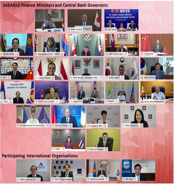 ရှေးဦးစွာ IMF  ADB  နှင့်  AMRO တို့မှ ကမ္ဘာတစ်ဝှမ်းနှင့် ဒေသတွင်းလတ်တလောစီးပွားရေး အခြေအနေနှင့် အလားအလာများ၊ ကိုဗစ်-၁၉ နှင့်စပ်လျဉ်းသည့် စိန်ခေါ်မှုများနှင့် ဆုံးရှုံးနိုင် ခြေများ အပေါ် မူဝါဒဆိုင်ရာ တုံ့ပြန်ချက်များကို တင်ပြခဲ့ကြကာ တင်ပြချက်များနှင့်စပ်လျဉ်း၍ အစည်း အဝေးတက်ရောက်လာကြသူများမှ အမြင်ချင်းဖလှယ်ဆွေးနွေးခဲ့ကြပြီး၊ အစည်းအဝေး တက်ရောက် လာကြသည့်  အာဆီယံ+ ဘဏ္ဍာရေးဝန်ကြီးများနှင့် ဗဟိုဘဏ်ဥက္ကဋ္ဌများမှ မိမိတို့နိုင်ငံများ အလိုက် ကိုဗစ်-၁၉ ကြောင့်ဖြစ်ပေါ်လာသည့် လတ်တလောစီးပွားရေး အခြေအနေနှင့် စီးပွားရေးအပေါ် သက်ရောက်မှုများကို အနည်းဆုံးဖြစ်စေရန်နှင့် လျင်မြန်စွာ ပြန်လည်ဦးမော့နိုင်စေရန်အတွက် ဆောင်ရွက်မှုများနှင့် စပ်လျဉ်း၍ တင်ပြကြသည်။