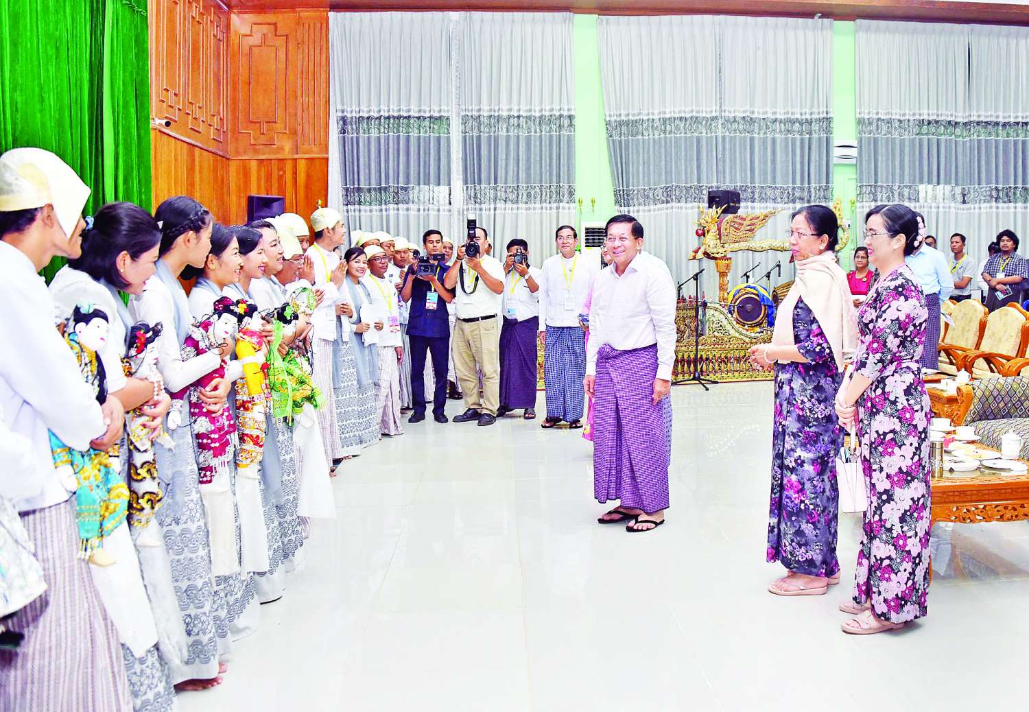နိုင်ငံတော်စီမံအုပ်ချုပ်ရေးကောင်စီဥက္ကဋ္ဌ နိုင်ငံတော်ဝန်ကြီးချုပ်နှင့်ဇနီးတို့သည် ရုပ်စုံသဘင်အဖွဲ့လိုက် အကဲဖြတ်ဒိုင်အဖွဲ့ဝင်များနှင့် ပြိုင်ပွဲဝင်များကို ရင်းရင်းနှီးနှီး လိုက်လံနှုတ်ဆက်ကြသည်။