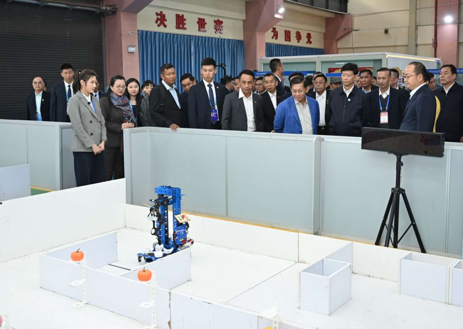 ထို့နောက် နိုင်ငံတော်စီမံအုပ်ချုပ်ရေးကောင်စီဥက္ကဋ္ဌ နိုင်ငံတော်ဝန်ကြီးချုပ်နှင့် အဖွဲ့ဝင်များသည် ကောလိပ်အတွင်းရှိ Electromechnical Training Centre အတွင်း ကမ္ဘာ့အဆင့်အတတ်ပညာဆိုင်ရာ ပြိုင်ပွဲများ၊ ပြပွဲများတွင် ဝင်ရောက်ယှဉ်ပြိုင်ခဲ့ကြသည့် နည်းပညာရပ်ဆိုင်ရာများ၊ ပြိုင်ပွဲများတွင် ဆုရရှိခဲ့သည့် အဆင့်မြင့်နည်းပညာအသုံးပြု စက်ကိရိယာများ ခင်းကျင်းပြသထားရှိမှု၊ China's Training Base For Worldskills Competition Information Network Cabling အတွင်း ကေဘယ်ဆိုင်ရာ လေ့ကျင့်ဆောင်ရွက်နေမှုများကို လှည့်လည်ကြည့်ရှုအားပေးပြီး သိရှိလိုသည်များကို မေးမြန်းဆွေးနွေးရာ တာဝန်ရှိသူများက လိုက်လံရှင်းလင်းပြသကြသည်။