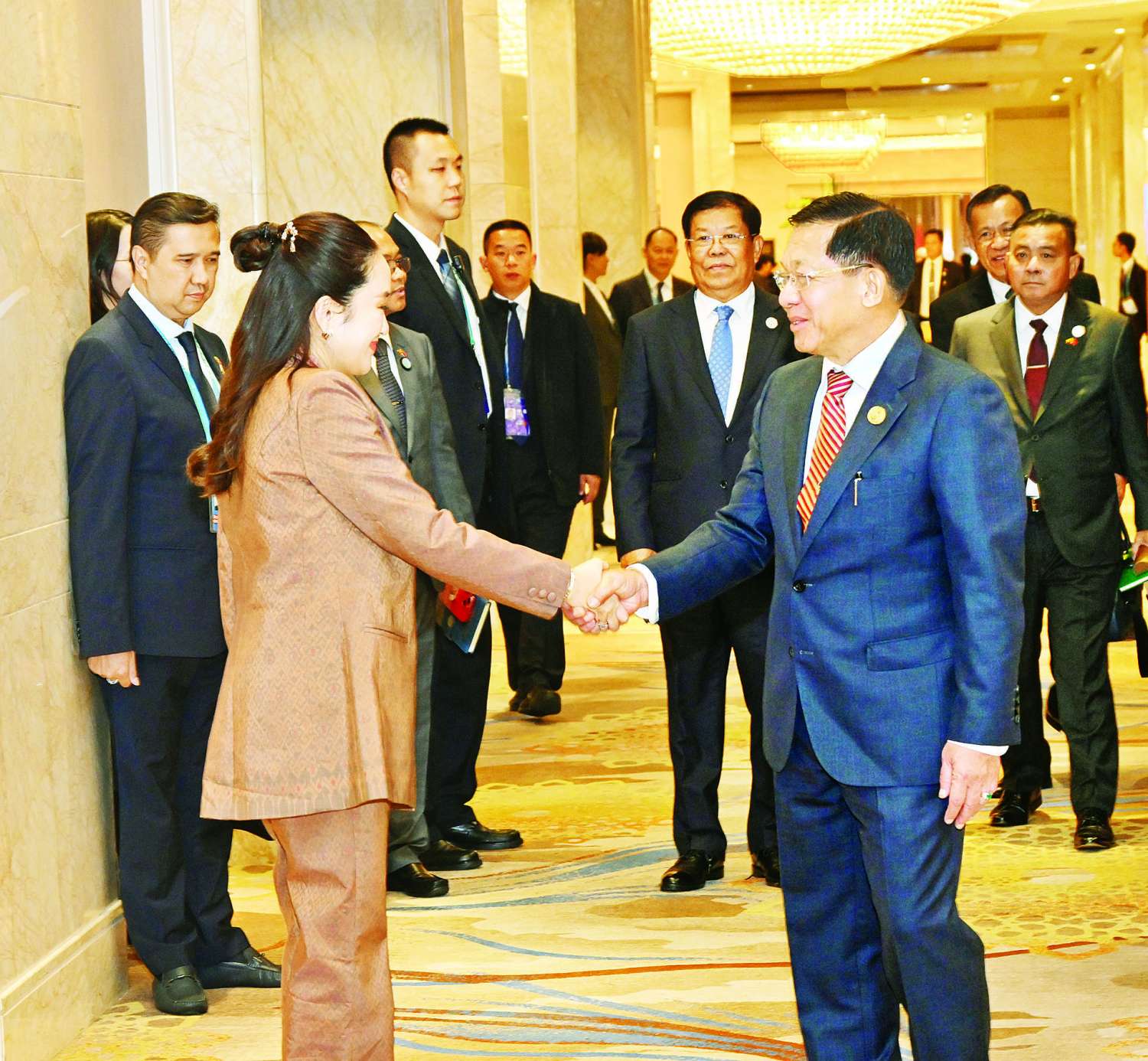 နိုင်ငံတော်စီမံအုပ်ချုပ်ရေးကောင်စီဥက္ကဋ္ဌ နိုင်ငံတော်ဝန်ကြီးချုပ် ဗိုလ်ချုပ်မှူးကြီး မင်းအောင်လှိုင်သည် နိုဝင်ဘာ ၇ ရက် မွန်းလွဲပိုင်းတွင် တရုတ်ပြည်သူ့သမ္မတနိုင်ငံ၊ ကူမင်းမြို့၌ ကျင်းပပြုလုပ်သည့် အဋ္ဌမအကြိမ်မြောက် မဟာမဲခေါင်ဒေသခွဲ ထိပ်သီးအစည်းအဝေးအပါအဝင် ထိပ်သီးအစည်းအဝေးများသို့ တက်ရောက်လာသည့် ထိုင်းနိုင်ငံဝန်ကြီးချုပ် H.E. Ms. Paetongtarn Shinawatra နှင့် ကူမင်းမြို့ရှိ Wyndham Grand ဟိုတယ်၌ တွေ့ဆုံဆွေးနွေးသည်။