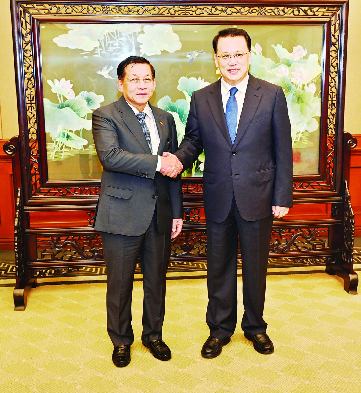 တရုတ်ပြည်သူ့သမ္မတနိုင်ငံ၊ ချုံချင့်မြို့သို့ရောက်ရှိနေသည့် နိုင်ငံတော်စီမံအုပ်ချုပ်ရေးကောင်စီဥက္ကဋ္ဌ နိုင်ငံတော်ဝန်ကြီးချုပ် ဗိုလ်ချုပ်မှူးကြီး မင်းအောင်လှိုင်သည် တရုတ်ကွန်မြူနစ်ပါတီဗဟိုကော်မတီအဖွဲ့ဝင်၊ ချုံချင့်မြူနီစီပယ်ပါတီကော်မတီအတွင်းရေးမှူး Mr. Yuan Jiajun နှင့် ယနေ့ညနေပိုင်းတွင် Yuzhou Hotel ဧည့်ခန်းမဆောင်၌ တွေ့ဆုံဆွေးနွေးသည်။