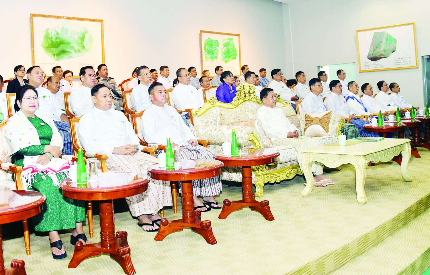 ထို့နောက် နိုင်ငံတော်စီမံအုပ်ချုပ်ရေးကောင်စီဥက္ကဋ္ဌ နိုင်ငံတော်ဝန်ကြီးချုပ်နှင့် အဖွဲ့ဝင်များသည် ပုဂ္ဂလိကကျောက်မျက်ရတနာ အချောထည်အရောင်းပြခန်းများ ဖွင့်လှစ်ရောင်းချနေမှုကို လိုက်လံကြည့်ရှုအားပေးပြီး ခန်းမအပြင်ဘက်တွင် ခင်းကျင်းပြသထားသည့် ကျောက်စိမ်းရိုင်းအတွဲများကို လိုက်လံကြည့်ရှုစစ်ဆေးသည်။