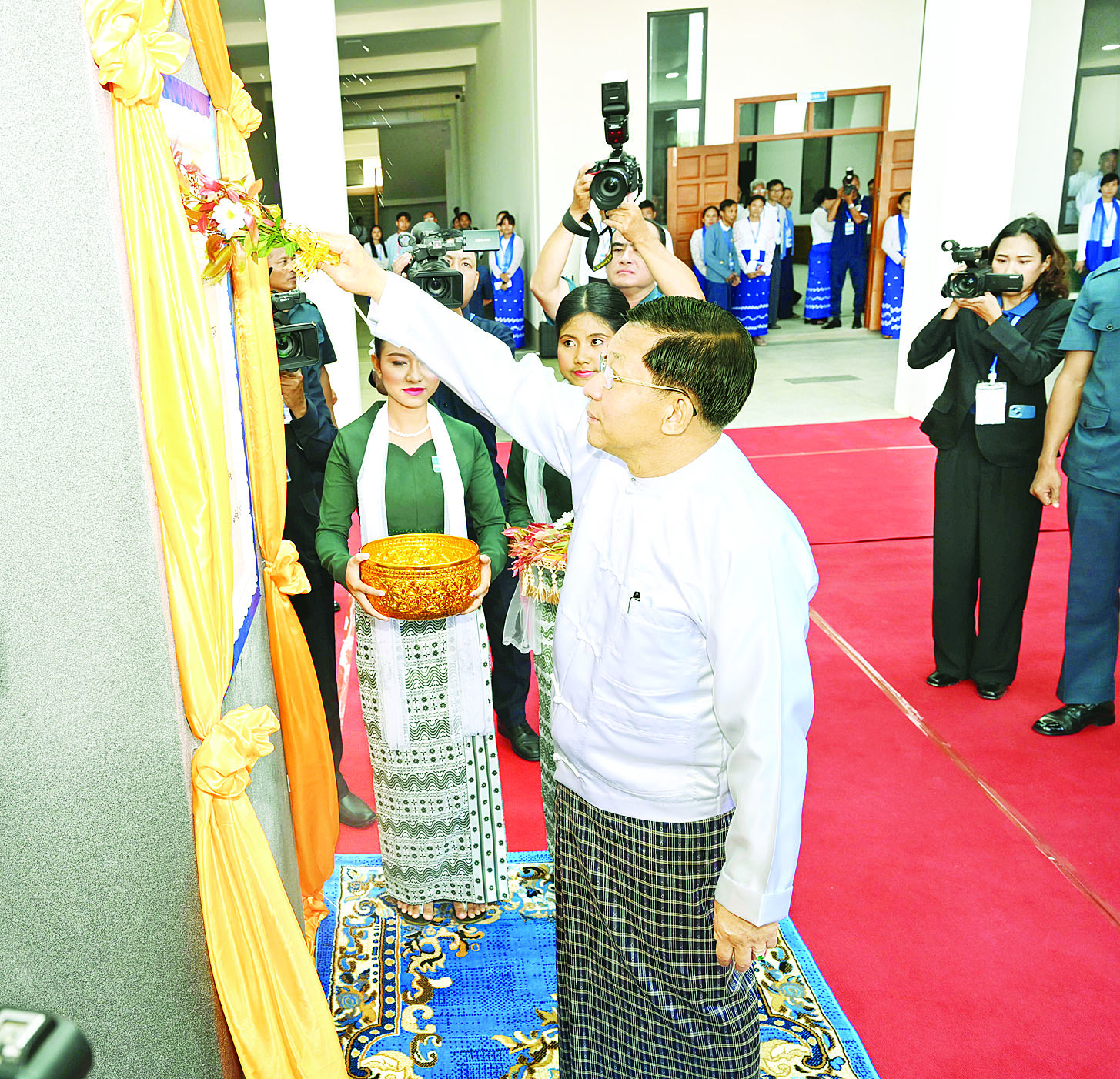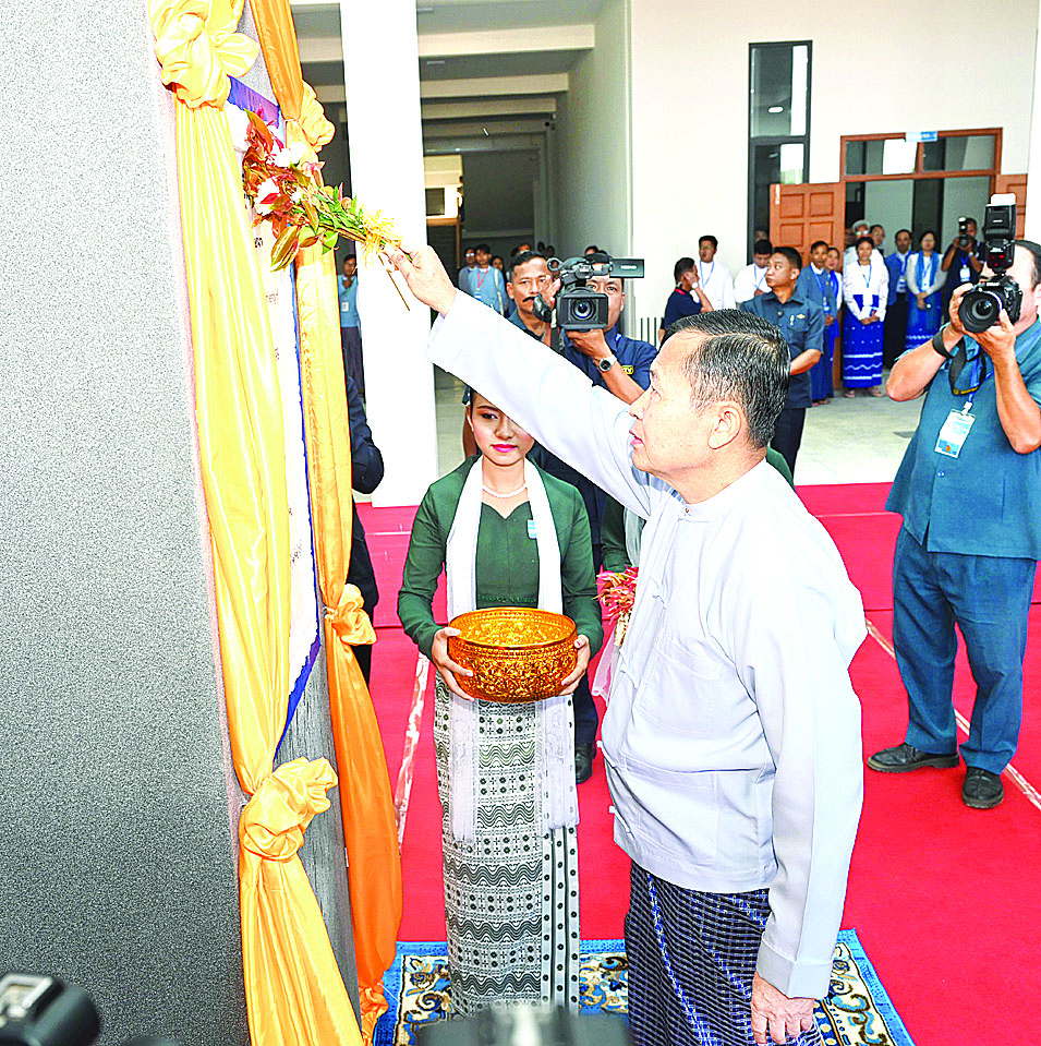 ထို့နောက် နိုင်ငံတော်စီမံအုပ်ချုပ်ရေးကောင်စီဥက္ကဋ္ဌ နိုင်ငံတော်ဝန်ကြီးချုပ်သည် Naypyitaw State Polytechnic University ကမ္ပည်းမော်ကွန်းကို အမွှေးနံ့သာရည်များ ပက်ဖျန်းပေးသည်။