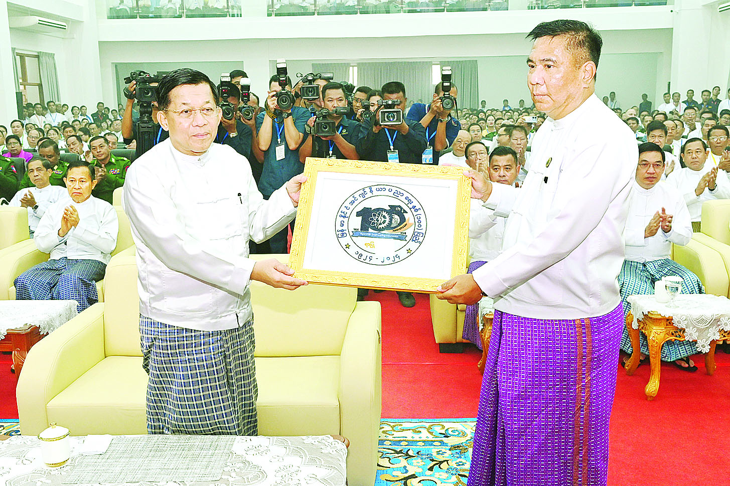 ထို့နောက် နိုင်ငံတော်စီမံအုပ်ချုပ်ရေးကောင်စီဥက္ကဋ္ဌ နိုင်ငံတော်ဝန်ကြီးချုပ်နှင့် အခမ်းအနားတက်ရောက်လာကြသူများသည် မြန်မာနိုင်ငံအင်ဂျင်နီယာပညာရေးသမိုင်းကြောင်းဆိုင်ရာ မှတ်တမ်းတင် Documentary အား ကြည့်ရှုအားပေးကြသည်။ ယင်းနောက် နိုင်ငံတော်စီမံအုပ်ချုပ်ရေးကောင်စီဥက္ကဋ္ဌ နိုင်ငံတော်ဝန်ကြီးချုပ်ထံသို့ သိပ္ပံနှင့်နည်းပညာဝန်ကြီးဌာန ပြည်ထောင်စုဝန်ကြီး ဒေါက်တာမျိုးသိန်းကျော်က မြန်မာနိုင်ငံအင်ဂျင်နီယာပညာရေး နှစ် (၁၀၀) ပြည့် ရာပြည့်သဘင်အထိမ်းအမှတ် အမှတ်တရလက်ဆောင်ပစ္စည်းကို ဂါရဝပြုပေးအပ်သည်။