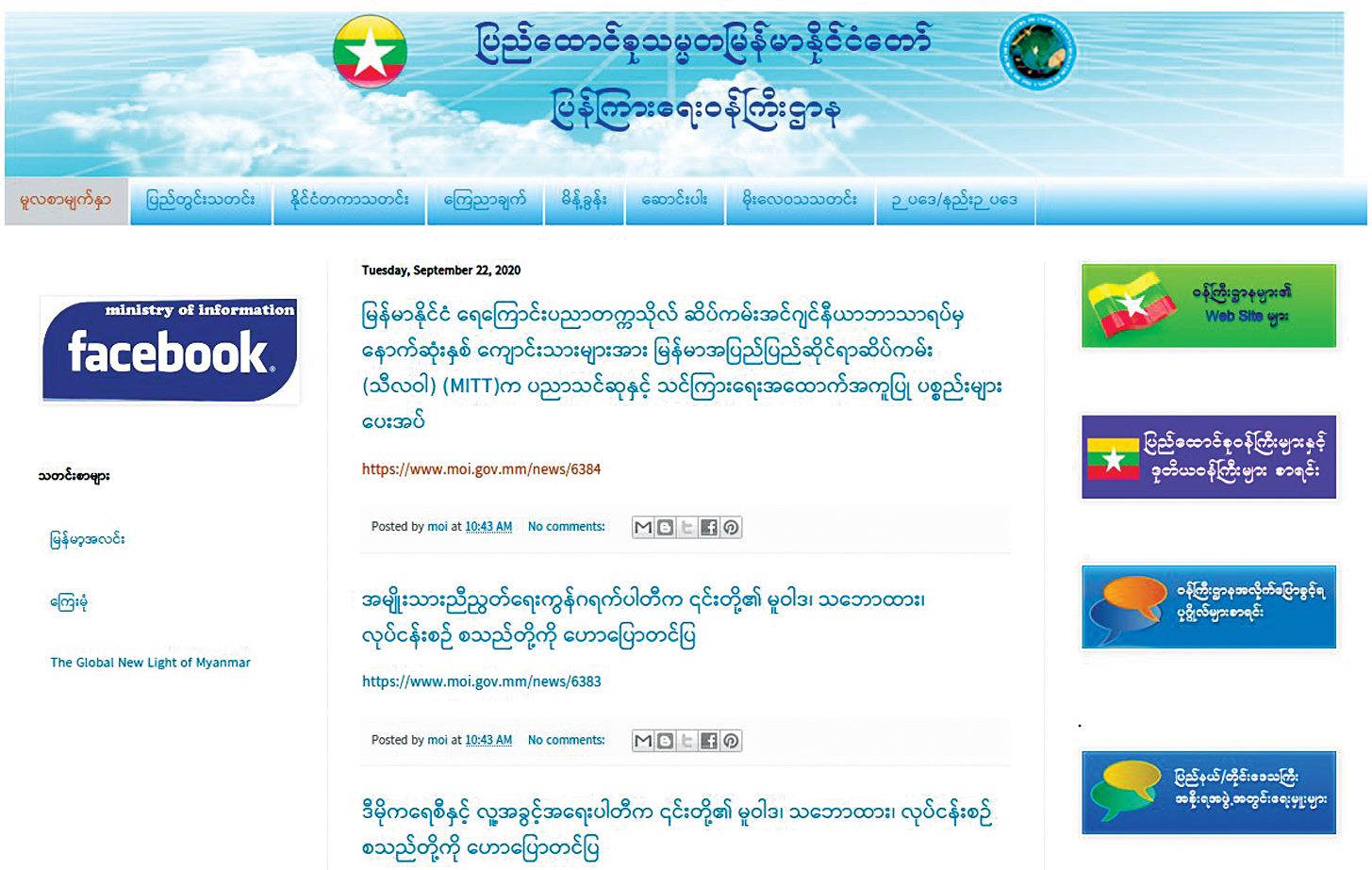 ဥပဒေတွေ၊ ကြေညာချက်တွေ၊ အရေးပေါ်သတိပေး ချက်တွေ၊ ကျန်းမာရေးအသိပေးချက်တွေ စတာတွေကို ပြည်သူတွေသိအောင် ပြန်ကြားရေးဝန်ကြီးဌာနရဲ့ အဓိက ဝက်ဘ်ဆိုက်အပြင် မြန်မာနိုင်ငံမှာ လူသုံးများပြီး ပြည်သူအကြား ပျံ့နှံ့လွယ်တဲ့ social media platform တွေကနေ သတင်းအချက်အလက်တွေ ထုတ်ပြန်ပေး နေတာလည်း ဖြစ်ပါတယ်။ MOI Webportal Myanmar ဆိုပြီး ဖေ့စ်ဘွတ်ကနေလည်း နေ့စဉ် သတင်းဦး၊ သတင်း ထူးတွေကို တင်ဆက်ပေးနေတာပါ။