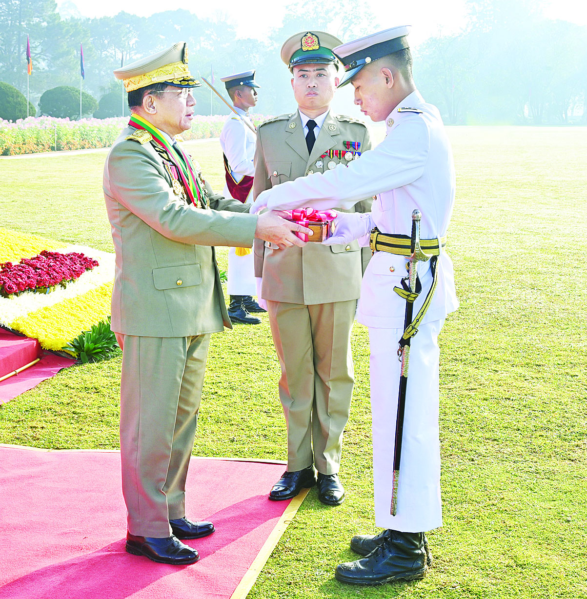 ဦးစွာ နိုင်ငံတော်စီမံအုပ်ချုပ်ရေးကောင်စီဥက္ကဋ္ဌ တပ်မတော်ကာကွယ်ရေးဦးစီးချုပ် ဗိုလ်ချုပ်မှူးကြီး သတိုးမဟာသရေစည်သူ သတိုးသီရိသုဓမ္မ မင်းအောင်လှိုင် က ဗိုလ်လောင်းတပ်ခွဲများ၏ အလေးပြုခြင်းကိုခံယူပြီး ကျောင်းဆင်းဗိုလ်လောင်းတပ်ခွဲအား စစ်ဆေးသည်။ ထို့နောက် ဗိုလ်လောင်းတပ်ခွဲများက နိုင်ငံတော်စီမံအုပ်ချုပ်ရေးကောင်စီဥက္ကဋ္ဌ တပ်မတော်ကာကွယ်ရေးဦးစီးချုပ် ဗိုလ်ချုပ်မှူးကြီး သတိုးမဟာသရေစည်သူ သတိုးသီရိသုဓမ္မ မင်းအောင်လှိုင်အား အနှေးလျှောက်၊ အမြန်လျှောက်ဖြင့် ချီတက်အလေးပြုကြသည်။