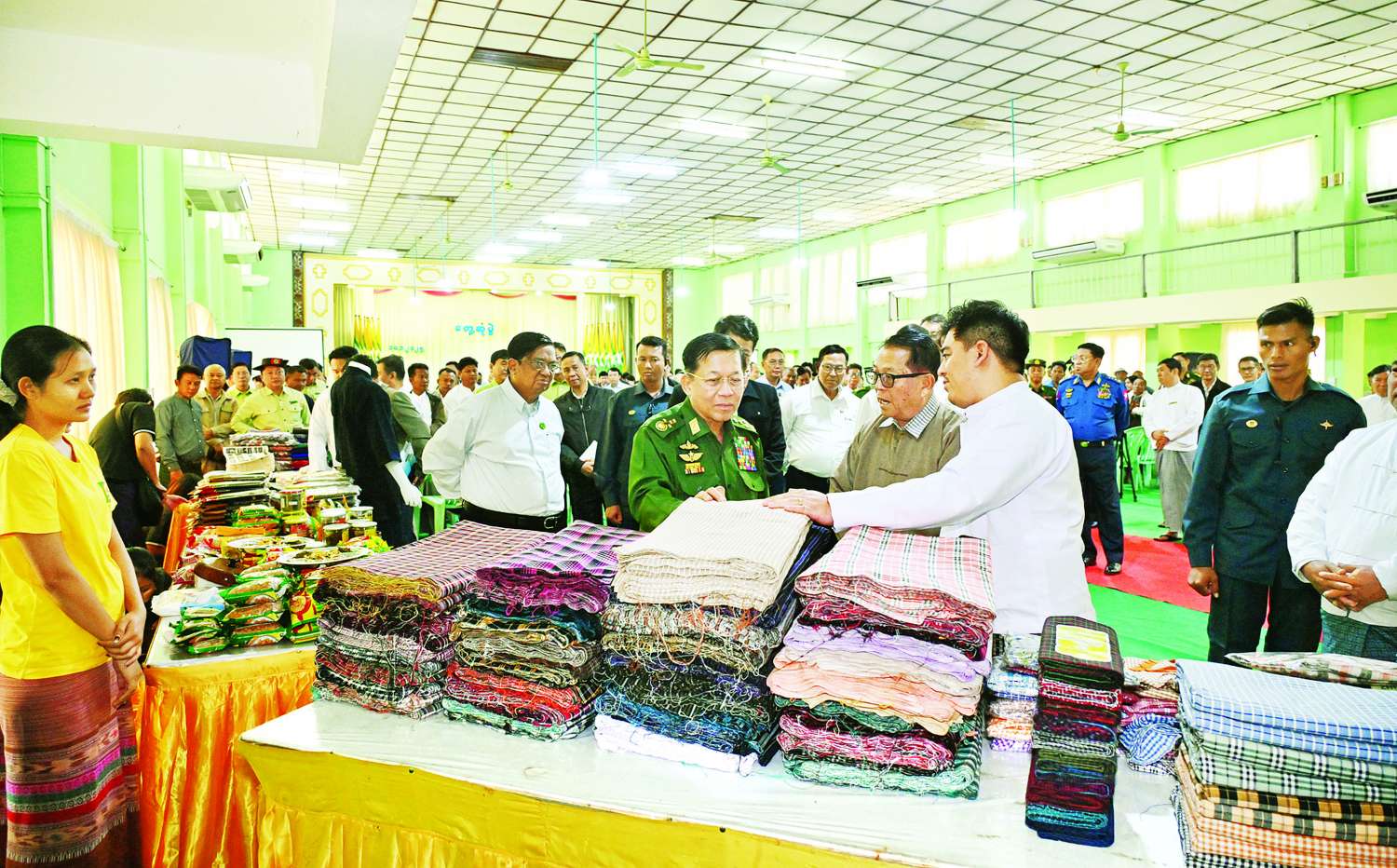 ယင်းနောက် နိုင်ငံတော်စီမံအုပ်ချုပ်ရေးကောင်စီဥက္ကဋ္ဌ နိုင်ငံတော်ဝန်ကြီးချုပ်သည် ခင်းကျင်းပြသထားသည့် ဒေသထွက်ကုန်ပစ္စည်းများ၊ စားသောက်ကုန်၊ လူသုံးကုန်၊ အဝတ်အထည်များနှင့် ဝါသီးနှံထုတ်ကုန်ပစ္စည်းများ ခင်းကျင်းပြသထားရှိမှုများကိုကြည့်ရှုခဲ့ပြီး ဈေးကွက်ရရှိမှုအခြေအနေများကို မေးမြန်းဆွေးနွေးရာ လုပ်ငန်းအလိုက် စီးပွားရေးလုပ်ငန်းရှင်များက လိုက်လံရှင်းလင်းတင်ပြခဲ့ကြောင်း သတင်းရရှိသည်။