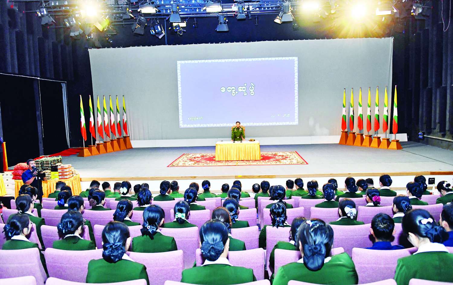 ယင်းနောက် နိုင်ငံတော်စီမံအုပ်ချုပ်ရေးကောင်စီဥက္ကဋ္ဌ တပ်မတော်ကာကွယ်ရေးဦးစီးချုပ်က လေ့ကျင့်ရေးဌာန၌ သင်တန်းကျောင်းမှ အရာရှိ၊ စစ်သည်၊ မိသားစုများနှင့် သင်တန်းသားများအား တွေ့ဆုံအမှာစကားပြောကြားရာ၌ လေ့ကျင့်ရေးပိုင်းဆိုင်ရာများနှင့် ပတ်သက်၍ ယနေ့ခေတ်တွင် စစ်လက်နက်နည်းပညာများ၊ စစ်နည်းဗျူဟာများသည် အဆက်မပြတ်တိုးတက်လျက်ရှိကြောင်း၊ “လေ့လာ၊ လေ့ကျင့်၊ လိုက်နာ” ဟူသည့်မူဝါဒအတိုင်း စဉ်ဆက်မပြတ်ပြောင်းလဲတိုးတက်နေသည့် စစ်အတတ်ပညာများကို အမြဲမပြတ်လေ့လာနေရမည်၊ သင်ယူထားရှိပြီးဖြစ်သည့် စစ်မှုရေးရာနည်းနာများနှင့် အတတ်ပညာများကို ပိုမိုကျွမ်းကျင်အောင် အမြဲလေ့ကျင့်နေရမည်၊ ချမှတ်ထားရှိသည့် စည်းမျဉ်းစည်းကမ်းများအတိုင်း အမြဲလိုက်နာကျင့်သုံးနေရမည်ဖြစ်ကြောင်း။