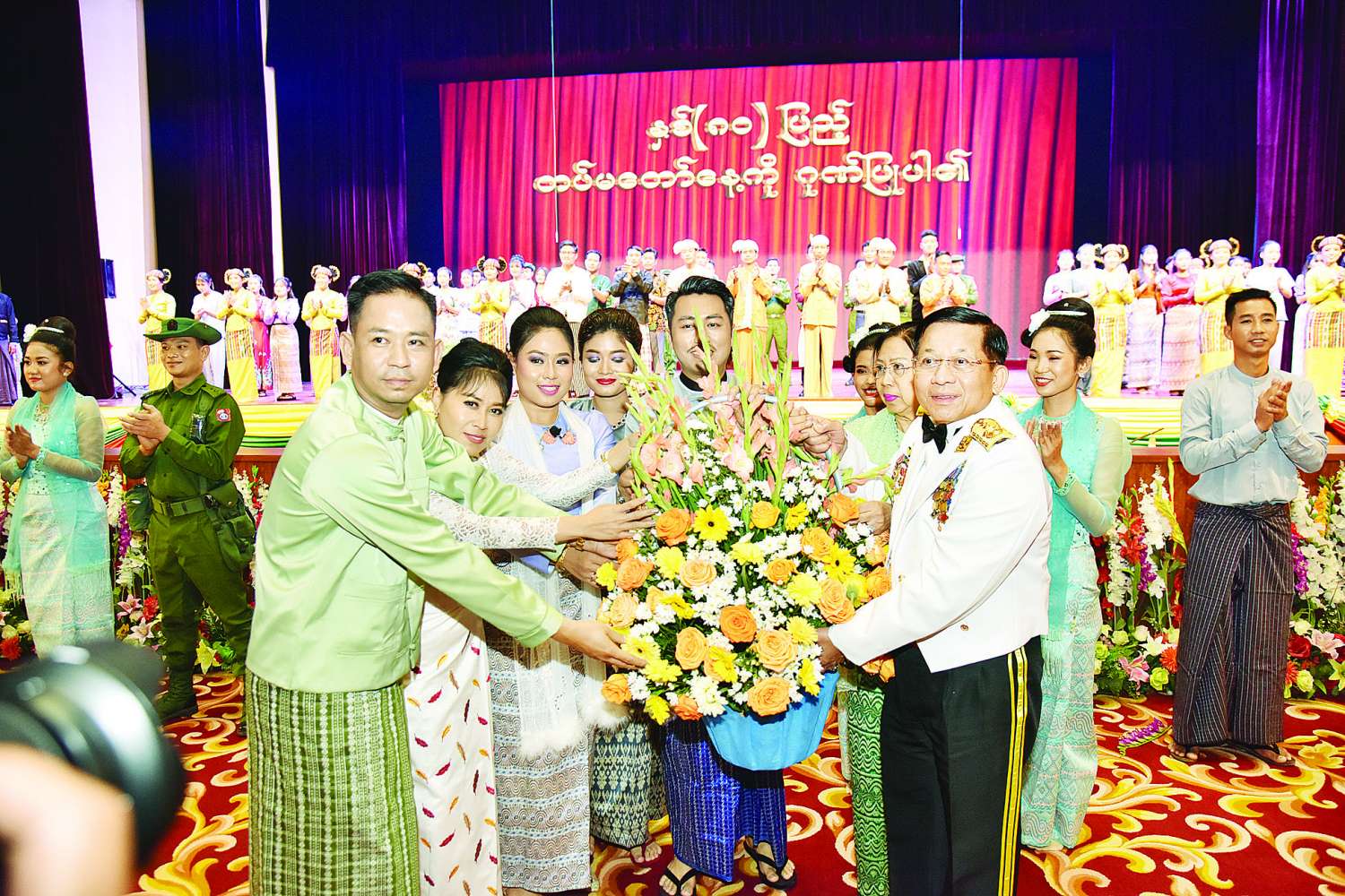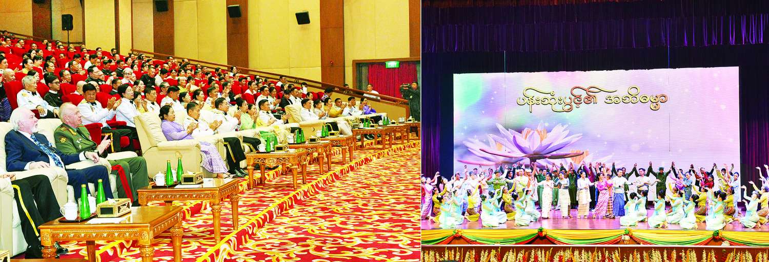 ဆက်လက်ပြီး နိုင်ငံတော်စီမံအုပ်ချုပ်ရေးကောင်စီဥက္ကဋ္ဌ တပ်မတော်ကာကွယ်ရေးဦးစီးချုပ် ဗိုလ်ချုပ်မှူးကြီး မင်းအောင်လှိုင်၊ ဇနီးဒေါ်ကြူကြူလှနှင့် အခမ်းအနား တက်ရောက်လာကြသူများသည် ဇေယျာသီရိဗိမာန်သဘင်ဆောင်အတွင်း၌ ပြည်သူ့ဆက်ဆံရေးနှင့် စိတ်ဓာတ်စစ်ဆင်ရေးညွှန်ကြားရေးမှူးရုံးကွပ်ကဲမှုအောက်ရှိ တပ်ဖွဲ့ဝင် စစ်သည်၊ စစ်သမီးများ၏ “ပန်းသုံးပွင့်၏ အဘိဓမ္မာ” ပြဇာတ် တင်ဆက်ဖျော်ဖြေမှုကို ကြည့်ရှုအားပေးခဲ့ကြသည်။