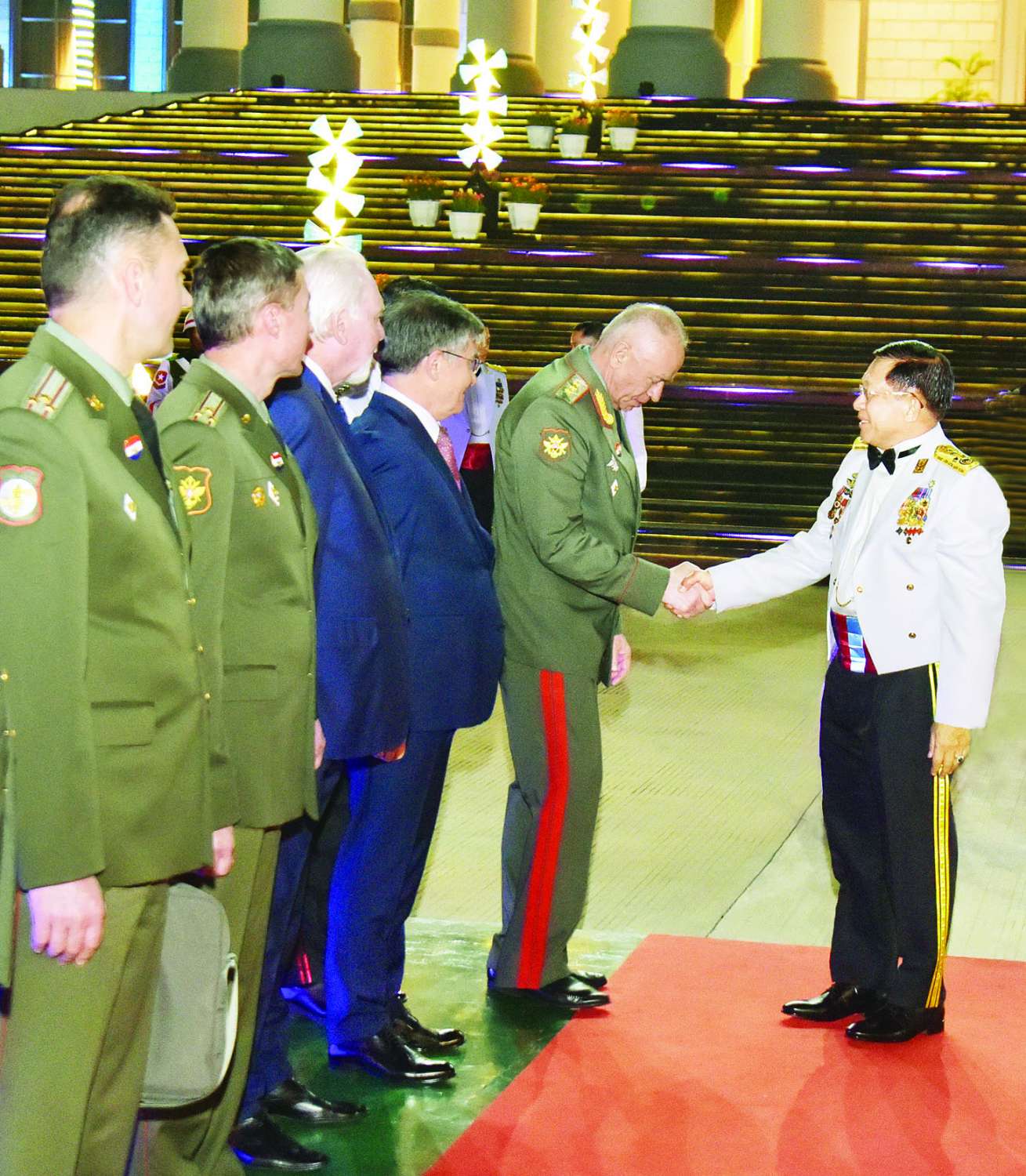 ထို့နောက် နိုင်ငံတော်စီမံအုပ်ချုပ်ရေးကောင်စီဥက္ကဋ္ဌ တပ်မတော်ကာကွယ်ရေးဦးစီးချုပ် ဗိုလ်ချုပ်မှူးကြီး မင်းအောင်လှိုင်နှင့်ဇနီး ဒေါ်ကြူကြူလှတို့သည် နှစ် (၈၀) ပြည့် တပ်မတော်နေ့အထိမ်းအမှတ် အကြိုဂုဏ်ပြုညစာစားပွဲသို့ တက်ရောက်လာကြသည့် ရုရှားဖက်ဒရေးရှင်းနိုင်ငံ ဒုတိယကာကွယ်ရေးဝန်ကြီး Colonel General Alexander Vasilyevich Fomin နှင့်အဖွဲ့ဝင်များ၊ နိုင်ငံတော်စီမံအုပ်ချုပ်ရေးကောင်စီဒုတိယဥက္ကဋ္ဌ ဒုတိယတပ်မတော်ကာကွယ်ရေးဦးစီးချုပ် ကာကွယ်ရေးဦးစီးချုပ် (ကြည်း) ဒုတိယဗိုလ်ချုပ်မှူးကြီး စိုးဝင်းနှင့်ဇနီး ဒေါ်သန်းသန်းနွယ်၊ ညှိနှိုင်းကွပ်ကဲရေးမှူး (ကြည်း၊ ရေ၊ လေ) ဗိုလ်ချုပ်ကြီး ကျော်စွာလင်းနှင့်ဇနီး၊ ကာကွယ်ရေးဦးစီးချုပ် (ရေ) ဗိုလ်ချုပ်ကြီး ထိန်ဝင်းနှင့်ဇနီး၊ ကာကွယ်ရေးဦးစီးချုပ် (လေ) ဗိုလ်ချုပ်ကြီး ထွန်းအောင်နှင့်ဇနီး၊ ကောင်စီအတွင်းရေးမှူးနှင့်ဇနီး၊ တွဲဖက်အတွင်းရေးမှူးနှင့်ဇနီး၊ ကောင်စီဝင်များနှင့်ဇနီးများ၊ ပြည်ထောင်စုအဆင့်ပုဂ္ဂိုလ်များ၊ ပြည်ထောင်စုဝန်ကြီးများနှင့်ဇနီးများ၊ ကာကွယ်ရေးဦးစီးချုပ်ရုံးမှ အဆင့်မြင့်တပ်မတော်အရာရှိကြီးများနှင့်ဇနီးများ၊ ရဲဘော်သုံးကျိပ်ဝင် မိသားစုဝင်များ၊ အငြိမ်းစားတပ်မတော်ကာကွယ်ရေးဦးစီးချုပ်များ၏ မိသားစုဝင်များ၊ အငြိမ်းစားတပ်မတော် (ကြည်း၊ ရေ၊ လေ) အရာရှိကြီးများ၊ လွတ်လပ်ရေးမော်ကွန်းဝင် ပထမဆင့်၊ ဒုတိယဆင့်နှင့် တတိယဆင့် မော်ကွန်းဝင်ပုဂ္ဂိုလ်များ၊ အကြံပေးပုဂ္ဂိုလ်များ၊ ဒုတိယဝန်ကြီးများ၊ တပ်မတော်သား အငြိမ်းစားသံအမတ်ကြီးများ၊ နေပြည်တော်ကောင်စီဝင်များ၊ နိုင်ငံခြားစစ်သံရုံးများမှ စစ်သံမှူးများနှင့် တာဝန်ရှိသူများ၊ တစ်နိုင်ငံလုံးပစ်ခတ်တိုက်ခိုက်မှုရပ်စဲရေးသဘောတူစာချုပ် (NCA) လက်မှတ်ရေးထိုးထားသည့် တိုင်းရင်းသားလက်နက်ကိုင်အဖွဲ့များမှ ကိုယ်စားလှယ်များ၊ နိုင်ငံရေးပါတီများမှဥက္ကဋ္ဌများနှင့် တာဝန်ရှိသူများ၊ အောင်ဆန်းသူရိယဘွဲ့ရရှိခဲ့သူများ၏ မိသားစုဝင်များနှင့် ဆွေမျိုးများ၊ သီဟသူရဘွဲ့၊ သူရဘွဲ့နှင့် တပ်မတော်စွမ်းရည် သတ္တိဆိုင်ရာ ဂုဏ်ထူးဆောင်ဘွဲ့၊ သူရဲကောင်းမှတ်တမ်းဝင် တံဆိပ်ရရှိခဲ့ကြသည့် အရာရှိ၊ စစ်သည်များနှင့် မိသားစုဝင်များ၊ ဆွေမျိုးများ၊ မြန်မာနိုင်ငံစစ်မှု ထမ်းဟောင်းအဖွဲ့ဝင်များ၊ အသွင်ပြောင်းပြည်သူ့စစ်၊ မူလပြည်သူ့စစ်နှင့် နယ်ခြားစောင့်ဗဟိုအကြံပေး ကွပ်ကဲရေးအဖွဲ့များ၊ မြန်မာနိုင်ငံရဲတပ်ဖွဲ့၊ မီးသတ်တပ်ဖွဲ့နှင့် မြန်မာနိုင်ငံကြက်ခြေနီတပ်ဖွဲ့တို့မှပုဂ္ဂိုလ်များ၊ ဝန်ကြီးဌာနအသီးသီးမှ တာဝန်ရှိသူများနှင့်ဝန်ထမ်းများ၊ ဝိုင်အမ်ဘီအေအသင်းကြီး၊ မြန်မာနိုင်ငံအမျိုးသမီးရေးရာအဖွဲ့ချုပ်၊ မြန်မာနိုင်င