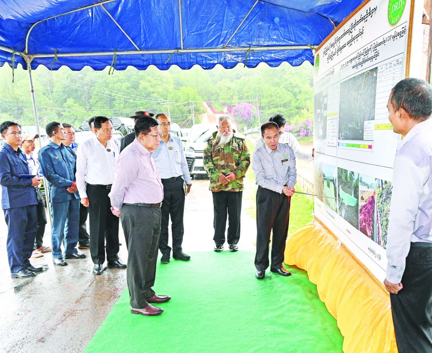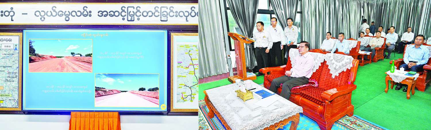 ဦးစွာ နိုင်ငံတော်စီမံအုပ်ချုပ်ရေးကောင်စီဥက္ကဋ္ဌ နိုင်ငံတော်ဝန်ကြီးချုပ်နှင့် အဖွဲ့ဝင်များသည် ဆောက်လုပ်ရေးဝန်ကြီးဌာန၊ လမ်းဦးစီးဌာန၊ ရှမ်းပြည်နယ် (အရှေ့ပိုင်း) မှ တာဝန်ယူဆောင်ရွက်လျက်ရှိသည့် ကျိုင်းတုံ-လွိုင်မွေလမ်း လမ်းအဆင့်မြှင့်တင်ခြင်းစီမံကိန်းသို့ ရောက်ရှိကြသည်။ ထို့နောက် စီမံကိန်းရှင်းလင်းဆောင်၌ တာဝန်ရှိသူများက စီမံကိန်းဆိုင်ရာအချက်အလက်များ၊ နိုင်ငံတော်စီမံအုပ်ချုပ်ရေးကောင်စီဥက္ကဋ္ဌ နိုင်ငံတော်ဝန်ကြီးချုပ်၏ ၂၀၂၂ ခုနှစ်၊ ဖေဖော်ဝါရီလအတွင်း လွိုင်မွေဒေသသို့ရောက်ရှိစဉ် ခရီးစဉ်လမ်းညွှန်ချက်များအား လိုက်နာဆောင်ရွက်ပြီးစီးမှု၊ ဘဏ္ဍာရေးနှစ်အလိုက် လုပ်ငန်းဆောင်ရွက်ခဲ့မှုနှင့် ဆက်လက်ဆောင်ရွက်သွားမည့်စီမံကိန်းလုပ်ငန်း လျာထားမှုတို့နှင့်ပတ်သက်၍ ရှင်းလင်းတင်ပြကြရာ နိုင်ငံတော်စီမံအုပ်ချုပ်ရေးကောင်စီဥက္ကဋ္ဌ နိုင်ငံတော်ဝန်ကြီးချုပ်က ကျိုင်းတုံ - လွိုင်မွေ လမ်းအဆင့်မြှင့်တင်ရာ၌ လမ်းကြောင်းရေရှည်တည်တံ့ကောင်းမွန်မှုရှိစေရေး စနစ်တကျ တွက်ချက်ဆောင်ရွက်သွားရန်နှင့် အခြားလိုအပ်သည်များကို မှာကြားသည်။
